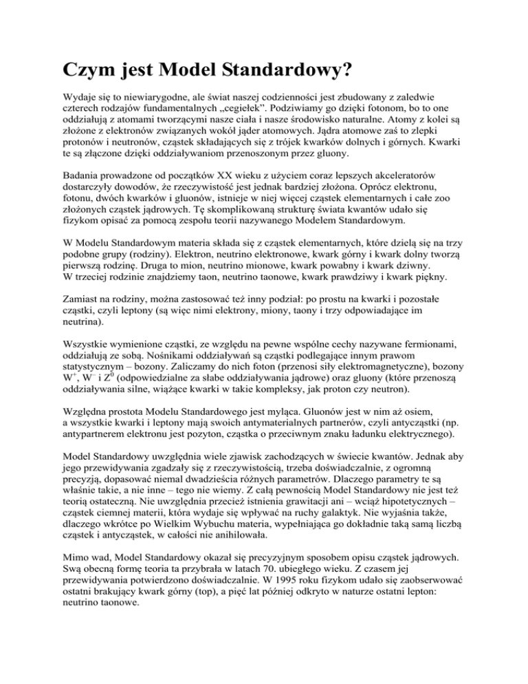 Czym jest Model Standardowy? Wydaje się to niewiarygodne, ale świat naszej codzienności jest zbudowany z zaledwie czterech rodzajów fundamentalnych „cegiełek”. Podziwiamy go dzięki fotonom, bo to one oddziałują z atomami tworzącymi nasze ciała i nasze środowisko naturalne. Atomy z kolei są złożone z elektronów związanych wokół jąder atomowych. Jądra atomowe zaś to zlepki protonów i neutronów, cząstek składających się z trójek kwarków dolnych i górnych. Kwarki te są złączone dzięki oddziaływaniom przenoszonym przez gluony. Badania prowadzone od początków XX wieku z użyciem coraz lepszych akceleratorów dostarczyły dowodów, że rzeczywistość jest jednak bardziej złożona. Oprócz elektronu, fotonu, dwóch kwarków i gluonów, istnieje w niej więcej cząstek elementarnych i całe zoo złożonych cząstek jądrowych. Tę skomplikowaną strukturę świata kwantów udało się fizykom opisać za pomocą zespołu teorii nazywanego Modelem Standardowym. W Modelu Standardowym materia składa się z cząstek elementarnych, które dzielą się na trzy podobne grupy (rodziny). Elektron, neutrino elektronowe, kwark górny i kwark dolny tworzą pierwszą rodzinę. Druga to mion, neutrino mionowe, kwark powabny i kwark dziwny. W trzeciej rodzinie znajdziemy taon, neutrino taonowe, kwark prawdziwy i kwark piękny. Zamiast na rodziny, można zastosować też inny podział: po prostu na kwarki i pozostałe cząstki, czyli leptony (są więc nimi elektrony, miony, taony i trzy odpowiadające im neutrina). Wszystkie wymienione cząstki, ze względu na pewne wspólne cechy nazywane fermionami, oddziałują ze sobą. Nośnikami oddziaływań są cząstki podlegające innym prawom statystycznym – bozony. Zaliczamy do nich foton (przenosi siły elektromagnetyczne), bozony W+, W– i Z0 (odpowiedzialne za słabe oddziaływania jądrowe) oraz gluony (które przenoszą oddziaływania silne, wiążące kwarki w takie kompleksy, jak proton czy neutron). Względna prostota Modelu Standardowego jest myląca. Gluonów jest w nim aż osiem, a wszystkie kwarki i leptony mają swoich antymaterialnych partnerów, czyli antycząstki (np. antypartnerem elektronu jest pozyton, cząstka o przeciwnym znaku ładunku elektrycznego). Model Standardowy uwzględnia wiele zjawisk zachodzących w świecie kwantów. Jednak aby jego przewidywania zgadzały się z rzeczywistością, trzeba doświadczalnie, z ogromną precyzją, dopasować niemal dwadzieścia różnych parametrów. Dlaczego parametry te są właśnie takie, a nie inne – tego nie wiemy. Z całą pewnością Model Standardowy nie jest też teorią ostateczną. Nie uwzględnia przecież istnienia grawitacji ani – wciąż hipotetycznych – cząstek ciemnej materii, która wydaje się wpływać na ruchy galaktyk. Nie wyjaśnia także, dlaczego wkrótce po Wielkim Wybuchu materia, wypełniająca go dokładnie taką samą liczbą cząstek i antycząstek, w całości nie anihilowała. Mimo wad, Model Standardowy okazał się precyzyjnym sposobem opisu cząstek jądrowych. Swą obecną formę teoria ta przybrała w latach 70. ubiegłego wieku. Z czasem jej przewidywania potwierdzono doświadczalnie. W 1995 roku fizykom udało się zaobserwować ostatni brakujący kwark górny (top), a pięć lat później odkryto w naturze ostatni lepton: neutrino taonowe. Dlaczego cząstka Higgs’a? Wczesne wersje Modelu Standardowego miały jeden fundamentalny mankament – występujące w nim cząstki elementarne musiały być pozbawione masy! Nawet codzienne obserwacje pozwalają stwierdzić, że nie może to być prawdą: obiekty wokół nas, zbudowane z cząstek jądrowych, z całą pewnością mają masę. Teoria w rażący sposób nie zgadzała się z rzeczywistością i należało z nią koniecznie coś zrobić. Na szczęście na początku lat 60. ubiegłego wieku kilku fizyków (Yoichiro Nimbu, a później Robert Brout i Francois Englert) zauważyło, że problemy mogą zniknąć, gdy w Modelu Standardowym uwzględni się obecność jeszcze jednego pola kwantowego. Pomysł został dopracowany przez brytyjskiego fizyka Petera Higgsa. Zaproponowane przez niego skalarne pole kwantowe miało bardzo specyficzne własności. Nie tylko musiało wypełniać cały Wszechświat, w tym próżnię, ale potencjał związany z tym polem nie mógł w próżni przyjmować wartości zero. Oznaczało to, że w każdym punkcie przestrzeni powinien istnieć pewien stały wkład do gęstości energii, pochodzący od pola Higgsa. Cząstki elementarne w Modelu Standardowym nabierają masy wskutek oddziaływania z polem Higgsa, które stawia im opór. Nowy mechanizm nie tylko tłumaczył pochodzenie masy, wyjaśniał również, dlaczego masę mają bozony W i Z, cząstki pośredniczące w przenoszeniu słabych oddziaływań jądrowych (pozostałe nośniki oddziaływań, fotony i gluony, nie mają masy). Skoro w Modelu Standardowym wzbudzenia pól kwantowych są obserwowane jako cząstki, z nowym polem musiała być związana pewna cząstka elementarna. Nazwano ją bozonem Higgsa lub, w skrócie, po prostu higgsem (inne określenie, boska cząstka, zostało mu nadane z wyrachowaniem, wyłącznie dla celów propagandowych). Charakterystyczną cechą bozonu Higgsa jest brak spinu, pewnej cechy kwantowej. Dotychczas wykryliśmy wiele cząstek jądrowych o spinie zerowym, lecz wszystkie były obiektami złożonymi (na przykład z par kwark-antykwark). Pozostał tylko „drobiazg”: należało tę cząstkę odkryć. Obserwacja bozonu Higgsa w akceleratorze LHC to potwierdzenie istnienia w przyrodzie pola Higgsa. Oznacza, że w księdze o tytule „Model Standardowy” fizycy właśnie ukończyli ostatni rozdział. Lecz wiemy już, że ten ostatni rozdział zapowiada nową, kto wie, czy nie bardziej fascynującą od dotychczasowej księgę. Kolejny tom, który fizycy całego świata dopiero zaczynają pisać. Znaczenie bozonu Higgsa i co dalej? Model Standardowy