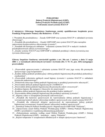 PORADNIKI Dobrej Praktyki Higienicznej (GHP), Dobrej Praktyki Produkcyjnej (GMP) i wdrażania zasad systemu HACCP Z inicjatywy Głównego Inspektora Sanitarnego zostały opublikowane bezpłatnie przez Fundację Programów Pomocy dla Rolnictwa - FAPA: 1.”Poradnik dla przedsiębiorcy – Zasady GHP/GMP oraz systemu HACCP w zakładach żywienia zbiorowego”, 2. „Poradnik dla przedsiębiorcy – Zasady GHP/GMP oraz system HACCP jako narzędzie zapewnienia bezpieczeństwa zdrowotnego żywności”, 3. „Poradnik dla kierujących zakładem – wdrażanie systemu HACCP w małych i średnich przedsiębiorstwach sektora żywnościowego”, 4. „Zasady systemy HACCP oraz GHP/GMP w zakładach produkcji i obrotu żywnością oraz żywienia zbiorowego”. Główny Inspektor Sanitarny zatwierdził zgodnie z art. 30a ust. 1 ustawy z dnia 11 maja 2001 r. o warunkach zdrowotnych żywności i żywienia (Dz. U Nr 31, poz. 265) następujące przewodniki: 1. „Przewodnik opracowywania i wdrażania systemu HACCP oraz jego oceny dla przemysłu spożywczego i jego kooperantów”, 2. „Kodeks dobrej praktyki produkcyjnej i dobrej praktyki higienicznej dla produkcji piekarskiej i ciastkarskiej”, 3. „Przewodnik wdrożenia ogólnych zasad higieny żywności i systemu HACCP w zakładach przemysłu makaronowego”, 4. „Wskazówki dotyczące dobrej praktyki higienicznej w produkcji przetworów mlecznych”, 5. „Przewodnik dobrych praktyk higienicznych CAOBISCO”, 6. „Przewodnik dobrej praktyki higienicznej dla przemysłu soków owocowych”. 7. „Kodeksu higieny dla margaryn i tłuszczów do smarowania”, 8. „Kodeksu dobrej praktyki higienicznej dla produkcji lodów jadalnych”, 9. „Przewodnika dobrej praktyki higienicznej dla produkcji mrożonej żywności”, 10. „Higieny cukru w europejskim przemyśle cukrowniczym”, 11. „Poradnik dla hurtowni spożywczych do wprowadzania dobrej praktyki higienicznej i wewnętrznej kontroli jakości zdrowotnej środków spożywczych oraz zasad systemu HACCP”, 12. „Poradnik dla właścicieli sklepów spożywczych do wprowadzania dobrej praktyki higienicznej wewnętrznej i kontroli jakości zdrowotnej środków spożywczych”, 13. „Instrukcje Dobrych Praktyk Produkcyjnych i Higienicznych GMP-GHP. Piekarnia”, 14. „Opracowania zasad Dobrej Praktyki Produkcyjnej (GMP) i Dobrej Praktyki Higienicznej (GHP) z przykładowo wypełnioną dokumentacją-piekarnia”, 15. „Dokumentacja sanitarna według zasad Dobrej Praktyki Produkcyjnej (GMP) i Dobrej Praktyki Higienicznej (GHP) – instrukcje – zapisy. Piekarnia”, 16. „Rejestr temperatur w urządzeniach chłodniczych w sklepie spożywczym i hurtowni”, 17. „Książka kontroli wewnętrznej w sklepie spożywczym i hurtowni – z wyjaśnieniami”, 18. „Rejestr środków spożywczych wycofanych z obrotu”, 19. „Rejestr konserwacji i napraw urządzeń i sprzętu chłodniczego”, 20. „Książka sanitarna środka transportu”, 21. „Księga reklamacji z wyjaśnieniami i przykładem”, 22. „Dobra Praktyka Higieniczna w sklepie spożywczym i hurtowni, wzorcowe instrukcje z wyjaśnieniami”, 23. „Uniwersalna lista kontrolna auditu wewnętrznego HACCP”, 24. „Dobra Praktyka Produkcyjna i Dobra Praktyka Higieniczna w gastronomii z elementami HACCP”, 25. „Poradnik dla zakładów żywienia zbiorowego do wprowadzania dobrej praktyki produkcyjnej (GMP), dobrej praktyki higienicznej (GHP), wewnętrznej kontroli, jakości zdrowotnej środków spożywczych oraz zasad systemu HACCP”, 26. „Poradnik wdrażania zasad GHP/GMP i systemu HACCP w zakładach żywienia zbiorowego i firmach cateringowych. Kuchnia serwuje system HACCP”, 27. „HACCP – program do samodzielnego wdrażania systemu bezpieczeństwa żywności z komentarzem praktycznym”, 28. „Poradnik dla właścicieli piekarń i cukierni do wprowadzania Dobrej Praktyki Produkcyjnej (GMP), Dobrej Praktyki Higienicznej (GHP) oraz zasad systemu HACCP”, 29. „Procedura ochrony przed szkodnikami w przemyśle spożywczym”, 30. „Poradnik wdrażania zasad systemu HACCP w Jednostkach Organizacyjnych Służby Więziennej”, 31. „Dobra Praktyka produkcyjna – GMP w produkcji żywności”, 32. „Praktyczny audit systemu HACCP”, 33. „Podstawy zapewnienia bezpieczeństwa żywności w systemie HACCP”, 34. „Poradnik opracowania zasad Dobrej Praktyki Produkcyjnej – HMP i Dobrej Praktyki Higienicznej – GHP z przykładowo wypełnioną dokumentacją. Wytwórnie żywności”, 35. „Kodeks Żywnościowy – Wytyczne Dobrej Praktyki Higienicznej”, 36. „HACCP System zapewnienia bezpieczeństwa i jakości zdrowotnej żywności”, 37. „Dokumentowanie systemu HACCP w przemyśle spożywczym”. Możliwe jest zastosowanie wprost wskazówek zawartych w ww. poradnikach do praktyki wprowadzania zasad systemu HACCP w danym zakładzie. Wszystkie przewodniki można uzyskać pod następującymi adresami: Tytuł „Zasady systemy HACCP oraz GHP/GMP w zakładach produkcji i obrotu żywnością oraz żywienia zbiorowego”. Kontakt Główny Inspektorat Sanitarny ul. Długa 38/40 00-238 Warszawa www.gis.gov.pl/pdf/dhzzipu/broszura.pdf ”Poradnik dla przedsiębiorcy – Zasady GHP/GMP oraz systemu HACCP w zakładach żywienia zbiorowego”, FAPA- Fundacja Programów Pomocy dla Rolnictwa ul. Wspólna 30 00-930 Warszawa www.fapa.com.pl „Poradnik dla przedsiębiorcy – Zasady GHP/GMP oraz system HACCP jako narzędzie zapewnienia bezpieczeństwa zdrowotnego żywności”, „Poradnik dla kierujących zakładem – wdrażanie systemu HACCP w małych i średnich przedsiębiorstwach sektora żywnościowego”. „Przewodnik wdrożenia ogólnych zasad higieny żywności i systemu HACCP w zakładach przemysłu makaronowego”, „Wskazówki dotyczące dobrej praktyki higienicznej w produkcji przetworów mlecznych”, Polska Federacja Producentów Żywności ul. Żurawia 22 00-515 Warszawa tel. 022 628-80-28 „Przewodnik dobrych prakt