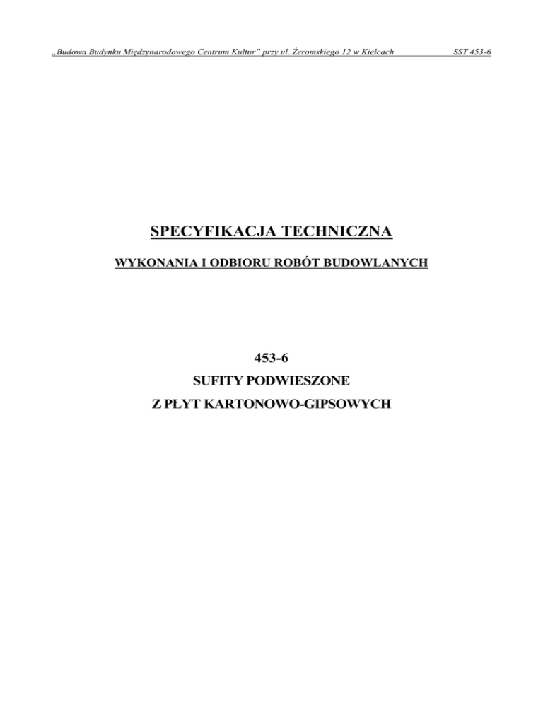 „Budowa Budynku Międzynarodowego Centrum Kultur” przy ul. śeromskiego 12 w Kielcach SPECYFIKACJA TECHNICZNA WYKONANIA I ODBIORU ROBÓT BUDOWLANYCH 453-6 SUFITY PODWIESZONE Z PŁYT KARTONOWO-GIPSOWYCH SST 453-6 „Budowa Budynku Międzynarodowego Centrum Kultur” przy ul. śeromskiego 12 w Kielcach SST 453-6 SPIS TREŚCI 1. WSTĘP........................................................................................................................................216 1.1. Przedmiot SST ......................................................................................................................216 1.2. Zakres stosowania SST .........................................................................................................216 1.3. Określenia podstawowe ........................................................................................................216 1.4. Zakres robót objętych SST....................................................................................................216 1.5. Ogólne wymagania dotyczące robót .....................................................................................216 2. MATERIAŁY.............................................................................................................................217 2.1. Wymagania ogólne ...............................................................................................................217 2.2. Materiały potrzebne do wykonania robót .............................................................................217 3. SPRZĘT ......................................................................................................................................218 3.1. Wymagania ogólne ...............................................................................................................218 3.2. Sprzęt do wykonywania robót...............................................................................................218 4. TRANSPORT .............................................................................................................................218 4.1. Wymagania ogólne ...............................................................................................................218 4.2. Transport materiałów ............................................................................................................218 4.3. Przechowywanie i składowanie materiałów .........................................................................218 5. WYKONANIE ROBÓT ............................................................................................................219 5.1. Wymagania ogólne ...............................................................................................................219 5.2. Warunki przystąpienia do robót............................................................................................219 5.3. MontaŜ okładzin z na rusztach stalowych na sufitach ..........................................................219 5.4. Szpachlowanie spoin.............................................................................................................221 6. KONTROLA JAKOŚCI ROBÓT ............................................................................................221 6.1. Wymagania ogólne ...............................................................................................................221 6.2. Badania w czasie wykonywania robót ..................................................................................221 7. OBMIAR ROBÓT .....................................................................................................................222 8. ODBIÓR ROBÓT ......................................................................................................................222 8.1. Ogólne zasady odbioru robót. ...............................................................................................222 8.2. Odbiór podłoŜy .....................................................................................................................222 8.3. Zgodność z dokumentacją.....................................................................................................222 8.4. Wymagania przy odbiorze ....................................................................................................222 9. PODSTAWA PŁATNOŚCI ......................................................................................................223 10. PRZEPISY ZWIĄZANE.........................................................................................................223 215 „Budowa Budynku Międzynarodowego Centrum Kultur” przy ul. śeromskiego 12 w Kielcach 453. SST 453-6 ROBOTY WYKOŃCZENIOWE 453-6 SUFITY PODWIESZONE Z PŁYT GIPSOWO-KARTONOWYCH 1. WSTĘP 1.1. Przedmiot SST Przedmiotem niniejszej szczegółowej specyfikacji technicznej są wymagania dotyczące wykonania i odbioru sufitów podwieszonych z płyt gipsowo-kartonowych w Budynku Międzynarodowego Centrum Kultur przy ul. śeromskiego 12 w Kielcach. Klasyfikacja wg Wspólnego Słownika Zamówień (CPV) Grupa Klasa Kategoria 45400000-1 Opis Roboty wykończeniowe budowlanych. 45420000-7 w zakresie obiektów Roboty w zakresie zakładania stolarki budowlanej oraz roboty ciesielskie 45421000-4 Roboty w zakresie stolarki budowlanej 45421146-9 Instalowanie sufitów podwieszanych 1.2. Zakres stosowania SST Szczegółowa specyfikacja techniczna jest stosowana jako dokument przetargowy i kontraktowy przy zlecaniu i realizacji robót wymienionych w pkt. 1.1. 1.3. Określenia podstawowe Określenia i nazewnictwo uŜyte w niniejszej specyfikacji technicznej ST są zgodne z obowiązującymi podanymi w normach PN i przepisach Prawa budowlanego. roboty budowlane przy wykonywaniu okładzin z płyt - wszystkie prace budowlane związane z wykonywaniem okładzin z płyt zgodnie z dokumentacją projektową, konstrukcja – uporządkowa