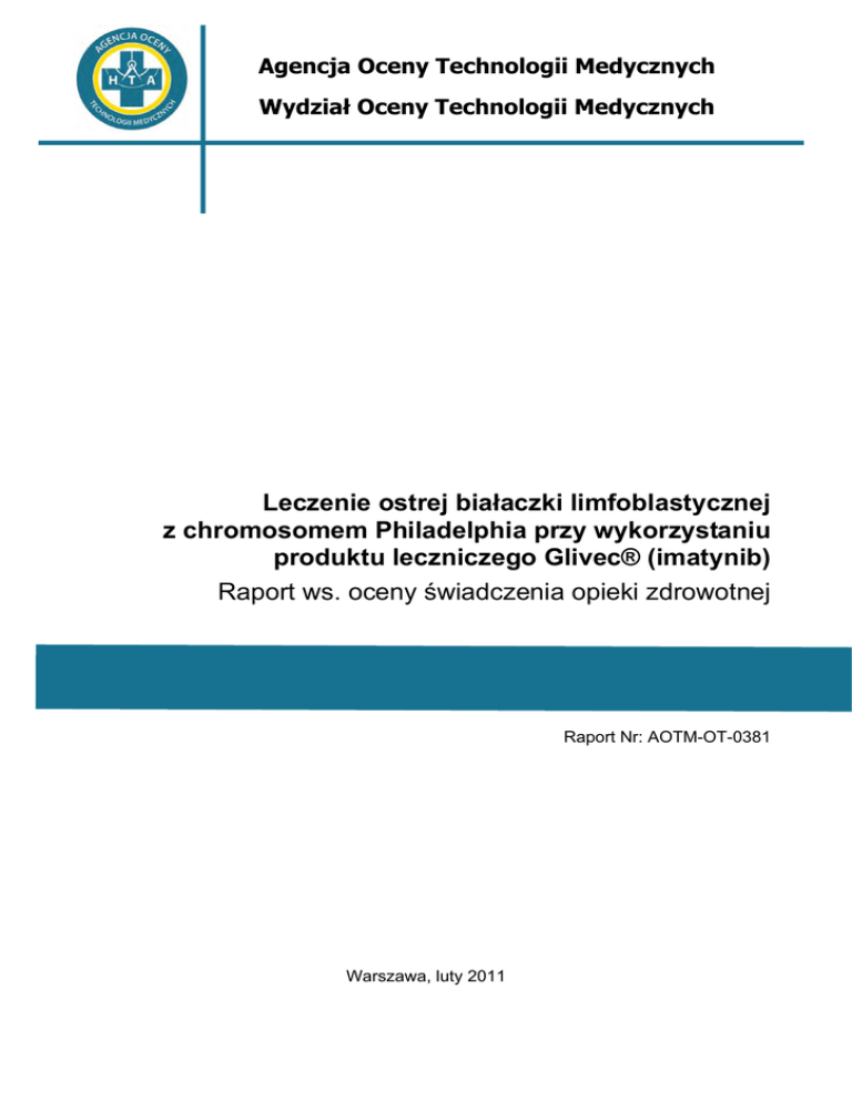 Agencja Oceny Technologii Medycznych Wydział Oceny Technologii Medycznych Leczenie ostrej białaczki limfoblastycznej z chromosomem Philadelphia przy wykorzystaniu produktu leczniczego Glivec® (imatynib) Raport ws. oceny świadczenia opieki zdrowotnej Raport Nr: AOTM-OT-0381 Warszawa, luty 2011 Leczenie ostrej białaczki limfoblastycznej z chromosomem Philadelphia przy wykorzystaniu produktu leczniczego Glivec® (imatynib) AOTM-OT-0381 W przygotowaniu raportu udział wzięli pracownicy Agencji Oceny Technologii Medycznych: Osoby uczestniczące w pracach nad raportem nie zadeklarowały żadnego konfliktu interesów. W raporcie wykorzystano opinie uzyskane od następujących ekspertów klinicznych, którzy na podstawie deklaracji konfliktu interesów zostali przez Dyrektora Wydziału Oceny Technologii Medycznych dopuszczeni do udziału w ocenie: Raport w sprawie oceny świadczenia opieki zdrowotnej 2/61 Leczenie ostrej białaczki limfoblastycznej z chromosomem Philadelphia przy wykorzystaniu produktu leczniczego Glivec® (imatynib) AOTM-OT-0381 Zastosowane skróty: ABL - gen kodujący białko cytoplazmatyczne i jądrowe z rodziny kinaz tyrozynowych ALL Ph+ - ang. acute lymphoblastic leukemia Philadelphia positive – ostra białaczka limfoblastyczna z chromosomem Philadelphia Ara-C – ang. cytosine arabinoside - arabinozyd cytozyny BCR-ABL - gen kodujący białko wykazujące nieprawidłową, zwiększoną aktywność kinazy tyrozynowej CEL - ang. chronic eosinophilic leukemia przewlekła białaczka eozynofilowa CMA – ang. cost minimalisation analysis – analiza minimalizacji kosztów CNS – ang. central nervous system – centralny układ nerwowy CR - ang. complete remission - całkowita remisja CTC- ang. common toxicity criteria - ogólne kryteria toksyczności, standaryzowana skala opisująca działania niepożądane po cytostatykach w stosowanych w chemioterapii. DDD – ang. defined daily dose - dzienna dawka dobowa DFSP – łac. dermatofibrosarcoma protuberans guzowaty włókniakomięsak skóry EFS - ang. event-free survival – przeżycie bez wystąpienia zdarzenia definiowane jako: czas od pierwszego dnia terapii do niepowodzenia indukcji, nawrotu, zgonu lub ostatniej wizyty (Yanada 2008) G-CSF - ang. granulocyte colony-stimulating factor - czynnik stymulujący tworzenie kolonii granulocytów GIST - ang. gastrointenstinal stromal tumors - nowotwory podścieliskowe przewodu pokarmowego GM-CSF - ang. granulocyte-macrophage colony-stimulating factor - czynnik stymulujący tworzenie kolonii granulocytów i makrofagów Gy - Grey – miara pochłonięcia energii promieniowania HES - ang. hypereosinophilic syndrome - zespół hipereozynofilowy HLA - ang. human leukocyte antygen - antygen zgodności tkankowej i.th. – ang. intrathecal – dooponowa droga podania leku i.v. – łac. intra venous – dożylna droga podania leku ICD-10 - ang. International Statistical Classification of Diseases and Related Health Problems 10th Revision Międzynarodowa Klasyfikacja Chorób i Problemów Zdrowotnych IMAT - imatynib JGP – jednorodne grupy pacjentów MDS/MPD - ang. myelodysplastic-myeloproliferative - zespoły mielodysplastyczno/mieloproliferacyjne MRD - ang. minimal residual disease – choroba resztkowa MTX - ang. metothrexat - metotreksat NFZ- Narodowy Fundusz Zdrowia OR - ang. odds ratio – iloraz szans OS - ang. overall survival - przeżycie całkowite p.o. - łac. per os - doustna droga podania leku PALG – Polska Grupa ds. Leczenia Białaczek u Dorosłych Raport w sprawie oceny świadczenia opieki zdrowotnej 3/61 Leczenie ostrej białaczki limfoblastycznej z chromosomem Philadelphia przy wykorzystaniu produktu leczniczego Glivec® (imatynib) AOTM-OT-0381 PCR - ang. polymerase chain reaction - reakcja łańcuchowa polimerazy PDGFR -ang. platelet-derived growth factor receptor- receptor płytkopochodnego czynnika wzrostu PFS - ang. progression-free survival – przeżycie bez progresji definiowane jako czas od momentu rozpoczęcia leczenia do stwierdzenia nawrotu po stwierdzeniu początkowej odpowiedzi na leczenie lub jako czas do zakończenia leczenia z powodu niesatysfakcjonujących odpowiedzi na terapię, działań niepożądanych lub zgonu pacjenta z jakiegokolwiek powodu (Ottmann 2002) RFS - ang. relapse-free survival – przeżycie bez nawrotu definiowano jako czas od stwierdzenia CR do nawrotu, zgonu lub do ostatniej wizyty Rozporządzenie – Rozporządzenie Ministra Zdrowia z dnia 22 grudnia 2009 r. w sprawie przygotowania raportu w sprawie oceny świadczenia opieki zdrowotnej i oceny raportu w sprawie oceny leku lub wyrobu medycznego (DZ.U. z 2009 r. nr 222 poz. 1773) Ustawa – Ustawa o zmianie ustawy o świadczeniach opieki zdrowotnej finansowanych ze środków publicznych oraz ustawy o cenach (Dz.U. z 2009 r. nr 118 poz. 989) z późn. zm. WBC - ang. white blood cell count – liczba leukocytów WLR – wykaz leków refundowanych Wytyczne – „Wytyczne oceny technologii medycznych” wprowadzone Zarządzeniem Prezesa AOTM nr 1/2010 z 4.01.2010 r., stanowiące podsumowanie uznawanych przez społeczność międzynarodową wymagań dotyczących przeprowadzania oceny świadczeń opieki zdrowotnej Raport w sprawie oceny świadczenia opieki zdrowotnej 4/61 Leczenie ostrej białaczki limfoblastycznej z chromosomem Philadelphia przy wykorzystaniu produktu leczniczego Glivec® (imatynib) AOTM-OT-0381 Spis treści Leczenie ostrej białaczki limfoblastycznej z chromosomem Philadelphia przy wykorzystaniu produktu leczniczego Glivec® (imatynib) ............................................................................................................................... 1 1. Podstawowe informacje o wniosku ............................................................................................................................ 7 2. Problem decyzyjny .................................................................................................................................