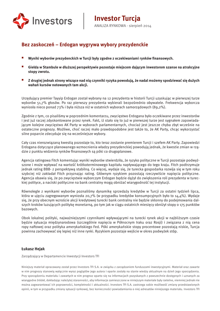 Investor Turcja ANALIZA RYNKOWA - sierpień 2014 Bez zaskoczeń – Erdogan wygrywa wybory prezydenckie ▪▪ ▪▪ ▪▪ Wyniki wyborów prezydenckich w Turcji były zgodne z oczekiwaniami rynków finansowych. Giełda w Stambule w dłuższej perspektywie pozostaje miejscem dającym inwestorom szanse na atrakcyjne stopy zwrotu. Z drugiej jednak strony wiszące nad nią czynniki ryzyka powodują, że nadal możemy spodziewać się dużych wahań kursów notowanych tam akcji. Urzędujący premier Tayyip Erdogan został wybrany na 12 prezydenta w historii Turcji uzyskując w pierwszej turze wyborów 51,7% głosów. Po raz pierwszy prezydenta wybierali bezpośrednio obywatele. Frekwencja wyborcza wyniosła nieco ponad 73% i była niższa niż w ostatnich wyborach samorządowych (89,2%). Zgodnie z tym, co pisaliśmy w poprzednim komentarzu, zwycięstwo Erdogana było oczekiwane przez inwestorów i jest już raczej zdyskontowane przez rynek. Fakt, iż stało się to już w pierwszej turze jest sygnałem zapowiadającym kolejne zwycięstwo AK Party w wyborach parlamentarnych, chociaż jest jeszcze chyba zbyt wcześnie na ostateczne prognozy. Możliwe, choć raczej mało prawdopodobne jest także to, że AK Party, chcąc wykorzystać silne poparcie zdecyduje się na wcześniejsze wybory. Cały czas nierozwiązaną kwestią pozostaje to, kto teraz zostanie premierem Turcji i szefem AK Party. Zapowiedzi Erdogana dotyczące planowanego wzmocnienia władzy prezydenckiej powodują jednak, że kwestie zmian w rządzie z punktu widzenia rynków finansowych są póki co drugoplanowe. Agencja ratingowa Fitch komentując wyniki wyborów stwierdziła, że ryzyko polityczne w Turcji pozostaje podwyższone i może wpływać na wartość krótkoterminowego kapitału napływającego do tego kraju. Fitch podtrzymuje jednak rating BBB- z perspektywą stabilną. Co więcej, wydaje się, że turecka gospodarka rozwija się w tym roku szybciej niż zakładał Fitch przyznając rating. Głównym ryzykiem pozostają rzeczywiście napięcia polityczne. Agencja obawia się, że po zwycięstwie wyborczym Erdogan będzie dążył do zwiększenia roli prezydenta w tureckiej polityce, a naciski polityczne na bank centralny mogą obniżać wiarygodność tej instytucji. Równolegle z wynikami wyborów poznaliśmy dynamikę sprzedaży kredytów w Turcji za ostatni tydzień lipca, która w ujęciu zagregowanym wyniosła 20,7% (w przypadku kredytów konsumpcyjnych było to 14,4%). Wydaje się, że przy obecnym wzroście akcji kredytowej turecki bank centralny nie będzie skłonny do podejmowania dalszych kroków luzujących politykę monetarną, po tym jak w ciągu ostatnich miesięcy obniżył stopy o 175 punktów bazowych. Obok lokalnej polityki, najważniejszymi czynnikami wpływającymi na turecki rynek akcji w najbliższym czasie będzie sytuacja międzynarodowa (szczególnie napięcia w Północnym Iraku oraz Rosji) i związana z nią cena ropy naftowej oraz polityka amerykańskiego Fed. Póki amerykańskie stopy procentowe pozostają niskie, Turcja powinna zachowywać się lepiej niż inne rynki. Ryzykiem pozostaje wejście w okres podwyżek stóp. Łukasz Hejak Zarządzający w Departamencie Inwestycji Investors TFI Niniejszy materiał opracowany został przez Investors TFI S.A. w związku z zarządzaniem funduszami inwestycyjnymi. Materiał oraz zawarte w nim prognozy stanowią wyłącznie wyraz poglądów jego autora i oparte zostały na stanie wiedzy aktualnym na dzień jego sporządzenia. Przy sporządzeniu materiału i zawartych w nim prognoz oparto się na informacjach pozyskanych z powszechnie dostępnych i uznanych za wiarygodne źródeł, dokładając należytej staranności, aby informacje zamieszczone w niniejszym materiale były rzetelne, niemniej jednak nie można zagwarantować ich poprawności, kompletności i aktualności. Investors TFI S.A. zastrzega sobie możliwość zmiany przedstawionych opinii, w tym w przypadku zmiany sytuacji rynkowej, bez konieczności powiadamiania o niej adresatów niniejszego materiału. Investors TFI Investor Turcja ANALIZA RYNKOWA - sierpień 2014 S.A. nie gwarantuje ziszczenia się scenariuszy lub prognoz zamieszczonych w niniejszym materiale, w szczególności przedstawione informacje (historyczne i prognozowane) nie stanowią gwarancji osiągnięcia podobnych wyników w przyszłości. Materiał niniejszy nie stanowi oferty publicznej ani publicznego oferowania w zakresie nabycia lub sprzedaży jakichkolwiek papierów wartościowych ani oferty w rozumieniu przepisów ustawy z dnia 23 kwietnia 1964 r. – Kodeks cywilny. Wnioski wyciągnięte na podstawie przedstawionych komentarzy i prognoz nie powinny stanowić samodzielnej podstawy jakichkolwiek decyzji inwestycyjnych. Niniejszy materiał ma charakter wyłącznie informacyjny i marketingowy oraz nie zawiera pełnych informacji niezbędnych do oceny ryzyka związanego z inwestycją w papiery wartościowe oraz inne instrumenty finansowe. Decyzje inwestycyjne co do inwestowania w fundusze inwestycyjne powinny być podejmowane w oparciu o informacje obejmujące w szczególności: opis czynników ryzyka, zasady sprzedaży jednostek uczestnictwa/certyfikatów inwestycyjnych funduszy, tabelę opłat manipulacyjnych oraz szczegółowe informacje podatkowe zawarte w prospekcie informacyjnym funduszu/y, dostępnych w punktach dystrybucji funduszy, w siedzibie Investors TFI S.A. oraz na stronie www.investors.pl. Podejmowanie decyzji inwestycyjnych wyłącznie w oparciu o informacje zamieszczone na stronach wskazanego portalu internetowego lub wyłącznie na podstawie innych materiałów reklamowych Investors TFI S.A., następuje na ryzyko Klienta. Zaleca się również zapoznanie z najbardziej aktualnym zaudytowanym rocznym lub półrocznym sprawozdaniem finansowym danego funduszu. Dotychczasowe wyniki funduszy inwestycyjnych nie stanowią gwarancji osiągnięcia podobnych wyników w przyszłości. Investors TFI S.A. ani zarz