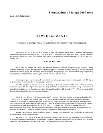 Sieradz, dnia 19 lutego 2007 roku Znak : RG.7624/4/2007 OBWIESZCZENIE o wszczęciu postępowania i wystąpieniu do organów współdziałających Zgodnie z art. 49 i art. 61 § 4 ustawy z dnia 14 czerwca 1960 roku – Kodeks postępowania administracyjnego (tekst jednolity Dz. U. Nr 98 z dnia 17 listopada 2000 roku, poz. 1071, z późn. zm) oraz art. 46a ust. 5 ustawy z dnia 27 kwietnia 2001 roku, Prawo ochrony środowiska (Dz. U. Nr 62, poz. 627 z późn. zm.), z a w i a d a m i a m, że w dniu 19 lutego 2007 roku, na wniosek Referatu Rozwoju Gospodarczego, Urzędu Gminy Sieradz, wszczęte zostało postępowanie administracyjne w sprawie wydania decyzji o środowiskowych uwarunkowaniach zgody na realizację przedsięwzięcia polegającego na : przebudowie drogi dojazdowej wewnętrznej w miejscowości Kłocko, gm. Sieradz (nr ewid. działki 664). Informuje więc o uprawnieniach wszystkich stron tego postępowania wynikających z art. 10 K.p.a. tj. do czynnego w nim udziału, w każdym jego stadium. Ponadto zgodnie z art. 32 ust.1 pkt 1 ustawy z dnia 27 kwietnia 2001 roku - Prawo ochrony środowiska (Dz. U. Nr 62 poz. 627 z późn. zm.) informuję o możliwości składania uwag i wniosków w siedzibie Urzędu Gminy w Sieradzu przy ulicy Warckiej 8, pokój nr 12, w godz. 730 – 1530, w terminie do 21 dni, od dnia ogłoszenia niniejszego obwieszczenia. Zgodnie z art. 48 ust. 2 pkt 1 ustawy z dnia 27 kwietnia 2001 roku, Prawo ochrony środowiska (Dz. U. Nr 62 poz. 627 z późn. zm) oraz § 3 ust. 1 pkt 56 rozporządzenia Rady Ministrów z dnia 09 listopada 2004 roku, w sprawie określenia rodzajów przedsięwzięć mogących znacząco oddziaływać na środowisko oraz szczegółowych uwarunkowań związanych z kwalifikowaniem przedsięwzięcia do sporządzenia raportu o oddziaływaniu na środowisko (Dz. U. Nr 257, poz. 2573 z późn. zm.) decyzję o środowiskowych uwarunkowaniach zgody na realizację przedsięwzięcia w niniejszej sprawie wydaje się po uzgodnieniu ze Starostą Sieradzkim i Państwowym Powiatowym Inspektorem Sanitarnym w Sieradzu. Wobec powyższego rozstrzygnięcie sprawy nastąpi niezwłocznie po uzyskaniu wymaganych uzgodnień oraz opinii pomocniczych. Zgodnie z art. 35 § 5 K.p.a. do terminów sprawy nie wlicza się terminów przewidzianych w przepisach prawa dla dokonania określonych czynności, okresów zawieszenia postępowania oraz okresów opóźnień, spowodowanych z winy strony albo z przyczyn niezależnych od organu. Stosownie do art. 41 § 1 K.p.a. w toku postępowania strony oraz ich przedstawiciele i pełnomocnicy mają obowiązek zawiadomić organ administracji publicznej o każdej zmianie swojego adresu, a zgodnie z § 2 w razie zaniedbania obowiązku określonego w § 1 doręczenie pisma pod dotychczasowym adresem ma skutek prawny. Otrzymują : 1. Starostwo Powiatowe w Sieradzu Plac Wojewódzki 3, 98-200 Sieradz 2. WÓJT Jarosław Kaźmierczak Pan Tadeusz Jasek Sołtys Wsi Kłocko zam. Kłocko 40, 98-200 Sieradz 3. a/a Podano do publicznej wiadomości poprzez : 1. Umieszczenie na tablicy ogłoszeń w Starostwie Powiatowym w Sieradzu 2. Umieszczenie na tablicy ogłoszeń Sołectwa Wsi Kłocko 3. Umieszczenie na tablicy ogłoszeń Urzędu Gminy Sieradz oraz w Biuletynie Informacji Publicznej na stronie internetowej www.ugsieradz.com.pl