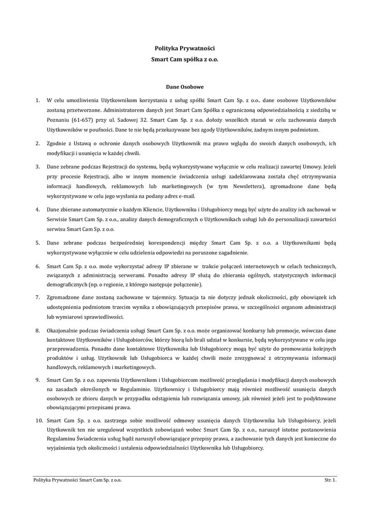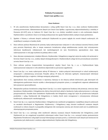 Polityka Prywatności Smart Cam spółka z o.o. Dane Osobowe 1. W celu umożliwienia Użytkownikom korzystania z usług spółki Smart Cam Sp. z o.o.. dane osobowe Użytkowników zostaną przetworzone. Administratorem danych jest Smart Cam Spółka z ograniczoną odpowiedzialnością z siedzibą w Poznaniu (61-657) przy ul. Sadowej 32. Smart Cam Sp. z o.o. dołoży wszelkich starań w celu zachowania danych Użytkowników w poufności. Dane te nie będą przekazywane bez zgody Użytkowników, żadnym innym podmiotom. 2. Zgodnie z Ustawą o ochronie danych osobowych Użytkownik ma prawo wglądu do swoich danych osobowych, ich modyfikacji i usunięcia w każdej chwili. 3. Dane zebrane podczas Rejestracji do systemu, będą wykorzystywane wyłącznie w celu realizacji zawartej Umowy. Jeżeli przy procesie Rejestracji, albo w innym momencie świadczenia usługi zadeklarowana została chęć otrzymywania informacji handlowych, reklamowych lub marketingowych (w tym Newslettera), zgromadzone dane będą wykorzystywane w celu jego wysłania na podany adres e-mail. 4. Dane zbierane automatycznie o każdym Kliencie, Użytkowniku i Usługobiorcy mogą być użyte do analizy ich zachowań w Serwisie Smart Cam Sp. z o.o., analizy danych demograficznych o Użytkownikach usługi lub do personalizacji zawartości serwisu Smart Cam Sp. z o.o. 5. Dane zebrane podczas bezpośredniej korespondencji między Smart Cam Sp. z o.o. a Użytkownikami będą wykorzystywane wyłącznie w celu udzielenia odpowiedzi na poruszone zagadnienie. 6. Smart Cam Sp. z o.o. może wykorzystać adresy IP zbierane w trakcie połączeń internetowych w celach technicznych, związanych z administracją serwerami. Ponadto adresy IP służą do zbierania ogólnych, statystycznych informacji demograficznych (np. o regionie, z którego następuje połączenie). 7. Zgromadzone dane zostaną zachowane w tajemnicy. Sytuacja ta nie dotyczy jednak okoliczności, gdy obowiązek ich udostępnienia podmiotom trzecim wynika z obowiązujących przepisów prawa, w szczególności organom administracji lub wymiarowi sprawiedliwości. 8. Okazjonalnie podczas świadczenia usługi Smart Cam Sp. z o.o. może organizować konkursy lub promocje, wówczas dane kontaktowe Użytkowników i Usługobiorców, którzy biorą lub brali udział w konkursie, będą wykorzystywane w celu jego przeprowadzenia. Ponadto dane kontaktowe Użytkownika lub Usługobiorcy mogą być użyte do promowania kolejnych produktów i usług. Użytkownik lub Usługobiorca w każdej chwili może zrezygnować z otrzymywania informacji handlowych, reklamowych i marketingowych. 9. Smart Cam Sp. z o.o. zapewnia Użytkownikom i Usługobiorcom możliwość przeglądania i modyfikacji danych osobowych na zasadach określonych w Regulaminie. Użytkownicy i Usługobiorcy mają również możliwość usunięcia danych osobowych ze zbioru danych w przypadku odstąpienia lub rozwiązania umowy, jak również jeżeli jest to podyktowane obowiązującymi przepisami prawa. 10. Smart Cam Sp. z o.o. zastrzega sobie możliwość odmowy usunięcia danych Użytkownika lub Usługobiorcy, jeżeli Użytkownik ten nie uregulował wszystkich zobowiązań wobec Smart Cam Sp. z o.o., naruszył istotne postanowienia Regulaminu Świadczenia usług bądź naruszył obowiązujące przepisy prawa, a zachowanie tych danych jest konieczne do wyjaśnienia tych okoliczności i ustalenia odpowiedzialności Użytkownika lub Usługobiorcy. Polityka Prywatności Smart Cam Sp. z o.o. Str. 1. Zmiana Danych 1. W przypadku gdy dane osobowe Użytkownika lub Usługobiorcy, użyte przy rejestracji ulegną zmianie lub są niepełne, istnieje możliwość wprowadzenia ich modyfikacji. W tym celu należy wprowadzić zmiany w Panelu Użytkownika lub skontaktować się ze Smart Cam Sp. z o.o. 2. Dane zbierane automatycznie nie podlegają zmianie lub usunięciu. Wykorzystywanie plików cookies 1. Serwis firmy Smart Cam Sp. z o.o. może wykorzystywać pliki cookies, które służą do identyfikacji przeglądarki internetowej podczas korzystania ze świadczonej usługi. Pliki te nie zawierają żadnych danych osobowych. 2. Cookies to informacje tekstowe, wysyłane przez serwis WWW i zapisywane po stronie Użytkownika i Usługobiorcy (zazwyczaj na twardym dysku komputera), mające na celu umożliwienie Smart Cam Sp. z o.o. podnoszenie jakości usług oraz zwiększanie zadowolenia Użytkowników i Usługobiorców dzięki przechowywania ich preferencji poruszania się po Serwisie. Bezpieczeństwo zgromadzonych danych osobowych 1. Wszelkie dane zgromadzone przez firmę Smart Cam sp. z o.o. są przechowywane na serwerach i zabezpieczone przed ich nieautoryzowanym użyciem zgodnie z wysokim poziomem bezpieczeństwa określonym w rozporządzeniu ministra spraw wewnętrznych i administracji z dnia 29 kwietnia 2004 r. w sprawie dokumentacji przetwarzania danych osobowych oraz warunków technicznych i organizacyjnych, jakim powinny odpowiadać urządzenia i systemy informatyczne służące do przetwarzania danych osobowych. 2. Połączenie między użytkownikiem a serwisem firmy Smart Cam Sp. z o.o. jest szyfrowane z użyciem protokołu SSL Zmiany w Polityce Prywatności Firma Smart Cam Sp. z o.o. zastrzega sobie prawo zmiany powyższej polityki prywatności poprzez opublikowanie nowej Polityki Prywatności na stronie internetowej. Kontakt 1. Firma zbierająca dane: Smart Cam Sp. z o.o. ul. Sadowa 32, 61-657 Poznań, Polska. 2. W razie dodatkowych pytań dotyczących ochrony prywatności, prosimy o kontakt korzystając z formularza kontaktowego na stronie kontaktowej. Polityka Prywatności Smart Cam Sp. z o.o. Str. 2.