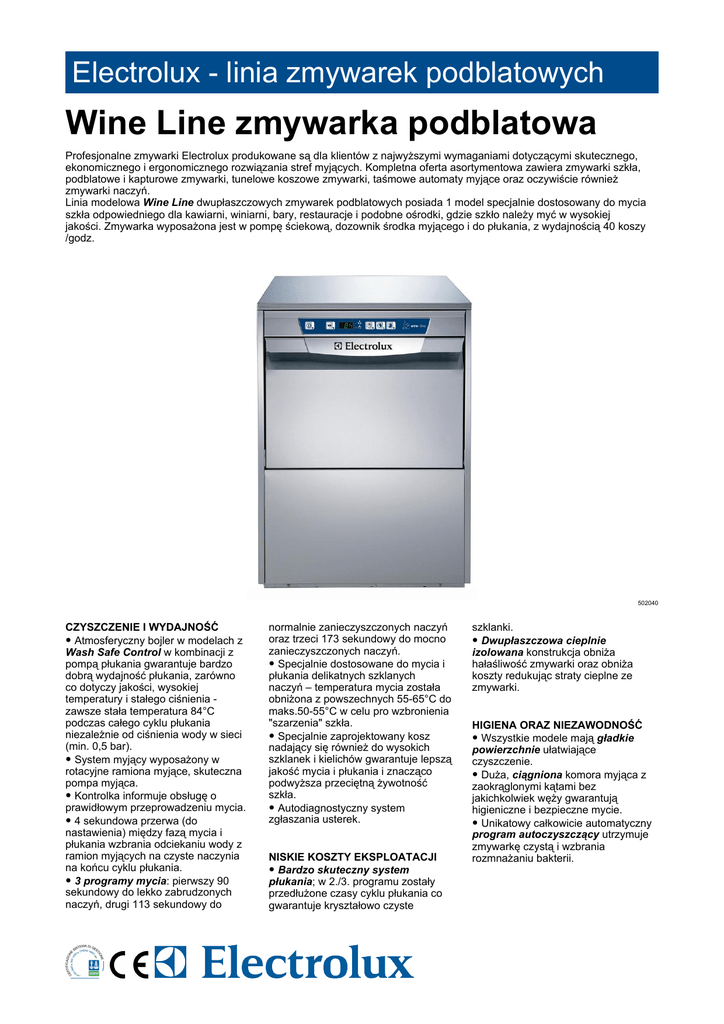 Electrolux - linia zmywarek podblatowych Wine Line zmywarka podblatowa Profesjonalne zmywarki Electrolux produkowane są dla klientów z najwyższymi wymaganiami dotyczącymi skutecznego, ekonomicznego i ergonomicznego rozwiązania stref myjących. Kompletna oferta asortymentowa zawiera zmywarki szkła, podblatowe i kapturowe zmywarki, tunelowe koszowe zmywarki, taśmowe automaty myjące oraz oczywiście również zmywarki naczyń. Linia modelowa Wine Line dwupłaszczowych zmywarek podblatowych posiada 1 model specjalnie dostosowany do mycia szkła odpowiedniego dla kawiarni, winiarni, bary, restauracje i podobne ośrodki, gdzie szkło należy myć w wysokiej jakości. Zmywarka wyposażona jest w pompę ściekową, dozownik środka myjącego i do płukania, z wydajnością 40 koszy /godz. 502040 CZYSZCZENIE I WYDAJNOŚĆ • Atmosferyczny bojler w modelach z Wash Safe Control w kombinacji z pompą płukania gwarantuje bardzo dobrą wydajność płukania, zarówno co dotyczy jakości, wysokiej temperatury i stałego ciśnienia zawsze stała temperatura 84°C podczas całego cyklu płukania niezależnie od ciśnienia wody w sieci (min. 0,5 bar). • System myjący wyposażony w rotacyjne ramiona myjące, skuteczna pompa myjąca. • Kontrolka informuje obsługę o prawidłowym przeprowadzeniu mycia. • 4 sekundowa przerwa (do nastawienia) między fazą mycia i płukania wzbrania odciekaniu wody z ramion myjących na czyste naczynia na końcu cyklu płukania. • 3 programy mycia: pierwszy 90 sekundowy do lekko zabrudzonych naczyń, drugi 113 sekundowy do normalnie zanieczyszczonych naczyń oraz trzeci 173 sekundowy do mocno zanieczyszczonych naczyń. • Specjalnie dostosowane do mycia i płukania delikatnych szklanych naczyń – temperatura mycia została obniżona z powszechnych 55-65°C do maks.50-55°C w celu pro wzbronienia "szarzenia" szkła. • Specjalnie zaprojektowany kosz nadający się również do wysokich szklanek i kielichów gwarantuje lepszą jakość mycia i płukania i znacząco podwyższa przeciętną żywotność szkła. • Autodiagnostyczny system zgłaszania usterek. NISKIE KOSZTY EKSPLOATACJI • Bardzo skuteczny system płukania; w 2./3. programu zostały przedłużone czasy cyklu płukania co gwarantuje kryształowo czyste szklanki. • Dwupłaszczowa cieplnie izolowana konstrukcja obniża hałaśliwość zmywarki oraz obniża koszty redukując straty cieplne ze zmywarki. HIGIENA ORAZ NIEZAWODNOŚĆ • Wszystkie modele mają gładkie powierzchnie ułatwiające czyszczenie. • Duża, ciągniona komora myjąca z zaokrąglonymi kątami bez jakichkolwiek węży gwarantują higieniczne i bezpieczne mycie. • Unikatowy całkowicie automatyczny program autoczyszczący utrzymuje zmywarkę czystą i wzbrania rozmnażaniu bakterii. Electrolux - linia zmywarek podblatowych Wine Line zmywarka podblatowa • Funkcja opróżniania bojlera umożliwia wypuszczenie wody z bojlera w przypadku dłuższych przerw w pracy zmywarki i gwarantuje wyższą higienę. • Bardzo skuteczny powietrzny zawór zwrotny (klasy A) na zasilaniu wodą wzbrania zwrotne zasysanie wody do sieci wodociągowej w przypadku nagłego obniżenia ciśnienia. • Przednie i boczne płyty, drzwi, komora mycia i filtr komory, ramiona myjące i płukania wyprodukowane są ze szlachetnej stali nierdzewnej AISI304 zapewniającej długą żywotność. • Bojler ze stali nierdzewnej 304L spawany w atmosferze ochronnej w celu wyższej ochrony przeciwko korozji chlorowaną wodą. • PCV wąż zasilający wodą z metalowymi końcówkami, które odporne są na ciśnienie wody. • Zmywarka jest z tyłu kompletnie osłonięta z ochroną IPX4 przeciwko przedostaniu się wody. HACCP oraz System kontroli maksimum pobierania energii. • Możliwość instalacji pod stół albo na podstawę (opcja na zamówienie). PRZYJAZNE DLA ŚRODOWISKA NATURALNEGO • W 98% procent masy recykling. • CFC free opakowanie. • Niski poziom hałasu. • Skonstruowane i produkowane w zakładzie posiadającym certyfikaty ISO9001 i ISO14001. Zgodne z H wymaganiami. * Czasy programów myjących mogą być dłuższe w przypadku gdy temperatura zasilającej wody jest niższa niż wymagana. IBE010 PRĘŻNOŚĆ ORAZ ERGONOMIA • Częścią wyposażenia standardowego jest funkcja Soft Start pompy myjącej, która zapewnia dodatkową ochronę delikatnym naczyniom np. szkło, a ponadto podwyższa niezawodność pompy myjącej. • Prosty do zrozumienia panel sterowania z cyfrowym wyświetlaczem umożliwia bezpośrednio u klienta wyregulować czas i temperaturę cyklów myjących i płukania zgodnie z jego indywidualnymi wymaganiami, jak również dokładne dozowanie środków myjących i do płukania. • Modele do jedno lub trójfazowego podłączenia elektrycznego z możliwością zmiany na miejscu. • Zabudowane dozowniki środka do mycia i płukania z automatycznym początkowym cyklem pełnienia przy włączeniu zmywarki dla osiągnięcia wspaniałych wyników mycia z minimalnymi wymaganiami na serwis i potrzebę konserwacji. Wszystkie modele przygotowane również do instalacji zewnętrznych dozowników. • Dwupłaszczowe wyważone drzwi ze sprężynami do łatwego otwierania i z ergonomicznym nierdzewnym uchwytem. • Filtry poziomowe komory myjącej można kiedykolwiek łatwo wyjąć bez konieczności demontażu ramion myjących i płukania. • Przygotowanie do podłączenia na 50 7-14 ● ● ● ● ● 3 90/113/173 720 40 600 612 850 500 500 335 50-55 23 0.736 2 16 84 3.8 12 6 0.034 0.26 6.85 <65 68 400 V, 3N, 50 Internet: http://www.electrolux.com/foodservice 2013-10-03 502040 DANE TECHNICZNE Woda zasilająca temperatura - °C twardość - °f Termometr Pompa odpływowa Pompa wspomagająca płukanie Dozownik detergentu Dozownik czynnika wspom. płukanie Ilość cykli Długość cykli - sek. Wydajność w talerzach/godz. Wydajność w koszach/godz. Wymiary zewnętrzne - mm szer. gł. wys. Wymiary komory - mm szer. gł. wys. Cykl m