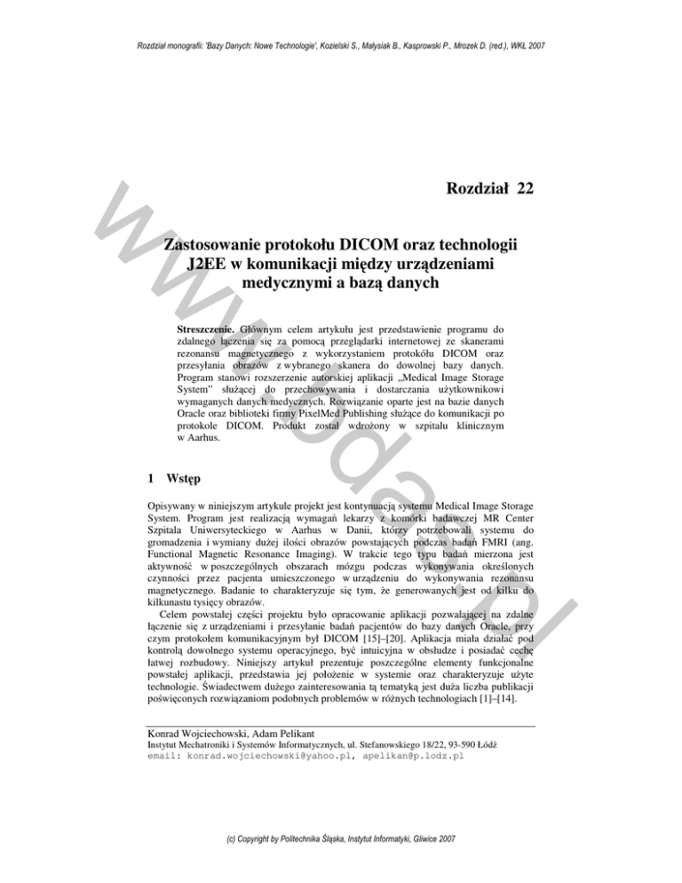 Rozdział monografii: 'Bazy Danych: Nowe Technologie', Kozielski S., Małysiak B., Kasprowski P., Mrozek D. (red.), WKŁ 2007 Rozdział 22 w w Zastosowanie protokołu DICOM oraz technologii J2EE w komunikacji między urządzeniami medycznymi a bazą danych 1 Wstęp da .b w Streszczenie. Głównym celem artykułu jest przedstawienie programu do zdalnego łączenia się za pomocą przeglądarki internetowej ze skanerami rezonansu magnetycznego z wykorzystaniem protokółu DICOM oraz przesyłania obrazów z wybranego skanera do dowolnej bazy danych. Program stanowi rozszerzenie autorskiej aplikacji „Medical Image Storage System” służącej do przechowywania i dostarczania użytkownikowi wymaganych danych medycznych. Rozwiązanie oparte jest na bazie danych Oracle oraz biblioteki firmy PixelMed Publishing służące do komunikacji po protokole DICOM. Produkt został wdrożony w szpitalu klinicznym w Aarhus. pl s. Opisywany w niniejszym artykule projekt jest kontynuacją systemu Medical Image Storage System. Program jest realizacją wymagań lekarzy z komórki badawczej MR Center Szpitala Uniwersyteckiego w Aarhus w Danii, którzy potrzebowali systemu do gromadzenia i wymiany dużej ilości obrazów powstających podczas badań FMRI (ang. Functional Magnetic Resonance Imaging). W trakcie tego typu badań mierzona jest aktywność w poszczególnych obszarach mózgu podczas wykonywania określonych czynności przez pacjenta umieszczonego w urządzeniu do wykonywania rezonansu magnetycznego. Badanie to charakteryzuje się tym, że generowanych jest od kilku do kilkunastu tysięcy obrazów. Celem powstałej części projektu było opracowanie aplikacji pozwalającej na zdalne łączenie się z urządzeniami i przesyłanie badań pacjentów do bazy danych Oracle, przy czym protokołem komunikacyjnym był DICOM [15]–[20]. Aplikacja miała działać pod kontrolą dowolnego systemu operacyjnego, być intuicyjna w obsłudze i posiadać cechę łatwej rozbudowy. Niniejszy artykuł prezentuje poszczególne elementy funkcjonalne powstałej aplikacji, przedstawia jej położenie w systemie oraz charakteryzuje użyte technologie. Świadectwem dużego zainteresowania tą tematyką jest duża liczba publikacji poświęconych rozwiązaniom podobnych problemów w różnych technologiach [1]–[14]. Konrad Wojciechowski, Adam Pelikant Instytut Mechatroniki i Systemów Informatycznych, ul. Stefanowskiego 18/22, 93-590 Łódź email: [email protected], [email protected] (c) Copyright by Politechnika Śląska, Instytut Informatyki, Gliwice 2007 Rozdział monografii: 'Bazy Danych: Nowe Technologie', Kozielski S., Małysiak B., Kasprowski P., Mrozek D. (red.), WKŁ 2007 K. Wojciechowski, A. Pelikant 2 Założenia projektowe w Jednym ze wstępnych wymagań projektowych było napisanie aplikacji w architekturze klient – serwer, która byłaby przenośna pomiędzy różnymi platformami systemowymi. Wymogło to decyzję o użyciu technologii Java. Ponadto aplikacja została napisana w oparciu o przeglądarkę internetową, co wyeliminowało konieczność instalowania dodatkowych narzędzi na stacjach roboczych i zapewniło możliwość łączenia się z dowolnego miejsca poprzez aplikację z urządzeniem skanera. Przy odpowiednio skonfigurowanej sieci internetowej możliwe jest zatem połączenie z komputerem skanera z dowolnego miejsca na świecie. W praktyce szpitalnej aplikacja jednak działa w obrębie sieci wydzielonej. Kolejną ważną cechą utworzonego oprogramowania jest jego wielozadaniowość. Pozwala ona na jednoczesną pracę wielu użytkowników, którzy niezależnie mogą przesyłać dane z różnych skanerów medycznych do bazy danych Oracle lub też innych urządzeń medycznych. Modularna budowa aplikacji sprawia, ze w czasie zapisywania danych do bazy przez jeden proces możliwe jest jednoczesne przesyłanie obrazów z bazy danych Oracle na komputer użytkownika lub też inny komputer działający w sieci. Ponadto stworzone oprogramowanie umożliwia zdalne swobodne przeglądanie i eksplorację bazy danych komputera skanera na różnych poziomach szczegółowości danych. Możliwe jest też dowolne wybieranie, filtrowanie danych do przesłania. Na rys. 1 przedstawiono całość opracowanego systemu. Zacieniowano moduły stanowiące przedmiot niniejszego artykułu. da .b w w Folder na dysku do przechowywania obrazów Listener Java Runtime Enviroment tmconfig.x Sdiconfig.x Komputer skanera pl s. Baza Danych Serwer Apache Transfer Manger Serwer Oracle oraz serwer Image Explorer Komputer użytownik a Rys. 1. Schemat blokowy systemu do obsługi skanerów medycznych oparty na protokole DICOM Stworzone oprogramowanie jest równoległym modułem uzupełniającym poprzednie dwie aplikacje (Image Explorer i Listener) [1]. Działa on, podobnie jak poprzednie, pod kontrolą serwera Apache Tomcat, który wysyła interfejs aplikacji do przeglądarki działającej na komputerze użytkownika. Do pełnego działania aplikacji wymagana jest instalacja Maszyny Wirtualnej Java. Konfiguracja aplikacji przechowywana jest w pliku tmconfig.xml. 230 (c) Copyright by Politechnika Śląska, Instytut Informatyki, Gliwice 2007 Rozdział monografii: 'Bazy Danych: Nowe Technologie', Kozielski S., Małysiak B., Kasprowski P., Mrozek D. (red.), WKŁ 2007 Zastosowanie protokołu DICOM oraz technologii J2EE w komunikacji między... 3 Przechowywanie i przetwarzanie danych w Podstawą stworzonego systemu stanowi serwer danych ORACLE tworzący szkielet aplikacji, oraz część pośrednią pomiędzy interfejsem zbierającym informację – Listenerem, a częścią prezentującą dane – Image Explorerem. Wybór rozwiązania firmy Oracle został podyktowany koniecznością spełnienia warunków niezawodności oraz bezpieczeństwa przechowywanych danych, a także koniecznością zapewnienia niezależności od platformy sprzętowej, a w szczególności bezproblemowego działania zarówno w środowisku Microsoft Windows, jak i Linux. T