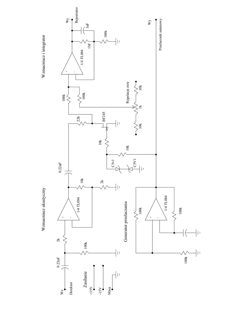 Masa -15V +15V Zasilanie Detektor We 100k 0.22uF - + 1/4 TL084 - + 100k 1/4 TL084 100k Generator przelaczania 100k 2k Wzmacniacz akustyczny 2k 18k C5V1 C5v1 0.22uF 10k 10k 10k BF245 22k 1k 10k Regulacja zera 100k 100k - + 1M 100k Wy 1uF Rejestrator Wy Przelacznik antenowy 1/4 TL084 Wzmacniacz i integrator