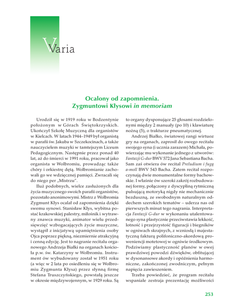 VVaria Ocalony od zapomnienia. Zygmuntowi Kłysowi in memoriam Urodził się w 1919 roku w Bodzentynie położonym w Górach Świętokrzyskich. Ukończył Szkołę Muzyczną dla organistów w Kielcach. W latach 1944–1949 był organistą w parafii św. Jakuba w Szczekocinach, a także nauczycielem muzyki w tamtejszym Liceum Pedagogicznym. Następnie przez ponad 40 lat, aż do śmierci w 1991 roku, pracował jako organista w Wolbromiu, prowadząc także chóry i orkiestrę dętą. Wolbromianie zachowali go we wdzięcznej pamięci. Zwracali się do niego per „Mistrzu”. Iluż podobnych, wielce zasłużonych dla życia muzycznego swoich parafii organistów, pozostało anonimowymi. Mistrz z Wolbromia Zygmunt Kłys ocalał od zapomnienia dzięki swemu synowi. Stanisław Kłys, wybitna postać krakowskiej palestry, miłośnik i wytrawny znawca muzyki, animator wielu przedsięwzięć wzbogacających życie muzyczne, wystąpił z inicjatywą upamiętnienia osoby Ojca poprzez piękną, niezmiernie atrakcyjną i cenną edycję. Jest to nagranie recitalu organowego Andrzeja Białki na organach kościoła p.w. św. Katarzyny w Wolbromiu. Instrument ów wybudowany został w 1951 roku (a więc w 2 lata po osiedleniu się w Wolbromiu Zygmunta Kłysa) przez słynną firmę Stefana Truszczyńskiego, powstałą jeszcze w okresie międzywojennym, w 1929 roku. Są to organy dysponujące 25 głosami rozdzielonymi między 2 manuały (po 10) i klawiaturę nożną (5), o trakturze pneumatycznej. Andrzej Białko, światowej rangi wirtuoz gry na organach, zaprosił do owego recitalu swojego syna (i ucznia zarazem) Michała, powierzając mu wykonanie jednego z utworów: Fantazji G-dur BWV 572 Jana Sebastiana Bacha. Sam zaś otwiera ów recital Preludium i fugą a-moll BWV 543 Bacha. Zatem recital rozpoczynają dwie monumentalne formy bachowskie. I właśnie ów szeroki zakrój rozbudowanej formy, połączony z dyscypliną rytmiczną pulsującą motoryką nigdy nie mechanicznie bezduszną, ze swobodnym naturalnym oddechem szerokich tematów – uderza nas od pierwszych minut tego nagrania. Interpretacja Fantazji G-dur w wykonaniu utalentowanego syna plastycznie przeciwstawia lekkość, lotność i przejrzystość figuracji i biegników w ogniwach skrajnych, z wzniosłą i majestatyczną fakturą polifoniczno-akordową proweniencji motetowej w ogniwie środkowym. Podziwiamy plastyczność planów w owej prawdziwej powodzi dźwięków, obfitującej w dysonansowe akordy i opóźnienia harmoniczne, zakończonej zwodniczym, pełnym napięcia zawieszeniem. Trzeba powiedzieć, że program recitalu wspaniale zestraja prezentację możliwości 253 Varia brzmieniowych wolbromskiego instrumentu oraz nieograniczone możliwości repertuarowe jego wykonawcy z ulubionymi utworami Zygmunta Kłysa. Kolejna jego pozycja to dwa preludia chorałowe z op. 65 Sigfrida Karga-Elerta, stosunkowo rzadko wykonywanego kompozytora niemieckiego (1877–1933). Bogatemu fakturalnie, obfitemu w kontrasty brzmieniowe i rytmiczne, burzliwemu i improwizacyjnemu w charakterze, jakby natarczywemu w ekspresji preludium chorałowemu Herr Jesu Christ, dich zu unswend’ przeciwstawiony zostaje modlitewny liryzm o tonie wielkanocnym w preludium O Welt, ich muss dich lassen. Feliksa Mendelssohna Bartholdy ’ego, ulubionego kompozytora mistrza Zygmunta Kłysa, reprezentuje Preludium i fuga e-moll op. 37 nr 1. Dzieło mniej popularne niż sonaty organowe kompozytora, zwraca uwagę umiejętnym połączeniem szlachetnego, romantyzującego patosu z barokową stylizacją wielkiego „odkrywcy” i wielbiciela Bacha. Następnie słuchamy wspaniałej, jakże bogatej muzyki Maxa Regera. Tu znów wykonawca zestawia dialektycznie Wariacje na temat „Heil dir im Siegerkranz” z Preludiami chorałowymi z op. 79b. Z jednej więc strony rozbudowana forma, maksymalnie wykorzystująca możliwości brzmieniowe instrumentu, wspaniale kontrastująca w swej koncepcji rejestracyjnej barwy miękkie, łagodne, pastelowe, z brzmieniami bardziej pikantnymi, a wreszcie symfonicznymi. W skomplikowanej polifonii tej formy podziwiamy plastyczne uwydatnienie głosów, stopniowe narastanie PALESTRA dynamiki brzmienia aż po wspaniałe, triumfalne tutti finału. To kreacja oddychająca architektoniczną przestrzenią kościelnego wnętrza. Z drugiej zaś strony – osobista medytacja i mistyczna kontemplacja duszy doznającej intuicji wieczności, przeczuwającej śmierć, zwracającej się do Boga o obecność, zarazem utwierdzającej się w pewności jego istnienia i udzielanej nam pomocy. Ukoronowaniem tego wspaniałego recitalu staje się utwór drugiego ulubionego przez mistrza Zygmunta kompozytora: Improwizacje na temat polskiej pieśni kościelnej „Święty Boże” op. 38 Mieczysława Surzyńskiego. Ów polski akcent nie jest li tylko ukłonem w stronę rodzimej tradycji muzycznej – w całym owym zestawieniu dzieło organowe Surzyńskiego potrafi w pełni sprostać porównaniu z utworami największych mistrzów muzyki organowej, na przykład wariacjami Regera. Wzniosły, majestatyczny i hieratyczny ton starej kościelnej pieśni, symfoniczne forte, zderzone tu zostają z brzmieniami najbardziej delikatnymi, wyrafinowanymi, subtelnymi – ukazując możliwości instrumentu w całym ich zaskakującym bogactwie. Płytę wydała firma fonograficzna Dux. Podkreślić trzeba doskonałą reżyserię akustyczną nagrania, będącą dziełem Marcina Domżała. Autorem komentarza towarzyszącego edycji jest Jacek Berwaldt, za którego muzycznym piórem bardzo już się stęskniliśmy. Doprawdy, nasze współczesne media zbyt wcześnie wysyłają znakomitych autorów na emeryturę! Leszek Polony * Leszek Polony, muzykolog i teoretyk muzyczny, krytyk muzyczny, wydawca, profesor zwyczajny Akademii Muzycznej w Krakowie, 1987–2012 kierownik Katedry Teorii Muzyki i Kształcenia Słuchu, 1990–1991 prorektor tej uczelni, 1991–1994 redaktor naczelny PWM, 1995–1999 dyrektor i redakt