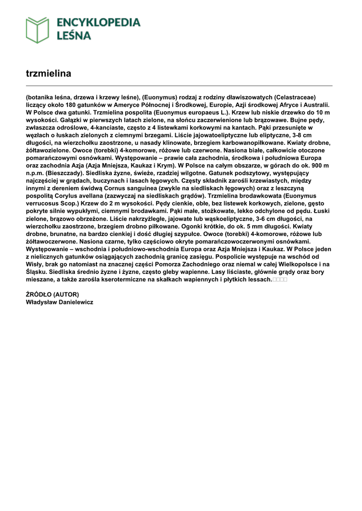 trzmielina (botanika leśna, drzewa i krzewy leśne), (Euonymus) rodzaj z rodziny dławiszowatych (Celastraceae) liczący około 180 gatunków w Ameryce Północnej i Środkowej, Europie, Azji środkowej Afryce i Australii. W Polsce dwa gatunki. Trzmielina pospolita (Euonymus europaeus L.). Krzew lub niskie drzewko do 10 m wysokości. Gałązki w pierwszych latach zielone, na słońcu zaczerwienione lub brązowawe. Bujne pędy, zwłaszcza odroślowe, 4-kanciaste, często z 4 listewkami korkowymi na kantach. Pąki przesunięte w węzłach o łuskach zielonych z ciemnymi brzegami. Liście jajowatoeliptyczne lub eliptyczne, 3-8 cm długości, na wierzchołku zaostrzone, u nasady klinowate, brzegiem karbowanopiłkowane. Kwiaty drobne, żółtawozielone. Owoce (torebki) 4-komorowe, różowe lub czerwone. Nasiona białe, całkowicie otoczone pomarańczowymi osnówkami. Występowanie – prawie cała zachodnia, środkowa i południowa Europa oraz zachodnia Azja (Azja Mniejsza, Kaukaz i Krym). W Polsce na całym obszarze, w górach do ok. 900 m n.p.m. (Bieszczady). Siedliska żyzne, świeże, rzadziej wilgotne. Gatunek podszytowy, występujący najczęściej w grądach, buczynach i lasach łęgowych. Częsty składnik zarośli krzewiastych, między innymi z dereniem świdwą Cornus sanguinea (zwykle na siedliskach łęgowych) oraz z leszczyną pospolitą Corylus avellana (zazwyczaj na siedliskach grądów). Trzmielina brodawkowata (Euonymus verrucosus Scop.) Krzew do 2 m wysokości. Pędy cienkie, obłe, bez listewek korkowych, zielone, gęsto pokryte silnie wypukłymi, ciemnymi brodawkami. Pąki małe, stożkowate, lekko odchylone od pędu. Łuski zielone, brązowo obrzeżone. Liście nakrzyżległe, jajowate lub wąskoeliptyczne, 3-6 cm długości, na wierzchołku zaostrzone, brzegiem drobno piłkowane. Ogonki krótkie, do ok. 5 mm długości. Kwiaty drobne, brunatne, na bardzo cienkiej i dość długiej szypułce. Owoce (torebki) 4-komorowe, różowe lub żółtawoczerwone. Nasiona czarne, tylko częściowo okryte pomarańczowoczerwonymi osnówkami. Występowanie – wschodnia i południowo-wschodnia Europa oraz Azja Mniejsza i Kaukaz. W Polsce jeden z nielicznych gatunków osiągających zachodnią granicę zasięgu. Pospolicie występuje na wschód od Wisły, brak go natomiast na znacznej części Pomorza Zachodniego oraz niemal w całej Wielkopolsce i na Śląsku. Siedliska średnio żyzne i żyzne, często gleby wapienne. Lasy liściaste, głównie grądy oraz bory mieszane, a także zarośla kserotermiczne na skałkach wapiennych i płytkich lessach. ŹRÓDŁO (AUTOR) Władysław Danielewicz
