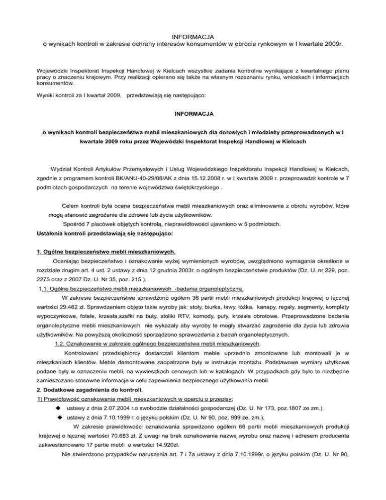 INFORMACJA o wynikach kontroli w zakresie ochrony interesów konsumentów w obrocie rynkowym w I kwartale 2009r. Wojewódzki Inspektorat Inspekcji Handlowej w Kielcach wszystkie zadania kontrolne wynikające z kwartalnego planu pracy o znaczeniu krajowym. Przy realizacji opierano się takŜe na własnym rozeznaniu rynku, wnioskach i informacjach konsumentów. Wyniki kontroli za I kwartał 2009, przedstawiają się następująco: INFORMACJA o wynikach kontroli bezpieczeństwa mebli mieszkaniowych dla dorosłych i młodzieŜy przeprowadzonych w I kwartale 2009 roku przez Wojewódzki Inspektorat Inspekcji Handlowej w Kielcach Wydział Kontroli Artykułów Przemysłowych i Usług Wojewódzkiego Inspektoratu Inspekcji Handlowej w Kielcach, zgodnie z programem kontroli BK/ANU-40-29/08/AK z dnia 15.12.2008 r. w I kwartale 2009 r. przeprowadził kontrole w 7 podmiotach gospodarczych na terenie województwa świętokrzyskiego . Celem kontroli była ocena bezpieczeństwa mebli mieszkaniowych oraz eliminowanie z obrotu wyrobów, które mogą stanowić zagroŜenie dla zdrowia lub Ŝycia uŜytkowników. Spośród 7 placówek objętych kontrolą, nieprawidłowości ujawniono w 5 podmiotach. Ustalenia kontroli przedstawiają się następująco: 1. Ogólne bezpieczeństwo mebli mieszkaniowych. Oceniając bezpieczeństwo i oznakowanie wyŜej wymienionych wyrobów, uwzględniono wymagania określone w rozdziale drugim art. 4 ust. 2 ustawy z dnia 12 grudnia 2003r. o ogólnym bezpieczeństwie produktów (Dz. U. nr 229, poz. 2275 oraz z 2007 Dz. U. Nr 35, poz. 215 ). 1.1. Ogólne bezpieczeństwo mebli mieszkaniowych -badania organoleptyczne. W zakresie bezpieczeństwa sprawdzono ogółem 36 partii mebli mieszkaniowych produkcji krajowej o łącznej wartości 29.462 zł. Sprawdzeniem objęto takie wyroby jak: stoły, biurka, ławy, łóŜka, kanapy, regały, segmenty, komplety wypoczynkowe, fotele, krzesła,szafki na buty, stoliki RTV, komody, pufy, krzesła obrotowe. Przeprowadzone badania organoleptyczne mebli mieszkaniowych nie wykazały aby wyroby te mogły stwarzać zagroŜenie dla Ŝycia lub zdrowia uŜytkowników. Na powyŜszą okoliczność sporządzono sprawozdania z badań organoleptycznych. 1.2. Oznakowanie w zakresie ogólnego bezpieczeństwa mebli mieszkaniowych. Kontrolowani przedsiębiorcy dostarczali klientom meble uprzednio zmontowane lub montowali je w mieszkaniach klientów. Meble demontowane zaopatrzone były w instrukcje montaŜu. Podstawowe wymiary uŜytkowe podane były w oznaczeniu mebli, na wywieszkach cenowych lub w katalogach. W przypadkach gdy było to niezbędne zamieszczano stosowne informacje w celu zapewnienia bezpiecznego uŜytkowania mebli. 2. Dodatkowe zagadnienia do kontroli. 1) Prawidłowość oznakowania mebli mieszkaniowych w oparciu o przepisy: ustawy z dnia 2.07.2004 r.o swobodzie działalności gospodarczej (Dz. U. Nr 173, poz.1807 ze zm.). ustawy z dnia 7.10.1999 r. o języku polskim (Dz. U. Nr 90, poz. 999 ze. zm.). W zakresie prawidłowości oznakowania sprawdzono ogółem 66 partii mebli mieszkaniowych produkcji krajowej o łącznej wartości 70.683 zł. Z uwagi na brak oznakowania nazwą wyrobu oraz nazwą i adresem producenta zakwestionowano 17 partie mebli o wartości 14.920zł. Nie stwierdzono przypadków naruszenia art. 7 i 7a ustawy z dnia 7.10.1999r. o języku polskim (Dz. U. Nr 90, poz. 999 z późn. zm.). a) Prawidłowość sporządzania kart gwarancyjnych . Sprawdzeniem objęto 11 kart gwarancyjnych dołączonych do mebli. W wyniku powyŜszego sprawdzenia ustalono, Ŝe w 3 przypadkach karty gwarancyjne nie zawierały stwierdzenia, Ŝe gwarancja na sprzedany towar nie wyłącza, nie ogranicza ani nie zawiesza uprawnień kupującego wynikających z niezgodności towaru z umową co jest niezgodne z art. 13 ust. 4 ustawy z dnia 27.07.2002 r. o szczególnych warunkach sprzedaŜy konsumenckiej oraz o zmianie kodeksu cywilnego (Dz. U. nr 141, poz. 1176 z późn. zm.). 2. Przestrzeganie przepisów ustawy z dnia 5 lipca 2001 r. o cenach (Dz. U. nr 97, poz.1050 z późn. zm.) oraz rozporządzenia Ministra Finansów z dnia 10 czerwca 2002 r. w sprawie szczegółowych zasad uwidaczniania cen towarów i usług oraz sposobu oznaczania ceną towarów przeznaczonych do sprzedaŜy (Dz. U. nr 99, poz. 894 z późn. zm.), dotyczących oznaczania towarów ceną i uwidaczniania cen, w przypadku prowadzenia przez kontrolowanych przedsiębiorców sprzedaŜy detalicznej. W skontrolowanych sklepach meblowych nie stwierdzono przypadków naruszenia w/w przepisów dotyczących zasad uwidaczniania cen towarów. 3. Legalność prowadzonej działalności gospodarczej. Skontrolowani przedsiębiorcy prowadzili działalność w oparciu o wpisy do KRS oraz ewidencji działalności gospodarczej. W jednym przypadku przedsiębiorca nie zgłosił od organu ewidencji gospodarczej miejsca wykonywanej działalności, co jest niezgodne z art. 7 d ustawy Prawo działalności gospodarczej z dnia 19 listopada 1999 roku (Dz. U. z 1999 r., Nr 101 poz. 1178 ze zm.) . 4.Nie stwierdzono przypadków naruszenia przepisów ustawy z dnia 23 sierpnia 2007 r. o przeciwdziałaniu nieuczciwym praktykom rynkowym (Dz. U. nr 171, poz. 1206) lub art. 10 ustawy z dnia 16.04.1993 r. o zwalczaniu nieuczciwej konkurencji (tekst jednolity: Dz. U. 2003r. Nr 153, poz. 1503 z późn. zm.). W trakcie kontroli nałoŜono 3 mandaty karne kredytowane na łączną kwotę 300 zł. tj: 2 mandaty z art. 136§2 KW i 1 mandat z art. 60¹§2 KW. W toku kontroli zakwestionowane meble zostały dobrowolnie, oznakowane przez przedsiębiorców, informacją zawierającą nazwę wyrobu oraz nazwę i adres producenta. Do producentów skierowano 6 wystąpień pokontrolnych z wnioskami o prawidłowe oznaczanie mebli wprowadzanych do obrotu oraz zamieszczenia w kartach gwarancyjnych stwierdzenia, Ŝe gwarancja na sprzedany towar konsumpcyjny, nie wyłącza, nie ogranicza, ani nie zawiesza uprawnień kupującego wynikających z niezgodności towa