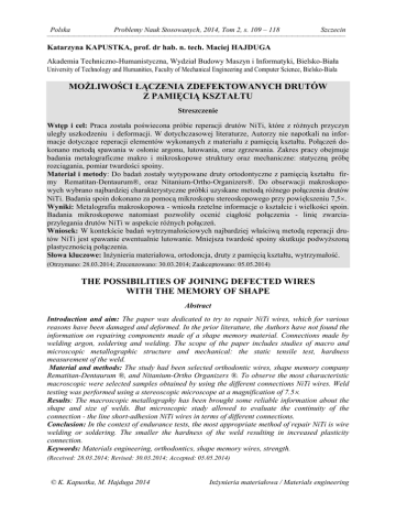 Polska Problemy Nauk Stosowanych, 2014, Tom 2, s. 109 – 118 Szczecin Katarzyna KAPUSTKA, prof. dr hab. n. tech. Maciej HAJDUGA Akademia Techniczno-Humanistyczna, Wydział Budowy Maszyn i Informatyki, Bielsko-Biała University of Technology and Humanities, Faculty of Mechanical Engineering and Computer Science, Bielsko-Biała MOŻLIWOŚCI ŁĄCZENIA ZDEFEKTOWANYCH DRUTÓW Z PAMIĘCIĄ KSZTAŁTU Streszczenie Wstęp i cel: Praca została poświecona próbie reperacji drutów NiTi, które z różnych przyczyn uległy uszkodzeniu i deformacji. W dotychczasowej literaturze, Autorzy nie napotkali na informacje dotyczące reperacji elementów wykonanych z materiału z pamięcią kształtu. Połączeń dokonano metodą spawania w osłonie argonu, lutowania, oraz zgrzewania. Zakres pracy obejmuje badania metalograficzne makro i mikroskopowe struktury oraz mechaniczne: statyczną próbę rozciągania, pomiar twardości spoiny. Materiał i metody: Do badań zostały wytypowane druty ortodontyczne z pamięcią kształtu firmy Rematitan-Dentaurum®, oraz Nitanium-Ortho-Organizers®. Do obserwacji makroskopowych wybrano najbardziej charakterystyczne próbki uzyskane metodą różnego połączenia drutów NiTi. Badania spoin dokonano za pomocą mikroskopu stereoskopowego przy powiększeniu 7,5×. Wyniki: Metalografia makroskopowa - wniosła rzetelne informacje o kształcie i wielkości spoin. Badania mikroskopowe natomiast pozwoliły ocenić ciągłość połączenia - linię zwarciaprzylegania drutów NiTi w aspekcie różnych połączeń. Wniosek: W kontekście badań wytrzymałościowych najbardziej właściwą metodą reperacji drutów NiTi jest spawanie ewentualnie lutowanie. Mniejsza twardość spoiny skutkuje podwyższoną plastycznością połączenia. Słowa kluczowe: Inżynieria materiałowa, ortodoncja, druty z pamięcią kształtu, wytrzymałość. (Otrzymano: 28.03.2014; Zrecenzowano: 30.03.2014; Zaakceptowano: 05.05.2014) THE POSSIBILITIES OF JOINING DEFECTED WIRES WITH THE MEMORY OF SHAPE Abstract Introduction and aim: The paper was dedicated to try to repair NiTi wires, which for various reasons have been damaged and deformed. In the prior literature, the Authors have not found the information on repairing components made of a shape memory material. Connections made by welding argon, soldering and welding. The scope of the paper includes studies of macro and microscopic metallographic structure and mechanical: the static tensile test, hardness measurement of the weld. Material and methods: The study had been selected orthodontic wires, shape memory company Rematitan-Dentaurum ®, and Nitanium-Ortho Organizers ®. To observe the most characteristic macroscopic were selected samples obtained by using the different connections NiTi wires. Weld testing was performed using a stereoscopic microscope at a magnification of 7.5×. Results: The macroscopic metallography has been brought some reliable information about the shape and size of welds. But microscopic stady allowed to evaluate the continuity of the connection - the line short-adhesion NiTi wires in terms of different connections. Conclusion: In the context of endurance tests, the most appropriate method of repair NiTi is wire welding or soldering. The smaller the hardness of the weld resulting in increased plasticity connection. Keywords: Materials engineering, orthodontics, shape memory wires, strength. (Received: 28.03.2014; Revised: 30.03.2014; Accepted: 05.05.2014) © K. Kapustka, M. Hajduga 2014 Inżynieria materiałowa / Materials engineering K. Kapustka, M. Hajduga 1. Wstęp i cele Materiał inteligentny nie posiada jednej powszechnie akceptowanej definicji. Najczęściej definiuje się go, jako materiał, który jest zdolny do reagowania na bodźce zewnętrzne przez istotną zmianę swych właściwości dla pożądanego efektu [3]. Zjawisko pamięci kształtu oparte jest na przemianie martenzytycznej. Przemiana martenzytyczna jest przemianą pierwszego rodzaju, więc zachodzi poprzez zarodkowanie nowej fazy i rozrost zarodków. Jej głównymi cechami jest bezdyfuzyjność oraz charakter przemieszczeniowy. Określenie „bezdyfuzyjna” oznacza, że nie wymaga ona dyfuzji atomów na duże odległości, więc w jej trakcie nie zachodzi migracja poprzez granice rozdziału fazy macierzystej i martenzytycznej [2], [8]. Stopy z pamięcią kształtu są unikatową klasą stopów metali. Wśród tych materiałów ponad 90% komercyjnych zastosowań mają stopy na osnowie NiTi, wykazujące nie tylko silniejszy efekt, ale także najlepsze właściwości mechaniczne. Spośród dużej liczby dostępnych metali jedynie niewiele z nich znalazło zastosowanie kliniczne. Wynika to z ostrych kryteriów stawianych implantom, a dotyczących spełnienia biologicznych wymogów w procesie leczenia, w tym biologicznej przyswajalności i braku toksycznego oddziaływania. Pierwsze badania nad biologiczną przyswajalnością stopów NiTi prowadzane na psach przez Castelemana i współpracowników wykazały ich korzystne zachowanie i możliwość stosowania jako implanty [1]. Druty łukowe wykonane ze stopu NiTi mocowane są do zębów w celu korekty wadliwego zgryzu. Zastępują one dotychczas stosowane druty stalowe. Druty ze stopów NiTi w stanie martenzytycznym są spłaszczone przez walcowanie, uzyskując 30% stopień odkształcenia. Jest to stan pseudosprężystości i druty te cechuje duża sprężystość. Istotną zaletą drutów NiTi, w porównaniu z drutami ze stali, jest 6-krotnie mniejszy moduł sprężystości, dzięki czemu przy tej samej wartości ugięcia, dla drutu NiTi uzyskuje się znacznie mniejsze działanie sił. Z klinicznego punktu widzenia oznacza to, że drut z nitinolu wywiera mniejszą siłę nacisku na zgryz od drutu stalowego [5]. Praca została poświecona próbie reperacji drutów NiTi, które z różnych przyczyn uległy uszkodzeniu i deformacji. W związku ze swoim zastosowaniem, często ulegają one także zniszczeniu,