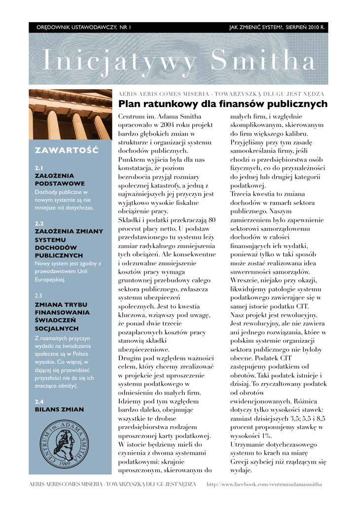 ORĘDOWNIK USTAWODAWCZY, NR 1 JAK ZMIENIĆ SYSTEM?, SIERPIEŃ 2010 R. In icj atywy Smi tha AERIS AERIS COMES MISERIA - TOWARZYSZKĄ DŁUGU JEST NĘDZA Plan ratunkowy dla finansów publicznych ZAWARTOŚĆ 2.1 ZAŁOŻENIA PODSTAWOWE Dochody publiczne w nowym systemie są nie mniejsze niż dotychczas. 2.2 ZAŁOŻENIA ZMIANY SYSTEMU DOCHODÓW PUBLICZNYCH Nowy system jest zgodny z prawodawstwem Unii Europejskiej. 2.3 ZMIANA TRYBU FINANSOWANIA ŚWIADCZEŃ SOCJALNYCH Z rozmaitych przyczyn wydatki na świadczenia społeczne są w Polsce wysokie. Co więcej, w dającej się przewidzieć przyszłości nie da się ich znacząco obniżyć. 2.4 BILANS ZMIAN . ADAM EN A 1989 SMITH TRUM A im Centrum im. Adama Smitha opracowało w 2004 roku projekt bardzo głębokich zmian w strukturze i organizacji systemu dochodów publicznych. Punktem wyjścia była dla nas konstatacja, że poziom bezrobocia przyjął rozmiary społecznej katastrofy, a jedną z najważniejszych jej przyczyn jest wyjątkowo wysokie fiskalne obciążenie pracy. Składki i podatki przekraczają 80 procent płacy netto. U podstaw przedstawionego tu systemu leży zamiar radykalnego zmniejszenia tych obciążeń. Ale konsekwentne i odczuwalne zmniejszenie kosztów pracy wymaga gruntownej przebudowy całego sektora publicznego, zwłaszcza systemu ubezpieczeń społecznych. Jest to kwestia kluczowa, wziąwszy pod uwagę, że ponad dwie trzecie pozapłacowych kosztów pracy stanowią składki ubezpieczeniowe. Drugim pod względem ważności celem, który chcemy zrealizować w projekcie jest uproszczenie systemu podatkowego w odniesieniu do małych firm. Idziemy pod tym względem bardzo daleko, obejmując wszystkie te drobne przedsiębiorstwa rodzajem uproszczonej karty podatkowej. W istocie będziemy mieli do czynienia z dwoma systemami podatkowymi: skrajnie uproszczonym, skierowanym do C AERIS AERIS COMES MISERIA - TOWARZYSZKĄ DŁUGU JEST NĘDZA małych firm, i względnie skomplikowanym, skierowanym do firm większego kalibru. Przyjęliśmy przy tym zasadę samookreślania firmy, jeśli chodzi o przedsiębiorstwa osób fizycznych, co do przynależności do jednej lub drugiej kategorii podatkowej. Trzecia kwestia to zmiana dochodów w ramach sektora publicznego. Naszym zamierzeniem było zapewnienie sektorowi samorządowemu dochodów w całości finansujących ich wydatki, ponieważ tylko w taki sposób może zostać realizowana idea suwerenności samorządów. Wreszcie, niejako przy okazji, likwidujemy patologie systemu podatkowego zawierające się w samej istocie podatku CIT. Nasz projekt jest rewolucyjny. Jest rewolucyjny, ale nie zawiera ani jednego rozwiązania, które w polskim systemie organizacji sektora publicznego nie byłoby obecne. Podatek CIT zastępujemy podatkiem od obrotów. Taki podatek istnieje i dzisiaj. To zryczałtowany podatek od obrotów ewidencjonowanych. Różnica dotyczy tylko wysokości stawek: zamiast dzisiejszych 3,5; 5,5 i 8,5 procent proponujemy stawkę w wysokości 1%. Utrzymanie dotychczasowego systemu to krach na miarę Grecji szybciej niż rządzącym się wydaje. http://www.facebook.com/centrumadamasmitha BIULETYN INWESTORA, ORĘDOWNIK USTAWODAWCZY, NR 3 NR 1 JAK ZMIENIĆ SYSTEM?, SIERPIEŃ JESIEŃ 2010 2009 R. Podstawowe elementy Ustawy o Likwidacji Bezrobocia i Naprawie Finansów Publicznych 2.1. Założenia podstawowe: Podatkowe uwłaszczenie samorządów: Dochody publiczne w nowym systemie są nie mniejsze niż dotychczas. W koncepcji Centrum im. Adama Smitha samorządy terytorialne dysponują dochodami z podatków adresowanych tylko do nich i równoważących ich dzisiejsze dochody własne oraz subwencje i dotacje państwowe. Tym samym o przeznaczeniu dochodów decydują całkowicie suwerennie. Dochody powiatów i województw samorządowych stanowią ustalony odpis od dochodów gmin składających się na powiat i województwo. Nowy system jest zgodny z prawodawstwem Unii Europejskiej. Likwidowane podatki: 1. wszystkie składki na ubezpieczenia społeczne (ZUS) 2. składki na Fundusz Pracy, PFRON i FGŚP; 3. podatki PIT (od dochodu osób fizycznych) i CIT (od dochodu firm) Rolnicy: Płacą podatki wg dotychczasowych zasad. Nowe podatki: 1. 25% od wynagrodzeń (odprowadza pracodawca ryczałtem od funduszu płac) 2. 1% wartości wszystkich przychodów (dla płatników VAT) Podstawowe zalety nowego systemu: 3. 0 , 2 % m i e s i ę c z n i e o d k a p i t a ł u własnego (dla płatników VAT) 4. 700 zł ryczałtu miesięcznego dla osób pracujących na własny rachunek; firmy te nie prowadzą prawie żadnej (!) księgowości. UWAGA: O tym czy firma taka jest płatnikiem VAT na zasadach ogólnych decyduje ona sama! Podatek VAT: Generalnie jedna stawka na wszystkie towary i usługi na początku na poziomie około 20%. 1. Podatek od kosztów pracy spada z 85% do 25%, podatek odprowadza pracodawca, pracownik nie składa żadnych rozliczeń podatkowych. 2. Dla państwa liczba podmiotów podatkowych zmniejsza się z kilkunastu mln. do ca. 3 mln. Radykalne zmniejszenie kosztów pobierania podatków. 3. Zamiana CIT na 1% od przychodu radykalnie zmniejsza koszty rachunkowości w firmach i koszty poboru podatków. 4. Z m n i e j s z e n i e p o d a t k o w y c h i administracyjnych obciążeń firm powoduje powstawanie nowych miejsc pracy. Spadek poziomu bezrobocia do 4% w ciągu trzech lat. 5. A t r a k c y j n e z a s a d y p o d a t k o w e powodują napływ do Polski zagranicznych inwestycji. AERIS AERIS COMES MISERIA - TOWARZYSZKĄ DŁUGU JEST NĘDZA http://www.facebook.com/centrumadamasmitha 2 ORĘDOWNIK USTAWODAWCZY, NR 1 JAK ZMIENIĆ SYSTEM?, SIERPIEŃ 2010 R. 2.2 ZAŁOŻENIA ZMIANY SYSTEMU DOCHODÓW PUBLICZNYCH Przy projektowaniu alternatywnego systemu dochodów kierowaliśmy się następującymi ograniczeniami: 1 Dochody z nowego systemu muszą być równoważne z uzyskanymi w dotychczasowym systemie, przy czym w szacunkach i obliczeniach braliśmy pod uwagę realia roku 2001. 2 Projektowany system musi