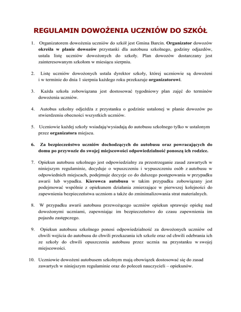 REGULAMIN DOWOŻENIA UCZNIÓW DO SZKÓŁ 1. Organizatorem dowożenia uczniów do szkół jest Gmina Barcin. Organizator dowozów określa w planie dowozów przystanki dla autobusu szkolnego, godziny odjazdów, ustala listę uczniów dowożonych do szkoły. Plan dowozów dostarczany jest zainteresowanym szkołom w miesiącu sierpniu. 2. Listę uczniów dowożonych ustala dyrektor szkoły, której uczniowie są dowożeni i w terminie do dnia 1 sierpnia każdego roku przekazuje organizatorowi. 3. Każda szkoła zobowiązana jest dostosować tygodniowy plan zajęć do terminów dowożenia uczniów. 4. Autobus szkolny odjeżdża z przystanku o godzinie ustalonej w planie dowozów po stwierdzeniu obecności wszystkich uczniów. 5. Uczniowie każdej szkoły wsiadają/wysiadają do autobusu szkolnego tylko w ustalonym przez organizatora miejscu. 6. Za bezpieczeństwo uczniów dochodzących do autobusu oraz powracających do domu po przywozie do swojej miejscowości odpowiedzialność ponoszą ich rodzice. 7. Opiekun autobusu szkolnego jest odpowiedzialny za przestrzeganie zasad zawartych w niniejszym regulaminie, decyduje o wpuszczeniu i wypuszczeniu osób z autobusu w odpowiednich miejscach, podejmuje decyzje co do dalszego postępowania w przypadku awarii lub wypadku. Kierowca autobusu w takim przypadku zobowiązany jest podejmować wspólnie z opiekunem działania zmierzające w pierwszej kolejności do zapewnienia bezpieczeństwa uczniom a także do zminimalizowania strat materialnych. 8. W przypadku awarii autobusu przewożącego uczniów opiekun sprawuje opiekę nad dowożonymi uczniami, zapewniając im bezpieczeństwo do czasu zapewnienia im pojazdu zastępczego. 9. Opiekun autobusu szkolnego ponosi odpowiedzialność za dowożonych uczniów od chwili wejścia do autobusu do chwili przekazania ich szkole oraz od chwili odebrania ich ze szkoły do chwili opuszczenia autobusu przez ucznia na przystanku w swojej miejscowości. 10. Uczniowie dowożeni autobusem szkolnym mają obowiązek dostosować się do zasad zawartych w niniejszym regulaminie oraz do poleceń nauczycieli – opiekunów. 11. W autobusie prowadzony jest dziennik obecności uczniów, w którym codziennie notowany jest fakt przejazdu ucznia odrębnie w drodze do szkoły oraz w drodze ze szkoły do domu. W dzienniku notowane są uwagi dotyczące pozytywnych i negatywnych zachowań uczniów. O zapisach dotyczących zachowania uczniów nauczyciel – opiekun autobusu szkolnego informuje ustnie dyrektora szkoły, w której uczeń się uczy. 12. Uczniowie zajmują w autobusie miejsca wyznaczone przez opiekunów. 13. Uczniom podczas jazdy nie wolno: a) wsiadać lub wysiadać z autobusu bez zgody lub pod nieobecność nauczyciela – opiekuna, b) wstawać ze swoich miejsc, otwierać okien, zaśmiecać pojazdu, c) zachowywać się w sposób hałaśliwy bądź stwarzający zagrożenie bezpieczeństwa jadących w nim osób, d) żądać zatrzymania autobusu w miejscu do tego nie przeznaczonym, e) rozmawiać z kierowcą, 14. Uczniowie podczas jazdy mają prawo siedzieć na wyznaczonych przez nauczycieli opiekunów miejscach. 15. Opiekun szkolnego autobusu odprowadza uczniów dowożonych pod drzwi wejściowe do szkoły i przekazuje ich wyznaczonemu przez dyrektora szkoły nauczycielowi – wychowawcy. 16. Podczas odwozów opiekun odbiera uczniów spod drzwi szkoły, prowadzi ich do autobusu szkolnego i wpuszcza zgodnie z ustalonym porządkiem notując ich obecność. 17. Dyrektor szkoły ma prawo do zapoznania się z frekwencją dowożonych uczniów w celu porównania jej z obecnościami podczas zajęć w szkole. 18. Opiekunowie autobusu szkolnego współpracują z dyrektorami szkół oraz wychowawcami zajmującymi się uczniami dojeżdżającymi w szkole w zakresie prawidłowej organizacji dowozów, zapewnienia uczniom bezpieczeństwa, poprawy ich zachowania oraz wyeliminowania ucieczek ze szkoły. 19. Szkoła ma obowiązek reagowania zgodnie z zapisami swojego statutu na zgłoszenia opiekunów dotyczące pozytywnych lub negatywnych zachowań uczniów. 20. Dyrektorzy szkół z co najmniej dwudniowym wyprzedzeniem informują organizatora o planowanych zmianach w terminach dowozów uczniów związanych ze zmianą organizacji nauki w szkole. Wszelkie zmiany powinny być przed zgłoszeniem uzgodnione z dyrektorami pozostałych szkół, których uczniowie dowożeni są szkolnym autobusem. 21. Uczniowie nie zapisani w dzienniku dowozów lub inne osoby mogą być przewożeni szkolnym autobusem tylko za zgodą opiekuna pod warunkiem posiadania wolnych miejsc. Uczeń dowożony może wrócić do domu innym kursem autobusu szkolnego tylko za zgodą szkoły i nauczyciela – opiekuna. 22. Niniejszy regulamin przedstawiany jest przez opiekunów wszystkim uczniom dowożonym oraz przez dyrektorów szkół rodzicom tych uczniów najpóźniej w miesiącu wrześniu każdego roku szkolnego. 23. W sprawach nieuregulowanym niniejszym regulaminem decyzje podejmują: a) podczas trwania dowozów – opiekunowie; b) w innym czasie – organizator dowozów.