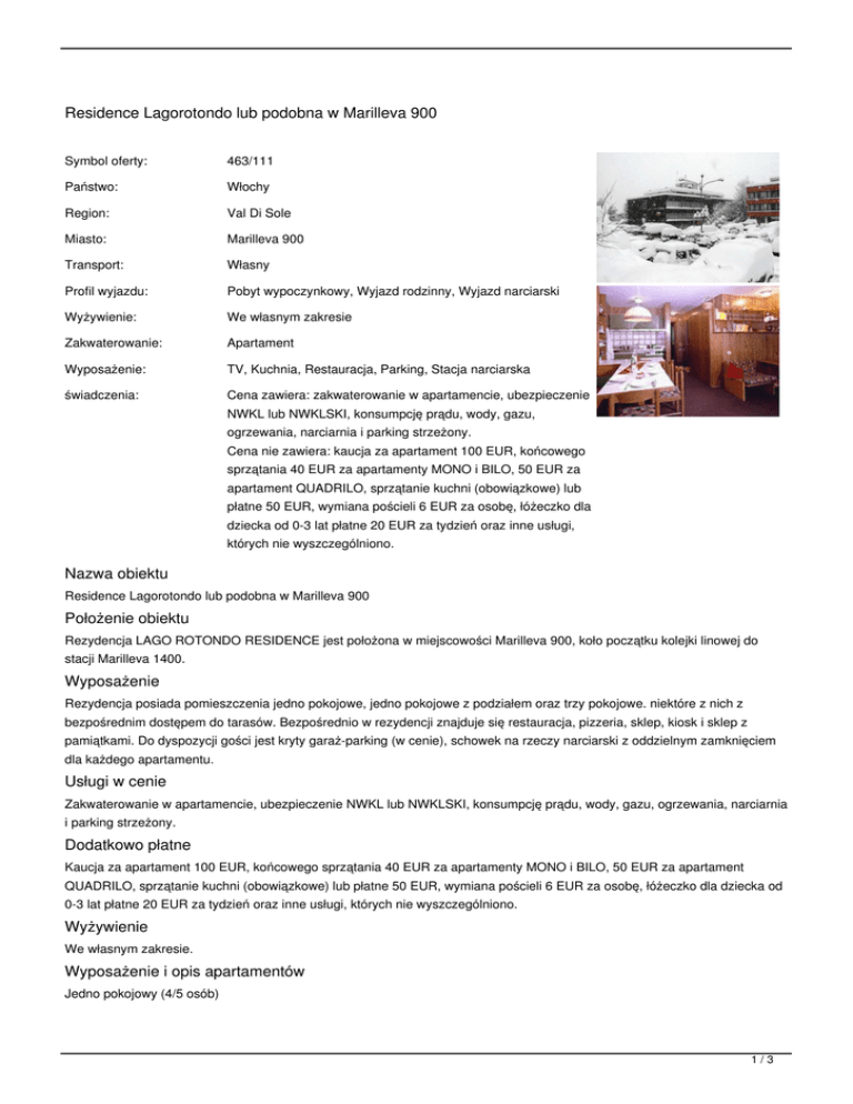 Residence Lagorotondo lub podobna w Marilleva 900 Symbol oferty: 463/111 Państwo: Włochy Region: Val Di Sole Miasto: Marilleva 900 Transport: Własny Profil wyjazdu: Pobyt wypoczynkowy, Wyjazd rodzinny, Wyjazd narciarski Wyżywienie: We własnym zakresie Zakwaterowanie: Apartament Wyposażenie: TV, Kuchnia, Restauracja, Parking, Stacja narciarska świadczenia: Cena zawiera: zakwaterowanie w apartamencie, ubezpieczenie NWKL lub NWKLSKI, konsumpcję prądu, wody, gazu, ogrzewania, narciarnia i parking strzeżony. Cena nie zawiera: kaucja za apartament 100 EUR, końcowego sprzątania 40 EUR za apartamenty MONO i BILO, 50 EUR za apartament QUADRILO, sprzątanie kuchni (obowiązkowe) lub płatne 50 EUR, wymiana pościeli 6 EUR za osobę, łóżeczko dla dziecka od 0-3 lat płatne 20 EUR za tydzień oraz inne usługi, których nie wyszczególniono. Nazwa obiektu Residence Lagorotondo lub podobna w Marilleva 900 Położenie obiektu Rezydencja LAGO ROTONDO RESIDENCE jest położona w miejscowości Marilleva 900, koło początku kolejki linowej do stacji Marilleva 1400. Wyposażenie Rezydencja posiada pomieszczenia jedno pokojowe, jedno pokojowe z podziałem oraz trzy pokojowe. niektóre z nich z bezpośrednim dostępem do tarasów. Bezpośrednio w rezydencji znajduje się restauracja, pizzeria, sklep, kiosk i sklep z pamiątkami. Do dyspozycji gości jest kryty garaż-parking (w cenie), schowek na rzeczy narciarski z oddzielnym zamknięciem dla każdego apartamentu. Usługi w cenie Zakwaterowanie w apartamencie, ubezpieczenie NWKL lub NWKLSKI, konsumpcję prądu, wody, gazu, ogrzewania, narciarnia i parking strzeżony. Dodatkowo płatne Kaucja za apartament 100 EUR, końcowego sprzątania 40 EUR za apartamenty MONO i BILO, 50 EUR za apartament QUADRILO, sprzątanie kuchni (obowiązkowe) lub płatne 50 EUR, wymiana pościeli 6 EUR za osobę, łóżeczko dla dziecka od 0-3 lat płatne 20 EUR za tydzień oraz inne usługi, których nie wyszczególniono. Wyżywienie We własnym zakresie. Wyposażenie i opis apartamentów Jedno pokojowy (4/5 osób) 1/3 Bez podziału, wejście, łazienka z prysznicem, Sofa, podwójne łóżkom pojedyncze łóżko, i część kuchenna. Jedno-dwu pokojowy (4/5 osób) Posiada to wszystko co apartament jedno pokojowy z tym że podwójne łóżko jest oddzielone przez zasuwane drzwi od dziennej części z pojedynczym łóżkiem, narożnikiem i częścią kuchenną. Cztero pokojowy (6/7 osób) Posiada duży pokój dzienny z miejscem kuchennym i pojedynczym łóżkiem. Jest tu łazienka z prysznicem. Dodatkowo mamy pokój z podwójnym łóżkiem i dwa pokoje z dwoma pojedynczymi łóżkami w każdym. Notatka Doskonały obiekt dla narciarzy, polecany dla małych grup i rodzin. Promocja W promocji, rezerwując otrzymasz: - atlas narciarski Europy - mapę tras narciarskich i wyciągów Livigno - zniżkę na obiadokolację w restauracji -10% - zniżkę w wypożyczalni nart -10% - zniżkę na szkolenie narciarskie -10% TERMINY: od: 2017-03-05 do: 2017-03-12 (8 dni), miejsca: zamów cena od: 536 PLN = 123 EUR od: 2017-03-19 do: 2017-03-26 (8 dni), miejsca: zamów cena od: 456 PLN = 105 EUR od: 2017-03-26 do: 2017-04-02 (8 dni), miejsca: zamów cena od: 456 PLN = 105 EUR CENNIK: Długość pobytu: 8 dni 8 dni Grupa cenowa: K7 J7 20 20 153 153 218 218 (-) (-) (-) (-) 174 174 Inne (opcjonalne) łóżeczko dla dziecka 0-2 Bilety karnet narciarski dziecko do 14 lat karnet narciarski 6-dniowy dorosły karnet narciarski dziecko do 7 lat (*) ---bez karnetu narciarskiego--karnet narciarski 6-dniowy senior Pobyt w obiekcie (do wyboru) apartament 6-os.+1 QUADRO typu A standardowo dla osób: 7 656 apartament 6-os. QUADRO typu A standardowo dla osób: 6 656 apartament 3-os. MONO typu A standardowo dla osób: 3 392 (*) apartament 4-os. MONO typu A standardowo dla osób: 4 392 apartament 4-os.+1 BILO typu A standardowo dla osób: 5 434 apartament 4-os. BILO typu A standardowo dla osób: 4 434 Ubezpieczenie (do wyboru) 688 688 466 466 497 497 2/3 ubezpieczenie NW, KL, SKI (*) ubezpieczenie NW, KL Inne (obligatoryjne) (*) atlas narciarski Europy z mapami PROMOCJA Ubezpieczenie (opcjonalne) ubezpieczenie kosztów rezygnacji 12 12 7 7 (-) (-) 3% 3% Waluta: EUR Aktualne ceny z systemu S.A.R.T. (-) - cena usługi, podatku kalkulowana przy osobie lub gratis (*) - kwota wliczona w cenę standardową 3/3