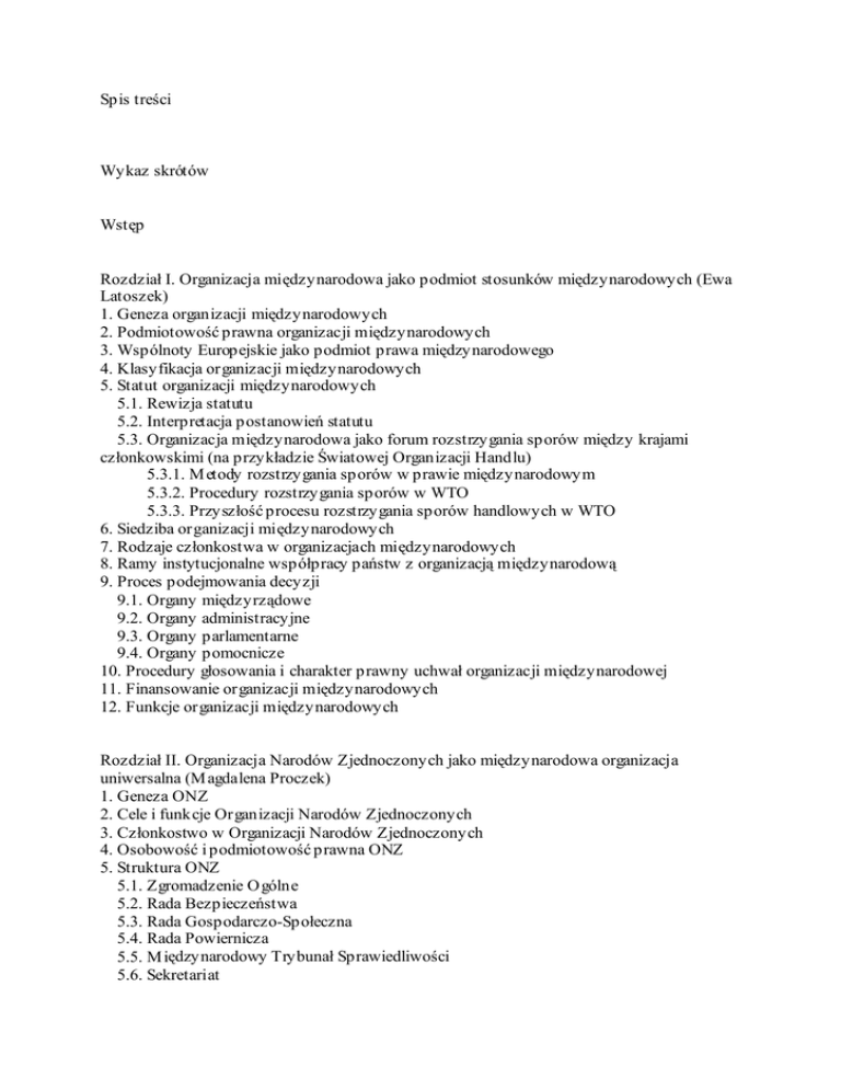 Spis treści Wykaz skrótów Wstęp Rozdział I. Organizacja międzynarodowa jako podmiot stosunków międzynarodowych (Ewa Latoszek) 1. Geneza organizacji międzynarodowych 2. Podmiotowość prawna organizacji międzynarodowych 3. Wspólnoty Europejskie jako podmiot prawa międzynarodowego 4. Klasyfikacja organizacji międzynarodowych 5. Statut organizacji międzynarodowych 5.1. Rewizja statutu 5.2. Interpretacja postanowień statutu 5.3. Organizacja międzynarodowa jako forum rozstrzygania sporów między krajami członkowskimi (na przykładzie Światowej Organizacji Handlu) 5.3.1. M etody rozstrzygania sporów w prawie międzynarodowym 5.3.2. Procedury rozstrzygania sporów w WTO 5.3.3. Przyszłość procesu rozstrzygania sporów handlowych w WTO 6. Siedziba organizacji międzynarodowych 7. Rodzaje członkostwa w organizacjach międzynarodowych 8. Ramy instytucjonalne współpracy państw z organizacją międzynarodową 9. Proces podejmowania decyzji 9.1. Organy międzyrządowe 9.2. Organy administracyjne 9.3. Organy parlamentarne 9.4. Organy pomocnicze 10. Procedury głosowania i charakter prawny uchwał organizacji międzynarodowej 11. Finansowanie organizacji międzynarodowych 12. Funkcje organizacji międzynarodowych Rozdział II. Organizacja Narodów Zjednoczonych jako międzynarodowa organizacja uniwersalna (M agdalena Proczek) 1. Geneza ONZ 2. Cele i funkcje Organizacji Narodów Zjednoczonych 3. Członkostwo w Organizacji Narodów Zjednoczonych 4. Osobowość i podmiotowość prawna ONZ 5. Struktura ONZ 5.1. Zgromadzenie O gólne 5.2. Rada Bezpieczeństwa 5.3. Rada Gospodarczo-Społeczna 5.4. Rada Powiernicza 5.5. M iędzynarodowy Trybunał Sprawiedliwości 5.6. Sekretariat 5.7. M iędzynarodowy Trybunał Karny 6. Finansowanie działalności ONZ 7. Działalność ONZ 8. Współpraca ONZ z organizacjami międzynarodowymi 9. Polska w ONZ Rozdział III. System NZ - wybrane organizacje wyspecjalizowane NZ (M agdalena Proczek) 1. M iędzynarodowa Organizacja Lotnictwa Cywilnego 1.1. Geneza ICAO 1.2. Cele i funkcje ICAO 1.3. Członkostwo w ICAO 1.4. Struktura ICAO 1.5. BudŜet ICAO 1.6. Działalność ICAO 1.7. Współpraca ICAO z organizacjami międzynarodowymi 1.8. Polska w ICAO 2. Światowa Organizacja Zdrowia 2.1. Geneza WHO 2.2. Cele i funkcje WHO 2.3. Członkostwo w WHO 2.4. Struktura WHO 2.5. Środki finansowe WHO 2.6. Działalność WHO 2.7. Współpraca WHO z organizacjami międzynarodowymi 2.8. Polska w WHO 3. Organizacja Narodów Zjednoczonych do Spraw Oświaty, Nauki i Kultury 3.1. Geneza UNESCO 3.2. Cele i funkcje UNESCO 3.3. Członkostwo w UNESCO 3.4. Struktura UNESCO 3.5. Źródła finansowania UNESCO 3.6. Działalność UNESCO 3.7. Współpraca UNESCO z organizacjami międzynarodowymi 3.8. Polska w UNESCO Rozdział IV. Od Układu Ogólnego w Sprawie Taryf Celnych i Handlu do Światowej Organizacji Handlu (M agdalena Proczek) 1. Układ Ogólny w Sprawie Taryf Celnych i Handlu 1.1. Geneza GATT 1.2. Cele i funkcje GATT 1.3. Członkostwo w GATT 1.4. Struktura GATT 1.5. Środki finansowe GATT 1.6. Działalność GATT 1.7. Polska w GATT 2. Światowa Organizacja Handlu 2.1. Powstanie WTO 2.2. Cele i funkcje WTO 2.3. Członkostwo w WTO 2.4. Struktura WTO 2.5. Środki finansowe WTO 2.6. Działalność WTO 2.7. Współpraca WTO z organizacjami międzynarodowymi 2.8. Polska w WTO Rozdział V. M iędzynarodowy Fundusz Walutowy i jego rola w rozwiązywaniu problemów gospodarczych (M agdalena Proczek) 1. Geneza MFW 2. Rewizje statutu M FW 3. Cele i funkcje M FW 4. Członkostwo w MFW 5. Struktura M FW 6. M echanizm podejmowania decyzji w M FW 7. Środki finansowe M FW 8. Działalność M FW 9. Współpraca M FW z organizacjami międzynarodowymi 10. Polska w M FW Rozdział VI. Bank Światowy jako instytucja globalna o charakterze finansowym (Ewa Latoszek) 1. Geneza M iędzynarodowego Banku Odbudowy i Rozwoju 2. Cele statutowe Banku Światowego i jego funkcje 3. Członkostwo w Banku Światowym 4. Struktura Banku 5. Kapitał Banku Światowego 5.1. Kapitał zakładowy 5.2. Fundusze własne 6. Warunki i zasady udzielania poŜyczek przez M iędzynarodowy Bank Odbudowy i Rozwoju 7. Program małych grantów 8. Współpraca Banku Światowego z innymi organizacjami 8.1. Grupa Banku Światowego 8.1.1. M iędzynarodowa Korporacja Finansowa 8.1.2. M iędzynarodowe Stowarzyszenie Rozwoju 8.1.3. M iędzynarodowa Agencja ds. Dysput Inwestycyjnych 8.1.4. Wielostronna Agencja Gwarancji Inwestycji 8.2. M iędzynarodowy Fundusz Walutowy a Bank Światowy 9. Działalność Banku Światowego oraz strategie współpracy z Polską 9.1. Główne kierunki działalności M iędzynarodowego Banku Odbudowy i Rozwoju 9.2. Działalność Banku Światowego w Polsce 9.2.1. Cele działalności Banku Światowego w Polsce 9.2.2. Główne obszary współpracy Banku Światowego w Polsce w latach 1990-1996 9.2.3. Główne dziedziny działalności Banku Światowego w Polsce w latach 1997-1999 9.2.4. Kierunki współpracy Polski z M iędzynarodowym Bankiem Odbudowy i Rozwoju w latach 2000-2004 9.2.5. Strategia Partnerstwa dla Polski na lata 2005-2007 9.2.6. Bariery absorpcji poŜyczek Banku Światowego w Polsce Rozdział VII. Europejski Bank Odbudowy i Rozwoju - źródło finansowania dla krajów Europy Środkowej i Wschodniej (Ewa Latoszek) 1. Geneza Europejskiego Banku Odbudowy i Rozwoju 2. Cele i funkcje Banku 3. Członkostwo w EBOR 4. M echanizm podejmowania decyzji w EBOR 5. Polityka finansowa Europejskiego Banku Odbudowy i Rozwoju 5.1. Zasoby kapitałowe EBOR 5.1.1. Kapitał akcyjny Banku 5.1.2. Fundusze specjalne 5.2. Instrumenty finansowe stosowane przez EBOR 5.2.1. Zasady udzielania poŜyczek przez Bank 5.2.2. Inwestycje kapitałowe Banku 5.2.3. Gwarancje EBOR 5.2.4. Inwestycje Banku w akcje i udziały 5.3. Zasady finansowania projektów przez EBOR 5.4. Sposoby współfinansowania 5.5. Procedury akceptacji i oceny wyników w EBOR 5.6. Współudział w finansowaniu projektów 5.7. Fundusze pomocy technicznej jako 