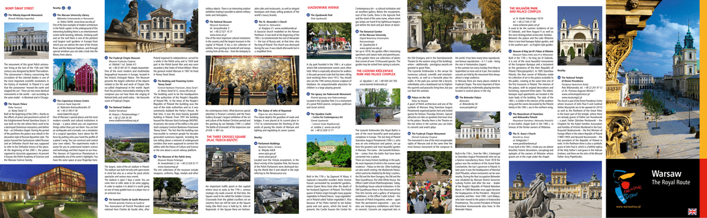 NOWY ŚWIAT STREET Nearby: The Mikołaj Kopernik Monument (Pomnik Mikołaja Kopernika) – military objects. There is an interesting outdoor exhibition making it possible to admire military tanks and helicopters. The Warsaw University Library (Biblioteka Uniwersytecka w Warszawie) ul. Dobra 56/66, www.buw.uw.edu.pl One of the best examples of modern architecture in the Polish capital. In the underground of this interesting building there is an entertainment centre (with bowling, billiards, climbing wall) and on the roof there is one of the prettiest and largest roof gardens in Europe from which you can admire the view of the Vistula River and the National Stadium, and through special windows you can take a look into the library from above. The Fryderyk Chopin Museum The monument of this great Polish astronomer living at the turn of the 15th and 16th century was designed by Bertel Thorvaldsen. The astronomer’s theory concerning the circulation of the celestial bodies is one of the most important scientific revolutions in the history of mankind. In Poland it is said that the astronomer ‘moved the earth and stopped the sun’. There are two more identical monuments in the world – cast according to the same model – in Montreal and in Chicago. The Staszic Palace (Pałac Staszica) ul. Nowy Świat 72 Built at the beginning of the 20th c. thanks to the efforts of priest and prominent activist of the Enlightenment Period Stanisław Staszic. It was built on the site where there used to be a destroyed Dominican monastery and before that – an Orthodox chapel. During the period of the partitions the palace was rebuilt in the decorative style of Russian-Byzantine style. The palace housed the Gymnasium called Russian and an Orthodox church that was supposed to refer to the Orthodox history of the place. At the beginning of the 20th c. the palace regained its classicistic appearance. At present it houses the Polish Academy of Sciences and the Warsaw Science Society. The Copernicus Science Centre (Muzeum Fryderyka Chopina) ul. Okólnik 1 (ul. Tamka 41) tel. +48 22 441 62 51, chopin.museum/en One of the most modern and multimedia biographical museums in Europe, located in the historic Ostrogski Palace. The Museum presents the largest collection of the objects related to the life and work of Chopin (the so-called chopiniana) in the world. Apart from the priceless memorabilia relating to the composer you can hear there the singing of Nohant birds and smell violas – the favourite scent of Fryderyk Chopin. (Centrum Nauki Kopernik) ul. Wybrzeże Kościuszkowskie 20 tel. +48 22 596 41 00 www.kopernik.org.pl One of Warsaw’s special places and the most modern scientific and cultural institutions in Europe – a place where you can experience things rather than just see them. You can feel an earthquake and a tornado, run a simulation of a surgical operation, learn about the lift force by putting onto your hand the profile of a plane’s wing. You can construct and control your own robots. The experiments make it easier for you to understand modern science and technology and their impact on our lives. The Heaven of Copernicus Planetarium is undoubtedly one of the centre’s highlights. You have the outer space at your fingertips here. The National Stadium (Stadion Narodowy) Al. Księcia J. Poniatowskiego 1 tel. +48 22 295 95 95 www.stadionnarodowy.org.pl (Muzeum Narodowe) The General Charles de Gaulle Monument (Pomnik generała Charlesa de Gaulle’a) The monument of French President and national hero Charles de Gaulle who, after (Park Ujazdowski) (Kościół św. Aleksandra) THE WILANÓW PARK AND PALACE COMPLEX Contemporary Art – a cultural institution and an excellent gallery. Below the escarpment, east of the Castle, there is the Agricola Park and the street of the same name, where street gas lamps are hand lit by lighthouse keepers just before the dusk and put down at dawn. A city park founded in the 19th c. at a place where folk entertainment events were often held. What is especially attractive for walkers is the park personal scale that has been sitting (and working) there since 1912. You should also see the 19th century bronze sculpture of Gladiator. An unquestionable attraction for children is a large playing ground. (Centrum Bankowo–Finansowe „Nowy Świat’) ul. Nowy Świat 6/12, www.cbf.com.pl The building used to be the headquarters of the authorities of the People’s Republic of Poland PRL. In the times of the People’s Republic of Poland the building was the seat of the state authorities and so it was commonly dubbed the Party’s House. At that time, it was the most heavily guarded building in Poland. From 1991 the building housed the Warsaw Stock Exchange (WGPW). At present, the owner of the edifice is the joint stock company Centrum Bankowo-Finansowe ‘Nowy Świat’. The fact that the building was inaccessible to common people for decades generated numerous legends, including the one telling about a network of underground corridors that were supposed to connect the edifice with the Palace of Culture and Science or the one about a secret railway platform. The Ujazdowski Park ul. Książęca 21, www.swaleksander.pl A classicist church modelled on the Roman Pantheon. It was built at the beginning of the 19th c. to commemorate the visit of Alexander I – the tsar of Russia and, at that time, also the king of Poland. The church was destroyed during the war. It was rebuilt afterwards but in a simplified form. The Banking and Financing Centre ‘Nowy Świat’ Poland regained its independence, served for a while in the Polish army and in 1920 took part in the Polish-Soviet War and was even awarded a War Order of Virtuti Militari. When the general visited Warsaw in 1967 he lived in Nowy Świat Street. The Botanical Garden of the Warsaw University (Ogród Botaniczny Uniwersytetu Warszawskiego) Al. Ujazdowskie 4 www.ogrod.uw.edu.pl Set up in 1818, the garden offers interesting speci