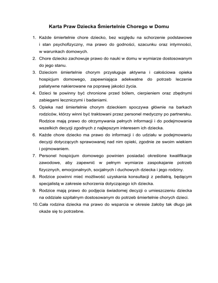Karta Praw Dziecka Śmiertelnie Chorego w Domu 1. Każde śmiertelnie chore dziecko, bez względu na schorzenie podstawowe i stan psychofizyczny, ma prawo do godności, szacunku oraz intymności, w warunkach domowych. 2. Chore dziecko zachowuje prawo do nauki w domu w wymiarze dostosowanym do jego stanu. 3. Dzieciom śmiertelnie chorym przysługuje aktywna i całościowa opieka hospicjum domowego, zapewniająca adekwatne do potrzeb leczenie paliatywne nakierowane na poprawę jakości życia. 4. Dzieci te powinny być chronione przed bólem, cierpieniem oraz zbędnymi zabiegami leczniczymi i badaniami. 5. Opieka nad śmiertelnie chorym dzieckiem spoczywa głównie na barkach rodziców, którzy winni być traktowani przez personel medyczny po partnersku. Rodzice mają prawo do otrzymywania pełnych informacji i do podejmowania wszelkich decyzji zgodnych z najlepszym interesem ich dziecka. 6. Każde chore dziecko ma prawo do informacji i do udziału w podejmowaniu decyzji dotyczących sprawowanej nad nim opieki, zgodnie ze swoim wiekiem i pojmowaniem. 7. Personel hospicjum domowego powinien posiadać określone kwalifikacje zawodowe, aby zapewnić w pełnym wymiarze zaspokajanie potrzeb fizycznych, emocjonalnych, socjalnych i duchowych dziecka i jego rodziny. 8. Rodzice powinni mieć możliwość uzyskania konsultacji z pediatrą, będącym specjalistą w zakresie schorzenia dotyczącego ich dziecka. 9. Rodzice mają prawo do podjęcia świadomej decyzji o umieszczeniu dziecka na oddziale szpitalnym dostosowanym do potrzeb śmiertelnie chorych dzieci. 10. Cała rodzina dziecka ma prawo do wsparcia w okresie żałoby tak długo jak okaże się to potrzebne.