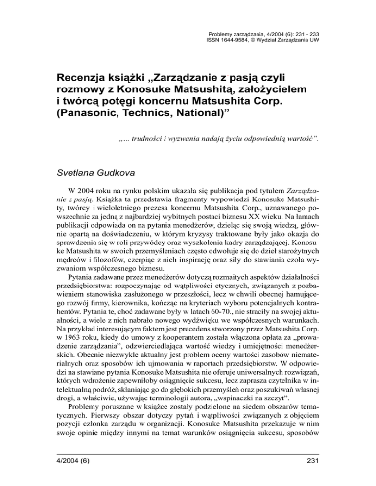 Problemy zarządzania, 4/2004 (6): 231 - 233 ISSN 1644-9584, © Wydział Zarządzania UW Recenzja książki „Zarządzanie z pasją czyli rozmowy z Konosuke Matsushitą, założycielem i twórcą potęgi koncernu Matsushita Corp. (Panasonic, Technics, National)” „... trudności i wyzwania nadają życiu odpowiednią wartość”. Svetlana Gudkova W 2004 roku na rynku polskim ukazała się publikacja pod tytułem Zarządzanie z pasją. Książka ta przedstawia fragmenty wypowiedzi Konosuke Matsushity, twórcy i wieloletniego prezesa koncernu Matsushita Corp., uznawanego powszechnie za jedną z najbardziej wybitnych postaci biznesu XX wieku. Na łamach publikacji odpowiada on na pytania menedżerów, dzieląc się swoją wiedzą, głównie opartą na doświadczeniu, w którym kryzysy traktowane były jako okazja do sprawdzenia się w roli przywódcy oraz wyszkolenia kadry zarządzającej. Konosuke Matsushita w swoich przemyśleniach często odwołuje się do dzieł starożytnych mędrców i filozofów, czerpiąc z nich inspirację oraz siły do stawiania czoła wyzwaniom współczesnego biznesu. Pytania zadawane przez menedżerów dotyczą rozmaitych aspektów działalności przedsiębiorstwa: rozpoczynając od wątpliwości etycznych, związanych z pozbawieniem stanowiska zasłużonego w przeszłości, lecz w chwili obecnej hamującego rozwój firmy, kierownika, kończąc na kryteriach wyboru potencjalnych kontrahentów. Pytania te, choć zadawane były w latach 60-70., nie straciły na swojej aktualności, a wiele z nich nabrało nowego wydźwięku we współczesnych warunkach. Na przykład interesującym faktem jest precedens stworzony przez Matsushita Corp. w 1963 roku, kiedy do umowy z kooperantem została włączona opłata za „prowadzenie zarządzania”, odzwierciedlająca wartość wiedzy i umiejętności menedżerskich. Obecnie niezwykle aktualny jest problem oceny wartości zasobów niematerialnych oraz sposobów ich ujmowania w raportach przedsiębiorstw. W odpowiedzi na stawiane pytania Konosuke Matsushita nie oferuje uniwersalnych rozwiązań, których wdrożenie zapewniłoby osiągnięcie sukcesu, lecz zaprasza czytelnika w intelektualną podróż, skłaniając go do głębokich przemyśleń oraz poszukiwań własnej drogi, a właściwie, używając terminologii autora, „wspinaczki na szczyt”. Problemy poruszane w książce zostały podzielone na siedem obszarów tematycznych. Pierwszy obszar dotyczy pytań i wątpliwości związanych z objęciem pozycji członka zarządu w organizacji. Konosuke Matsushita przekazuje w nim swoje opinie między innymi na temat warunków osiągnięcia sukcesu, sposobów 4/2004 (6) 231 Svetlana Gudkova rozwoju zdolności przywódczych, rozwiązywania konfliktów oraz ewolucji postaw lidera w miarę rozwoju firmy. Jego zdaniem podstawą sukcesu menedżerów jest pasja, której niezwykła siła udziela się pracownikom oraz pobudza ich do aktywnego działania. Istotne znaczenie ma również misja przedsiębiorstwa, która pozwala zjednoczyć zespół wokół realizacji wytyczonego celu. Lider, zdaniem Matsushity, powinien mieć także umiejętność spojrzenia na siebie z zewnątrz, oceniając skuteczność własnych działań oraz być przygotowanym na odejście we właściwym momencie. Drugi obszar tematyczny dotyczy podstawowych zasad postępowania menedżera. Konosuke Matsushita zwraca szczególną uwagę na stworzenie solidnej filozofii zarządzania, która powinna odzwierciedlać korzyści płynące dla otoczenia z działalności przedsiębiorstwa oraz służyć jako podstawa do podejmowania decyzji o strategicznym znaczeniu. Ma ona swoje korzenie w sposobie postrzegania oraz rozumienia otaczającego świata przez menedżera. Filozofia zarządzania wyznawana przez Matsushitę znalazła swoje odzwierciedlenie w 1932 roku w misji firmy Matsushita Electric Co., która brzmiała następująco: „walka z biedą i wzbogacenie społeczeństwa, w sensie materialnym i duchowym, poprzez dostarczanie ludziom naszych wyrobów”. Autor wskazuje również na konieczność prowadzenia przedsiębiorstwa w harmonii ze społeczeństwem, oferując swój wkład w rozwój kraju poprzez wypracowanie „uczciwego zysku”. W trzecim rozdziale znalazły się wypowiedzi dotyczące kształtowania relacji kadry menedżerskiej z pracownikami. Matsushita wyjaśnia w nim, między innymi, podstawowe zasady, którymi powinien kierować się przywódca, pragnący zjednoczyć ludzi w celu realizacji wspólnej misji. Kluczowe znaczenie ma tu prawdziwa pasja menedżera, która daje energię do „rozsiewania iskierek” entuzjazmu wśród pracowników oraz inspiruje ich do podejmowania wyzwań. Siła motywacji, zdaniem Matsushity, jest uzależniona przede wszystkim od przekonania i poświęcenia lidera. Ważne jest również zapobieganie tendencji do bezosobowości, narastającej w przedsiębiorstwie w miarę jego rozwoju. W rozdziale można znaleźć także opinie Matsushity dotyczące kryteriów wyboru oraz sposobów „wychowywania” następcy, reakcji na błędy popełniane przez pracowników oraz zatrudnienia na wysokie stanowiska osób z zewnątrz organizacji. Zapobieganie procesowi starzenia się przedsiębiorstwa oraz sposoby stymulowania jego rozwoju stały się tematem wypowiedzi zawartych w czwartym rozdziale. Konosuke Matsushita ponownie zwraca uwagę czytelnika na szczególną rolę, jaką powinien pełnić przywódca w organizacji, służąc przykładem dla pracowników oraz wyznaczając priorytetowe kierunki działania. To właśnie aktywna postawa lidera zapobiega stagnacji przedsiębiorstwa. Matsushita podkreśla, że organizacje powinny unikać wielokrotnego powielania opracowanych w przeszłości rozwiązań, motywując podwładnych do ciągłego poszukiwania nowych możliwości rozwoju, tak aby nie stracili oni swojego zapału i zaangażowania. Ważne jest również przedstawianie pracownikom efektów ich pracy. Satysfakcja z własnych dokona