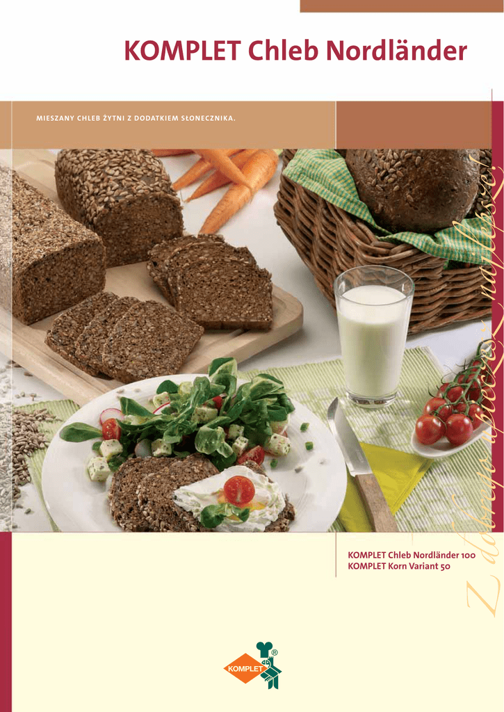 KOMPLET Chleb Nordländer M I E SZANY C H LEB ŻY TN I Z DODATKI E M S ŁON E CZN I KA . KOMPLET Chleb Nordländer 100 KOMPLET Korn Variant 50 Ciemny chleb z KOMPLETu KOMPLET Korn Variant 50 KOMPLET Chleb Nordländer 100 Skoncentrowana mieszanka do produkcji drobnych wypieków, ciemnych bułek i bagietek słodowych, chleba z kminkiem i Nordländera. Mieszanka do produkcji oryginalnego mieszanego chleba żytniego o intensywnym smaku sodu żytniego. Zawiera ziarna słonecznika. Chleb Nordländer Chleb Nordländer zaczyn z KOMPLET Korn Variant 50 27 x 0,6 kg 5,000 kg (patrz: receptura podstawowa) KOMPLET Nordländer 100 mąka pszenna, typ 550 mąka żytnia, typ 997 lub 1150 woda drożdże sól słonecznik łuskany łączna ilość 1,250 kg 1,250 kg 1,150 kg ok. 0,100 kg 0,100 kg 1,150 kg ok. 10,000 kg drożdże woda 10,000 kg 0,300 kg 6,200 kg łączna ilość 16,500 kg Wykonanie: Połaczyć składniki, wyrobić ciasto i odstawić do spoczynku. Wykonanie: czas miesienia: Składniki połączyć i wyrobić ciasto. Uwaga: ziarna słonecznika dodać pod koniec zagniatania. Po wyrobieniu ciasto odstawić do garowania. (miesiarka spiralna) czas miesienia: (miesiarka spiralna lub podnosząca) czas gary: 10 minut – pierwszy bieg 10 minut – drugi bieg 30 minut Następnie ciasto rozważyć, uformować bochenki, zwilżyć, obtoczyć w ziarnach słonecznika, włożyć do foremek i odstawić do garowania. czas gary: temp. pieczenia: czas pieczenia: temp. ciasta: czas gary: 15 minut – pierwszy bieg 5 minut – drugi bieg 27 ºC 30 minut Następnie ciasto rozważyć, uformować bochenki, zwilżyć, obtoczyć w ziarnach słonecznika, włożyć do foremek i odstawić do garowania. naważka: temp. pieczenia: czas pieczenia: 30-40 minut (zależy od temp. ciasta) 240 ºC spadająca do 200 ºC 60-70 minut Zaczyn Korn Variant 0,6 kg 240 ºC spadająca do 200 ºC 45 minut RADA MISTRZA OBFITE OBSYPANIE BOCHENKÓW ZIARNEM SŁONECZNIKA PRZED UPIECZENIEM ZAPEWNI WYJĄTKOWY WYGLĄD CHLEBA. receptura podstawowa KOMPLET Korn Variant 50 woda (50 ºC) Z łączna ilość Wykonanie: 2,500 kg 2,500 kg dobrego upieczesz najlepsze! 5,000 kg KOMPLET Korn Variant 50 rozrobić z goracą wodą. KOMPLET Polska ul. Chlebowa 2 · 62-080 Tarnowo Podgórne tel. +4861/8967100 · fax +4861/8967101 [email protected] · www.komplet.pl