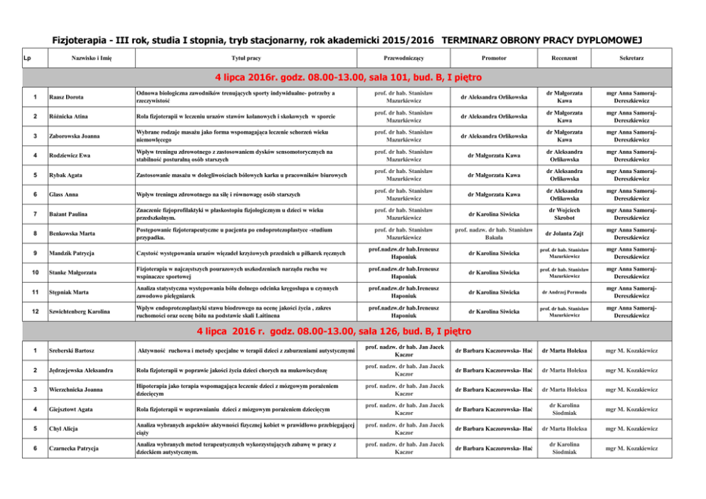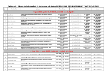 Fizjoterapia - III rok, studia I stopnia, tryb stacjonarny, rok akademicki 2015/2016 TERMINARZ OBRONY PRACY DYPLOMOWEJ Lp Nazwisko i Imię Tytuł pracy Przewodniczący Promotor Recenzent Sekretarz 4 lipca 2016r. godz. 08.00-13.00, sala 101, bud. B, I piętro 1 Raasz Dorota Odnowa biologiczna zawodników trenujących sporty indywidualne- potrzeby a rzeczywistość prof. dr hab. Stanisław Mazurkiewicz dr Aleksandra Orlikowska dr Małgorzata Kawa mgr Anna SamorajDereszkiewicz 2 Różnicka Atina Rola fizjoterapii w leczeniu urazów stawów kolanowych i skokowych w sporcie prof. dr hab. Stanisław Mazurkiewicz dr Aleksandra Orlikowska dr Małgorzata Kawa mgr Anna SamorajDereszkiewicz 3 Zaborowska Joanna Wybrane rodzaje masażu jako forma wspomagająca leczenie schorzeń wieku niemowlęcego prof. dr hab. Stanisław Mazurkiewicz dr Aleksandra Orlikowska dr Małgorzata Kawa mgr Anna SamorajDereszkiewicz 4 Rodziewicz Ewa Wpływ treningu zdrowotnego z zastosowaniem dysków sensomotorycznych na stabilność posturalną osób starszych prof. dr hab. Stanisław Mazurkiewicz dr Małgorzata Kawa dr Aleksandra Orlikowska mgr Anna SamorajDereszkiewicz 5 Rybak Agata Zastosowanie masażu w dolegliwościach bólowych karku u pracowników biurowych prof. dr hab. Stanisław Mazurkiewicz dr Małgorzata Kawa dr Aleksandra Orlikowska mgr Anna SamorajDereszkiewicz 6 Glass Anna Wpływ treningu zdrowotnego na siłę i równowagę osób starszych prof. dr hab. Stanisław Mazurkiewicz dr Małgorzata Kawa dr Aleksandra Orlikowska mgr Anna SamorajDereszkiewicz 7 Bażant Paulina Znaczenie fizjoprofilaktyki w płaskostopiu fizjologicznym u dzieci w wieku przedszkolnym. prof. dr hab. Stanisław Mazurkiewicz dr Karolina Siwicka dr Wojciech Skrobot mgr Anna SamorajDereszkiewicz 8 Benkowska Marta Postępowanie fizjoterapeutyczne u pacjenta po endoprotezoplastyce -studium przypadku. prof. dr hab. Stanisław Mazurkiewicz prof. nadzw. dr hab. Stanisław Bakuła dr Jolanta Zajt mgr Anna SamorajDereszkiewicz 9 Mandzik Patrycja Częstość występowania urazów więzadeł krzyżowych przednich u piłkarek ręcznych prof.nadzw.dr hab.Ireneusz Haponiuk dr Karolina Siwicka prof. dr hab. Stanisław Mazurkiewicz mgr Anna SamorajDereszkiewicz 10 Stanke Małgorzata Fizjoterapia w najczęstszych pourazowych uszkodzeniach narządu ruchu we wspinaczce sportowej prof.nadzw.dr hab.Ireneusz Haponiuk dr Karolina Siwicka prof. dr hab. Stanisław Mazurkiewicz mgr Anna SamorajDereszkiewicz 11 Stępniak Marta Analiza statystyczna występowania bólu dolnego odcinka kręgosłupa u czynnych zawodowo pielęgniarek prof.nadzw.dr hab.Ireneusz Haponiuk dr Karolina Siwicka dr Andrzej Permoda mgr Anna SamorajDereszkiewicz 12 Szwichtenberg Karolina Wplyw endoprotezoplastyki stawu biodrowego na ocenę jakości życia , zakres ruchomości oraz ocenę bólu na podstawie skali Laitinena prof.nadzw.dr hab.Ireneusz Haponiuk dr Karolina Siwicka prof. dr hab. Stanisław Mazurkiewicz mgr Anna SamorajDereszkiewicz 4 lipca 2016 r. godz. 08.00-13.00, sala 126, bud. B, I piętro 1 Sreberski Bartosz Aktywność ruchowa i metody specjalne w terapii dzieci z zaburzeniami autystycznymi prof. nadzw. dr hab. Jan Jacek Kaczor dr Barbara Kaczorowska- Hać dr Marta Holeksa mgr M. Kozakiewicz 2 Jędrzejewska Aleksandra Rola fizjoterapii w poprawie jakości życia dzieci chorych na mukowiscydozę prof. nadzw. dr hab. Jan Jacek Kaczor dr Barbara Kaczorowska- Hać dr Marta Holeksa mgr M. Kozakiewicz 3 Wierzchnicka Joanna Hipoterapia jako terapia wspomagająca leczenie dzieci z mózgowym porażeniem dziecięcym prof. nadzw. dr hab. Jan Jacek Kaczor dr Barbara Kaczorowska- Hać dr Marta Holeksa mgr M. Kozakiewicz 4 Giejsztowt Agata Rola fizjoterapii w usprawnianiu dzieci z mózgowym porażeniem dziecięcym prof. nadzw. dr hab. Jan Jacek Kaczor dr Barbara Kaczorowska- Hać dr Karolina Siodmiak mgr M. Kozakiewicz 5 Chyl Alicja Analiza wybranych aspektów aktywności fizycznej kobiet w prawidłowo przebiegającej ciąży prof. nadzw. dr hab. Jan Jacek Kaczor dr Barbara Kaczorowska- Hać dr Marta Holeksa mgr M. Kozakiewicz 6 Czarnecka Patrycja Analiza wybranych metod terapeutycznych wykorzystujących zabawę w pracy z dzieckiem autystycznym. prof. nadzw. dr hab. Jan Jacek Kaczor dr Barbara Kaczorowska- Hać dr Karolina Siodmiak mgr M. Kozakiewicz 7 Dudek Aleksandra Dogoterapia jako terapia wspomagająca rehabilitację dzieci chorych na autyzm prof. nadzw. dr hab. Jan Jacek Kaczor dr Barbara Kaczorowska- Hać dr Karolina Siodmiak mgr M. Kozakiewicz 8 Antoniuk Adrianna Znaczenie aktywności fizycznej w profilaktyce i leczeniu otyłości u dzieci i młodzieży prof. nadzw. dr hab. Jan Jacek Kaczor dr Barbara Kaczorowska- Hać dr Marta Holeksa mgr M. Kozakiewicz 9 Mełgieś Anna Szkoła rodzenia jako miejsce fizjoprofilaktyki kobiety w ciąży prof. nadzw. dr hab. Jan Jacek Kaczor dr Barbara Kaczorowska- Hać dr Karolina Siodmiak mgr M. Kozakiewicz 10 Nowakowska Adrianna Asymetria w obrębie tułowia w płaszczyźnie czołowej wśród dzieci 6-letnich prof. nadzw. dr hab. Jan Jacek Kaczor dr Barbara Kaczorowska- Hać dr Karolina Siodmiak mgr M. Kozakiewicz 11 Kwaśniak Natalia prof. nadzw. dr hab. Jan Jacek Kaczor prof. Stanisław Bakuła dr Jolanta Zajt mgr M. Kozakiewicz 12 Dudzińska Agnieszka prof. nadzw. dr hab. Jan Jacek Kaczor prof. nadzw. dr hab. Stanisław Bakuła dr Jolanta Zajt mgr M. Kozakiewicz 13 Magier Marta Wybrane urazy stawu barkowego u osób trenujących pływanie prof. nadzw. dr hab. Jan Jacek Kaczor prof. dr hab. Stanisław Mazurkiewicz dr Andrzej Permoda mgr M. Kozakiewicz 14 May-Maciejewski Maciej Wpływ zmian przepisów wprowadzonych przez Międzynarodową Federację Narciarską (FIS) w latach 2005-2016 na ilość i rodzaj kontuzji u zawodników Pucharu Świata w narciarstwie alpejskim prof. nadzw. dr hab. Jan Jacek Kaczor dr Tomasz Grzywacz prof. nadzw. dr hab. Radosław Laskowski mgr M. Kozakiewicz 15 Pellowski Robert Ruchomośc odcinka piersiowo-lędzwiwego kręgos