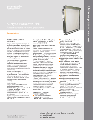 Automatyczna kurtyna pożarowa Dane techniczne PRZEZNACZENIE KURTYNY POŻAROWEJ Kurtyna pożarowa przeznaczona jest do wydzielenia określonego obszaru i miejsca pojawienia się ognia oraz uniemożliwia jego dalsze rozprzestrzenianie się na inne obszary. Kurtyna pożarowa stosowana jest tam, gdzie w przypadku wybuchu pożaru konieczne jest stworzenie tymczasowej bariery w otworze. Bariera taka powinna pozostawać niewidoczna w normalnych warunkach użytkowania. KURTYNA POŻAROWA COLT FM1 Kurtyna pożarowa Colt FM1 charakteryzuje się niską wagą i minimalnymi wymiarami, co umożliwia jej łatwe instalowanie w ograniczonych przestrzeniach, na przykład powyżej sufitu podwieszanego. Kurtyna pożarowa Colt FM1 automatycznie rozwija się w przypadku otrzymania sygnału z centrali sygnalizacji pożaru lub w przypadku przerwania zasilania. Po skasowaniu sygnału, kurtyna automatycznie powraca do pozycji zwiniętej. KLASYFIKACJA Kurtyna pożarowa Colt FM1 została przetestowana według normy PN-EN 1634-1 i uzyskała klasyfikację E 60, E 120 lub E 180, zgodnie z normą PN-EN 13501-2:2007, tym samym uzyskując szczelność ogniową 60, 120 lub 180 minut. Uzyskała ona pomyślne wyniki w testach trwałości (10 000 cykli), zgodnie z normą DIN 4102-18. “Colt” and the Colt logo are registered trademarks of Colt International Licensing Limited. © Colt International Licensing Limited 2012. Materiały kurtyn E 120 i E 180 uzyskują również klasyfikację EW 30, zgodnie z normą PN-EN 13501-2. JAK DZIAŁA KURTYNA POŻAROWA COLT FM1? Kurtyna pożarowa wyposażona jest w nawinięty na wałek elastyczny materiał odporny na działanie wysokiej temperatury, który jest nieprzepuszczalny dla dymu i gorących gazów. Wewnątrz wałka znajduje się silnik elektryczny, który w stanie spoczynku utrzymuje kurtynę zwiniętą na poziomie sufitu. Po otrzymaniu sygnału z systemu wykrywania pożaru lub w przypadku przerwy w zasilaniu, kurtyna automatycznie rozwija się w kontrolowany sposób, pod wpływem siły grawitacji, co zapewnia jej działanie w każdych warunkach. Przy dolnej krawędzi kurtyny zamontowana jest listwa obciążająca, która zapewnia rozwinięcie kurtyny i jej właściwe położenie oraz estetyczny wygląd w pozycji zwiniętej. Metalowe prowadnice boczne z systemem mocowania tkaniny zapewniają szczelne przyleganie materiału kurtyny do krawędzi otworu. System mocowania tkaniny zapewnia też szczelność i zapobiega wypadaniu materiału z prowadnic bocznych podczas pożaru lub w wyniku działania innych sił. WŁAŚCIWOŚCI KURTYNY POŻAROWEJ COLT FM1 n Testy i certyfikaty niezależnych instytucji zgodne z normą PN-EN 1634-1 (Warrington Fire) n Trzy opcje klasyfikacji pożarowej: E 60, E 120 lub E 180 n Stabilizowana termicznie powłoka materiału kurtyny, ze wzmocnieniem ze stali nierdzewnej w przypadku opcji E 120 i E 180. Materiały E 120 i E 180 uzyskały klasyfikację EW 30. Materiały E 60, E 120 i E 180 uzyskały klasyfikację reakcji na ogień A2 S1 d0 według normy PN-EN13501-2:2007 („Klasyfikacja ogniowa wyrobów budowlanych i elementów budynku“). n Niezawodność: bezawaryjna praca przez 10 000 cykli n Dwie opcje listwy dolnej, zależne od wybranego zastosowania. Wersja z listwą dolną typu I (Industrial) z dopasowanym zamknięciem zapewniającym ścisłe przyleganie nawet w przypadku nierównych stropów. Alternatywna listwa dolna typu K (Komfort), która jest praktycznie niewidoczna, gdy kurtyna jest zwinięta. n Certyfikowany system prowadnic bocznych n Konstrukcja kurtyny wyposażona w połączenia kompensujące ruchy termiczne n Demontowalna pokrywa zapewniająca dostęp do zespołu wbudowanego napędu 48 V, który zapewnia kontrolowane grawitacyjne rozwinięcie kurtyny (około. 0,12 m/s) n Pojedynczy napęd o maksymalnym uciągu 28 kilogramów n Możliwość dostarczenia w postaci częściowo zmontowanej dla przyspieszenia jej instalacji. Więcej informacji o firmie Colt na stronach: www.coltinfo.pl www.coltgroup.com Ochrona przeciwpożarowa Kurtyna Pożarowa FM1 Ochrona przeciwpożarowa Testy kurtyny pożarowej FM1 100 Detal A Wysokość otworu Wysokość całkowita 82 60 100 100 75 Detal B Detal A (wymiary szkrzynki podano poniżej) Szerokość otworu 75 75 Szerokość całkowita 45 Detal B WYMIARY MAKSYMALNE (mm) Uwaga. Maksymalne wymiary standardowo testowanej kurtyny to 3000 x 3000 mm. Większe rozmiary mogą wymagać konsultacji ze specjalistą, aby zapewnić utrzymanie zgodności z certyfikacją według normy PN-EN 13501-2. Typ kurtyny SI-E 60 (pojedyncza kurtyna, wytrzymałość 60 minut*) SI-E 120 (pojedyncza kurtyna, wytrzymałość 120 minut*) EW 30 (odporność na promieniowanie) SI-E 180 (pojedyncza kurtyna, wytrzymałość 180 minut*) EW 30 (odporność na promieniowanie) DH-E 60 (wieloodcinkowa kurtyna, podwójna obudowa pozioma, wytrzymałośc 60 minut) DH-E 120 (wieloodcinkowa kurtyna, podwójna obudowa pozioma, wytrzymałośc 120 minut) DV-E 60 (wieloodcinkowa kurtyna, podwójna obudowa pionowa, wytrzymałośc 60 minut) DV-E 120 (wieloodcinkowa kurtyna, podwójna obudowa pionowa, wytrzymałośc 120 minut) Minimalne wymiary to: 1000 x 1000 mm w każdym przypadku. * Zgodnie z PN-EN 1634-1. Maksymalna szerokość otworu (mm) Maksymalna wysokość otworu (mm) Wymiary obudowy (mm) 5000 5000 155 (szer.) x 150 (wys.) 5000 5000 180 (szer.) x 185 (wys.) 5000 5000 180 (szer.) x 185 (wys.) od 5000 do dowolnej długości 6000 250 (szer.) x 150 (wys.) 6000 300 (szer.) x 185 (wys.) 6000 155 (szer.) x 250 (wys.) 6000 180 (szer.) x 300 (wys.) od 5000 do dowolnej długości od 5000 do dowolnej długości od 5000 do dowolnej długości