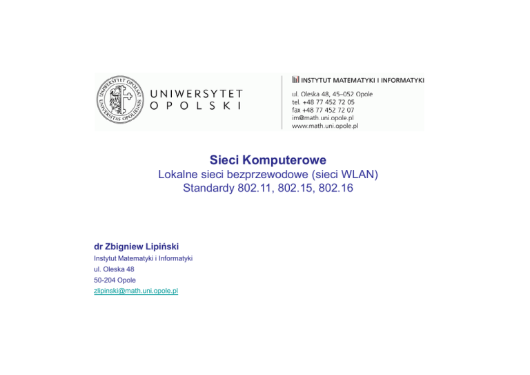 Sieci Komputerowe Lokalne sieci bezprzewodowe (sieci WLAN) Standardy 802.11, 802.15, 802.16 dr Zbigniew Lipiński Instytut Matematyki i Informatyki ul. Oleska 48 50-204 Opole [email protected] Zagadnienia • Fale elektromagnetyczne jako nośnik informacji. Rodzaje fal radiowych. Modulacja fal – kodowanie sygnału cyfrowego za pomocą fali nośnej (sygnału analogowego). • Standardy sieci bezprzewodowych. • Fizyczna struktura sieci bezprzewodowych, urządzenia sieciowe: access point, przełącznik, router, karta sieciowa, budowa anten. • Typy sieci bezprzewodowych. Topologie fizyczne sieci bezprzewodowych. • Lokalne sieci bezprzewodowe, standardy IEEE 802.11, HyperLAN, Irda, BlueTooth. • System radiowy z widmem rozproszonym. • Metody dostępu do medium w sieciach bezprzewodowych. • Standardy i protokoły sieci bezprzewodowych. • Formaty ramek IEEE 802.11. • Bezpieczeństwo sieci bezprzewodowych, protokół WEP, WPA, TKIP, system RADIUS. 2 Zakresy długości fal elektromagnetycznych mm = 10-3 m , 1 nm = 10-9 m • • • • • Promieniowanie Gamma - 10-11 m Promieniowanie X (Roentegna) 10-11m - 10-9 m Widmo optyczne Ultrafiolet 1 nm - 380 nm Światło widzialne 380 nm - 780 nm (częstotliwość około 1015 Hz = 106 GHz) 380 - 436 nm fiolet 436 - 495 nm niebieski 495 - 566 nm zielony 566 - 589 nm żółty 589 - 627 nm pomarańczowy 627 - 780 nm czerwony Podczerwień 780 nm – 10-3 m = 1 mm = 106 nm Mikrofale 1 mm - 30 cm (300 GHz – 1 GHz) <- sieci WLAN 2,4 – 2,4835 GHz Fale radiowe 0,30 m – 105 m fale ultrakrótkie 0,30 m – 10m 30 MHz – 1GHz fale krótkie 10 m - 75 m 4 MHz - 30 MHz fale średnie i pośrednie 75m - 1 km 300 KHz - 4 MHz fale długie 1 km - 10 km 30 KHz - 300 KHz fale bardzo długie 10 km - 100 km 3 KHz - 30 KHz 3 Zakresie częstotliwości dla transmisji radiowych Ustawa z dnia 16 lipca 2004 r. Prawo telekomunikacyjne, Dz.U. 2004 nr 171 poz. 1800. Rozporządzenie Ministra Transportu z dnia 3 lipca 2007 r. w sprawie urządzeń radiowych nadawczych lub nadawczo-odbiorczych, które mogą być używane bez pozwolenia radiowego, Dz.U. 2007 nr 138 poz. 972. Rozporządzenia Dz.U. 2007 nr 138 poz. 972 reguluje min. zakresy częstotliwości pracy urządzeń ISM np.: • 433,05 – 434,79 MHz, • 863 – 870 MHz, urządzenia stosujące rozpraszanie Frequency Hopping Spread Spectrum, Direct Sequence Spread Spectrum. Bez zgody odpowiednich instytucji, ale z homologacją Ministerstwa Łączności można używać urządzenia nadawcze o mocy nie większej niż 20 mW, pracujących na częstotliwościach do 800 MHz. 4 Sieci ISM - Industrial, Scientific & Medical Dla sieci lokalnych, typu ISM, Industrial, Scientific & Medical, wydzielono zakresy częstotliwości: • 902 – 928 MHz (USA), • 2,4 – 2,4835 GHz (Europa, USA, Japonia), • 5,725 – 5,85 GHz (USA). które można użytkować bez zgody i opłat. Urządzenia radiowe pracujące w tych zakresach muszą stosować rozpraszanie widma sygnału, moc nadajnika nie może być większa niż 1 W (USA), 100 mW (Europa), 10 mW (Japonia). Pasma ISM są specyfikowane w standardzie IEEE 802.11. 5 Typy modulacji fal radiowych S (t ) = A(t ) sin( ω (t ) t + ϕ (t )) Równanie fali • • • • AM, modulacja amplitudą, szybkość transmisji 0,8 – 2,25 b/s o OOK (On/Off Key modulation), szybkość transmisji 0,8 b/s, o QAM (Quadrature Amplitude Modulation), szybkość transmisji 1,7 b/s, o QPR (Quadrature Partial Response modulation), szybkość transmisji 2,25 b/s, FM, modulacja częstotliwością, szybkość transmisji 0,8 – 1,9 b/s. o FSK (Frequency-Shift Keying), o CP-SFK (Continuous Phase Frequency Shift Keying), o MSK (Minimum-Shift Keying). PM, modulacja fazą, szybkość transmisji 0,8 – 2,9 b/s. Odmiany: o BPSK (Binary Phase Shift Keying), o DE-BPSK (Differentially Encoded Coherent Biphase Shift Keying), o DPSK (Differential Phase Shift Keying), o QPSK (Quadrature Phase Shift Keying), DQPSK, 8-F PSK, 16-F PSK, Am/PM, (16-F APK, Amplitude-shift keying modulation), szybkość transmisji 3,1 b/s. 6 Typy modulacji fal radiowych S (t ) = A(t ) sin( ω (t ) t + ϕ (t )) 7 Szerokość pasma, przepustowość sieci Szerokość pasma w transmisji analogowej określa zakres częstotliwości stosowanej do transmisji danych, jednostka herz [Hz]. Szerokość pasma jest to ilość danych, które można przesłać siecią w określonym czasie, jednostką jest bit/sekundę [b/s]. Przepustowość w transmisji cyfrowej oznacza ilość bitów przesyłanych w ciągu jednostki czasu. Przepustowość oznacza rzeczywistą szerokość pasma (def. Cisco). Przykład: Sieć Ethernet ma przepustowość 10Mb/s. 8 Zasada Nyquista. Wzór Shanona. Zasada Nyquista (1924 r.) określa zależność między szerokością pasma urządzenia transmisyjnego a maksymalną liczbą bitów którą urządzenie może przesłać w ciągu 1s. Zasada określa teoretyczne ograniczenie na maks. szybkość przesyłania danych. Jeżeli urządzenie stosuje: K - możliwych wartości napięcia, poziomów sygnału B - jest szerokością pasma to maks. szybkość przesyłania danych C jest równa C = 2 ⋅ B ⋅ log 2 ( K ) Wzór Shanona (1948) określa zależność między C maks. szybkością transmisji (pojemność kanału) B szerokością pasma, S średnią mocą sygnału, N średnim poziomem szumów. C = B ⋅ log 2 (1 + S ) N 9 Transmisja baseband, narrowband, broadaband • Transmisja w paśmie podstawowym (baseband transmision). • Transmisja wąsko-pasmowa (narrowband transmision). • Transmisja szeroko-pasmowa (broadband transmision) - transmisja z widmem rozproszonym. 10 Standardy sieci bezprzewodowych 1990 - w Institute of Electrical and Electronics Engineers (IEEE) powstała grupa robocza ‘IEEE 802.11 Working Group’ dla opracowania standardu warstwy fizycznej (PHY layer) i warstwy MAC (mediumaccess control layer) dla bezprzewodowych sieci lokalnych (sieci WLAN) w paśmie ISM (Industrial, Scientific & Medical). 1997 IEEE opracowało sta