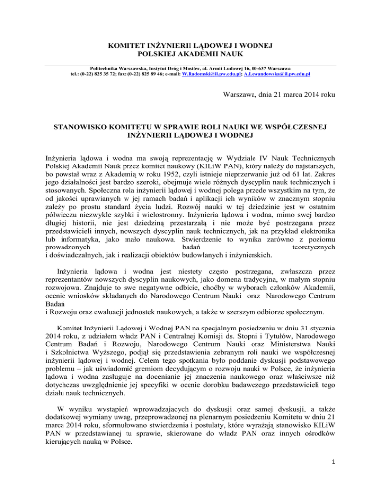 KOMITET INŻYNIERII LĄDOWEJ I WODNEJ POLSKIEJ AKADEMII NAUK Politechnika Warszawska, Instytut Dróg i Mostów, al. Armii Ludowej 16, 00-637 Warszawa tel.: (0-22) 825 35 72; fax: (0-22) 825 89 46; e-mail: [email protected]; [email protected] Warszawa, dnia 21 marca 2014 roku STANOWISKO KOMITETU W SPRAWIE ROLI NAUKI WE WSPÓŁCZESNEJ INŻYNIERII LĄDOWEJ I WODNEJ Inżynieria lądowa i wodna ma swoją reprezentację w Wydziale IV Nauk Technicznych Polskiej Akademii Nauk przez komitet naukowy (KILiW PAN), który należy do najstarszych, bo powstał wraz z Akademią w roku 1952, czyli istnieje nieprzerwanie już od 61 lat. Zakres jego działalności jest bardzo szeroki, obejmuje wiele różnych dyscyplin nauk technicznych i stosowanych. Społeczna rola inżynierii lądowej i wodnej polega przede wszystkim na tym, że od jakości uprawianych w jej ramach badań i aplikacji ich wyników w znacznym stopniu zależy po prostu standard życia ludzi. Rozwój nauki w tej dziedzinie jest w ostatnim półwieczu niezwykle szybki i wielostronny. Inżynieria lądowa i wodna, mimo swej bardzo długiej historii, nie jest dziedziną przestarzałą i nie może być postrzegana przez przedstawicieli innych, nowszych dyscyplin nauk technicznych, jak na przykład elektronika lub informatyka, jako mało naukowa. Stwierdzenie to wynika zarówno z poziomu prowadzonych badań teoretycznych i doświadczalnych, jak i realizacji obiektów budowlanych i inżynierskich. Inżynieria lądowa i wodna jest niestety często postrzegana, zwłaszcza przez reprezentantów nowszych dyscyplin naukowych, jako domena tradycyjna, w małym stopniu rozwojowa. Znajduje to swe negatywne odbicie, choćby w wyborach członków Akademii, ocenie wniosków składanych do Narodowego Centrum Nauki oraz Narodowego Centrum Badań i Rozwoju oraz ewaluacji jednostek naukowych, a także w szerszym odbiorze społecznym. Komitet Inżynierii Lądowej i Wodnej PAN na specjalnym posiedzeniu w dniu 31 stycznia 2014 roku, z udziałem władz PAN i Centralnej Komisji ds. Stopni i Tytułów, Narodowego Centrum Badań i Rozwoju, Narodowego Centrum Nauki oraz Ministerstwa Nauki i Szkolnictwa Wyższego, podjął się przedstawienia zebranym roli nauki we współczesnej inżynierii lądowej i wodnej. Celem tego spotkania było poddanie dyskusji podstawowego problemu – jak uświadomić gremiom decydującym o rozwoju nauki w Polsce, że inżynieria lądowa i wodna zasługuje na docenianie jej znaczenia naukowego oraz właściwsze niż dotychczas uwzględnienie jej specyfiki w ocenie dorobku badawczego przedstawicieli tego działu nauk technicznych. W wyniku wystąpień wprowadzających do dyskusji oraz samej dyskusji, a także dodatkowej wymiany uwag, przeprowadzonej na plenarnym posiedzeniu Komitetu w dniu 21 marca 2014 roku, sformułowano stwierdzenia i postulaty, które wyrażają stanowisko KILiW PAN w przedstawianej tu sprawie, skierowane do władz PAN oraz innych ośrodków kierujących nauką w Polsce. 1 1. Badania naukowe w zakresie inżynierii lądowej i wodnej mają swoją specyfikę, polegającą głównie na znacznie większym udziale badań o charakterze aplikacyjnym niż w przypadku innych działów nauk technicznych. Od poziomu uprawiania tych badań i wprowadzania ich do praktyki, w znacznym stopniu zależy standard życia społeczeństwa. Ponadto inżynieria ta ma ogromne znaczenie gospodarcze – na przykład same tylko drogi i mosty stanowią w Polsce około 30% majątku narodowego. 2. Ostatnie lata przyniosły wiele osiągnięć naukowych i aplikacyjnych - mimo stale dramatycznie niskiego poziomu finansowania nauki w Polsce, co szczególnie odczuwa inżynieria lądowa i wodna, uprawiane w jej ramach badania nie ustępują światowym, co ze względu na wspomniany aplikacyjny charakter tych badań, nie znajduje często odzwierciedlenia w „punktowym” systemie oceny osiągnięć badawczych, który preferuje jedynie same publikacje i ich cytowanie. 3. Aczkolwiek niektóre dyscypliny lub poddyscypliny naukowe uprawiane w ramach inżynierii lądowej i wodnej mają charakter na tyle ogólny, że mogą być przedmiotem zainteresowania w skali światowej (np. mechanika konstrukcji i materiałów, inżynieria materiałów budowlanych, fizyka budowli), to zdecydowana większość, mimo ich doniosłości i walorów poznawczych, ma znaczenie lokalne, co wynika z samej natury inżynierii lądowej i wodnej, która zależy od warunków geograficznych, geologicznych i klimatycznych kraju. To, co dla nas może mieć podstawowe znaczenie (np. specyfika iłów poznańskich, osuwiska we fliszu karpackim, modernizacja dróg, obudowa sieci drogowej, wykorzystanie popiołów lotnych z Bełchatowa, etc.), nie jest zwykle interesujące poza krajem. Stąd wynika błędność systemu ocen osiągnięć naukowych w zakresie inżynierii lądowej i wodnej, wyraźnie preferującego publikacje w określonych grupach czasopism międzynarodowych. 4. Obecny system punktowania publikacji sprawia, że nie ma – dotyczy to zwłaszcza młodych naukowców, budujących dopiero swą pozycję – żadnego sensu publikowania czegokolwiek wartościowego w kraju. Prowadzi to do obniżenia poziomu polskiego piśmiennictwa naukowego i naukowo-technicznego, a z czasem może doprowadzić do jego zaniku. Dlatego postulujemy, aby zrewidować i podnieść dotychczasową ministerialną punktację publikacji umieszczanych w recenzowanych krajowych czasopismach naukowych i naukowo-technicznych w zakresie inżynierii lądowej i wodnej, które w licznych przypadkach poziomem zamieszczanych prac nie odbiegają od wielu czasopism z tzw. listy filadelfijskiej. Obecnie punkty za publikacje krajowe są zawarte w granicach 4 ÷ 6 punktów, podczas gdy w analogicznych czasopismach zagranicznych – w granicach 20 ÷ 50 punktów. Nie znajduje to żadnego uzasadnienia merytorycznego. 5. Krytyka punktowego systemu oceny osiągnięć badawczych nie wypływa jedynie z naszego środowiska naukowego; jest ona w