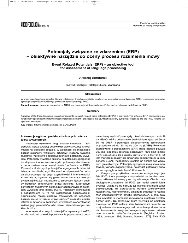 art03 - Senderski - Potencja‡ N400.qxp 2006-09-03 19:13 Page 11 Problemy teorii i praktyki Problems of theory and practice 2005, 27 Potencja³y zwi¹zane ze zdarzeniem (ERP) – obiektywne narzêdzie do oceny procesu rozumienia mowy Event Related Potentials (ERP) – an objective tool for assessment of language processing Andrzej Senderski Instytut Fizjologii i Patologii S³uchu, Warszawa Streszczenie W pracy przedstawiono przegl¹d literatury dotycz¹cy trzech potencja³ów jêzykowych: potencja³u semantycznego N400, wczesnego potencja³u syntaktycznego ELAN i póŸnego potencja³u syntaktycznego P600. S³owa kluczowe: potencja³ semantyczny N400, wczesny potencja³ syntaktyczny ELAN póŸny potencja³ syntaktyczny P600. Summary A review of the three language-related components in event-related brain potentials (ERPs) is provided. The different ERP components are functionally specified: the N400 component reflects semantic processes, the ELAN reflects early syntactic processes and the P600 reflects late syntactic reanalysis. Key words: N400 semantic component, ELAN, P600. Informacje ogólne i podzia³ s³uchowych potencja³ów wywo³anych Potencja³y wywo³ane (ang. evoked potentials – EP) stanowi¹ wyraz swoistej odpowiedzi bioelektrycznej struktur mózgu na okreœlony bodziec. W zale¿noœci od modalnoœci bodŸca (s³uchowy, wzrokowy, dotykowy) mo¿emy wyró¿niæ s³uchowe, wzrokowe i czuciowo-ruchowe potencja³y wywo³ane. Potencja³y wywo³ane dzielimy na potencja³y egzogenne i endogenne inaczej okreœlane jako potencja³y skorelowane z pobudzeniem (ang. event related potentials – ERP). Parametry s³uchowych potencja³ów egzogennych, takie jak latencja i amplituda, s¹ œciœle zale¿ne od parametrów bodŸca akustycznego np. jego czêstotliwoœci i intensywnoœci. Potencja³y egzogenne s¹ generowane automatycznie po prezentacji bodŸca, niezale¿nie od g³êbokoœci i jakoœci analizy bodŸców dokonywanej przez pacjenta. Klasycznym przyk³adem s³uchowych potencja³ów egzogennych s¹ potencja³y wywo³ane pnia mózgu (ABR). Potencja³y skorelowane z pobudzeniem (ERP) nie reprezentuj¹ bezpoœredniej, nieuniknionej reakcji uk³adów zmys³owych na obecnoœæ bodŸca, ale s¹ wyrazem „wewnêtrznych” procesów analizy informacji zawartej w bodŸcach, wywo³anych nieoczekiwan¹ zmian¹ jego parametrów albo nawet nieoczekiwanym brakiem bodŸca. W obrêbie s³uchowych potencja³ów wywo³anych (AEP) w zale¿noœci od czasu ich powstawania po prezentacji bodŸ- ca mo¿emy wyró¿niæ potencja³y o krótkich latencjach – do 20 ms (EcoG, ABR), potencja³y o œrednich latencjach od 20 do 90 ms (MLR) i potencja³y d³ugolatencyjne generowane w przedziale od ok. 90 ms do 200 ms (LAEP). Potencja³y skorelowane z pobudzeniem (ERP) maj¹ latencjê powy¿ej 300 ms i obejmuj¹ potencja³ poznawczy P300 oraz komponenty specyficzne dla bodŸców jêzykowych, z których N400 jest markerem analizy ich zawartoœci semantycznej, a komponenty ELAN i P600 odzwierciedlaj¹ ich analizê pod wzglêdem gramatycznym. Potencja³y egzogenne maj¹ udokumentowan¹ wartoœæ diagnostyczn¹, natomiast potencja³y endogenne s¹ ci¹gle w fazie badañ klinicznych. Klasycznym przyk³adem potencja³u endogennego jest fala P300, która powstaje w odpowiedzi na bodziec nowy, nieoczekiwany lub nios¹cy wa¿n¹ informacjê. Chocia¿ psychologiczne znaczenie fali P300 jest nadal przedmiotem dyskusji, uwa¿a siê na ogó³, ¿e jej latencja jest miar¹ czasu poœwiêconego na opracowanie bodŸca (odkodowanie, rozpoznanie, klasyfikowanie), amplituda œwiadczy o rozmiarach zaanga¿owanych struktur poznawczych, a sam za³amek powstaje w momencie rozwi¹zania problemu [Szelenberger 2001]. Do czynników, które wp³ywaj¹ na amplitudê i latencjê fali P300 nale¿¹: stan œwiadomoœci pacjenta, rodzaj zadania postawionego przed pacjentem podczas badania, koncentracja uwagi (motywacja do wykonania zadania) oraz znaczenie bodŸców dla pacjenta [Begleiter, Porjesz 1983; Johnson 1986; Squires, Squires 1975]. Fala P300 art03 - Senderski - Potencja‡ N400.qxp 2006-09-03 19:14 Page 12 12 Andrzej Senderski mo¿e byæ rejestrowana nawet w odpowiedzi na brak bodŸca, je¿eli bodziec ten by³ oczekiwany, a nie pojawi³ siê [Desmedt, Debecker 1979. Ruchkin, Sutton 1975]. Potencja³ P300 jest czêsto bimodalny – pierwszy szczyt, nazywany P3a, jest wyrazem procesu rozpoznania nowego lub nieoczekiwanego zjawiska akustycznego. Drugi szczyt, tzw. P3b, jest wyrazem œwiadomych procesów kategoryzacji bodŸca (przyporz¹dkowania bodŸca do okreœlonej kategorii wed³ug uzyskanej instrukcji) [Fuchigami, Okubo 1995]. Komponent P300 potencja³ów poznawczych odzwierciedla intelektualne rozwi¹zanie sygnalizowanego przez bodziec problemu i dlatego znajduje zastosowanie jako obiektywny wskaŸnik procesów poznawczych. W praktyce klinicznej jest stosowany w diagnostyce zaburzeñ neurologicznych upoœledzaj¹cych procesy poznawcze (ró¿ne formy demencji, a szczególnie choroba Alzheimera, stwardnienie rozsiane, padaczka, autyzm, schizofrenia i alkoholizm [Butcher 1994]. W praktyce nie istnieje wyraŸna granica oddzielaj¹ca sk³adowe endogenne i egzogenne potencja³ów wywo³anych. Wiadomo, ¿e potencja³y egzogenne (szczególnie póŸne ich komponenty) s¹ wra¿liwe na stan emocjonalny i natê¿enie uwagi osoby badanej. Równoczeœnie modalnoœæ oraz cechy fizyczne bodŸca maj¹ pewien wp³yw na potencja³y endogenne. Podzia³ potencja³ów wywo³anych oraz informacje o podstawowych ró¿nicach miêdzy nimi zawarto w tab. 1. W poprzednim stuleciu prowadzono intensywne prace nad poznaniem mechanizmów rozumienia mowy wykorzystuj¹c metody behawioralne (g³ównie pomiary czasu reakcji), badaj¹c osoby zdrowe, jak i z ró¿nego typu zaburzeniami jêzykowymi. Efektem tych badañ jest opracowanie wielu teorii próbuj¹cych usystematyzowaæ z³o¿one procesy zachodz¹ce podczas rozumienia mowy, kiedy to system rozumienia mowy musi an