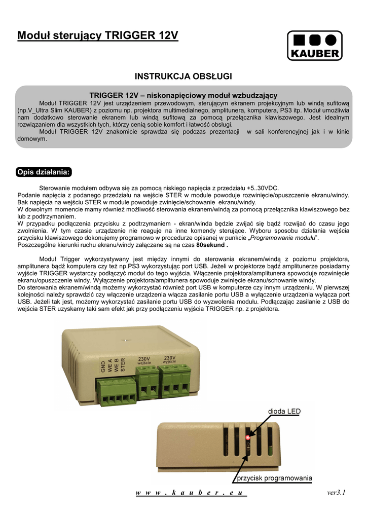 Moduł sterujący TRIGGER 12V INSTRUKCJA OBSŁUGI TRIGGER 12V – niskonapięciowy moduł wzbudzający Moduł TRIGGER 12V jest urządzeniem przewodowym, sterującym ekranem projekcyjnym lub windą sufitową (np.V_Ultra Slim KAUBER) z poziomu np. projektora multimedialnego, amplitunera, komputera, PS3 itp. Moduł umożliwia nam dodatkowo sterowanie ekranem lub windą sufitową za pomocą przełącznika klawiszowego. Jest idealnym rozwiązaniem dla wszystkich tych, którzy cenią sobie komfort i łatwość obsługi. Moduł TRIGGER 12V znakomicie sprawdza się podczas prezentacji w sali konferencyjnej jak i w kinie domowym. Opis działania: Sterowanie modułem odbywa się za pomocą niskiego napięcia z przedziału +5..30VDC. Podanie napięcia z podanego przedziału na wejście STER w module powoduje rozwinięcie/opuszczenie ekranu/windy. Bak napięcia na wejściu STER w module powoduje zwinięcie/schowanie ekranu/windy. W dowolnym momencie mamy również możliwość sterowania ekranem/windą za pomocą przełącznika klawiszowego bez lub z podtrzymaniem. W przypadku podłączenia przycisku z podtrzymaniem - ekran/winda będzie zwijać się bądź rozwijać do czasu jego zwolnienia. W tym czasie urządzenie nie reaguje na inne komendy sterujące. Wyboru sposobu działania wejścia przycisku klawiszowego dokonujemy programowo w procedurze opisanej w punkcie „Programowanie modułu”. Poszczególne kierunki ruchu ekranu/windy załączane są na czas 80sekund . Moduł Trigger wykorzystywany jest między innymi do sterowania ekranem/windą z poziomu projektora, amplitunera bądź komputera czy też np.PS3 wykorzystując port USB. Jeżeli w projektorze bądź amplitunerze posiadamy wyjście TRIGGER wystarczy podłączyć moduł do tego wyjścia. Włączenie projektora/amplitunera spowoduje rozwinięcie ekranu/opuszczenie windy. Wyłączenie projektora/amplitunera spowoduje zwinięcie ekranu/schowanie windy. Do sterowania ekranem/windą możemy wykorzystać również port USB w komputerze czy innym urządzeniu. W pierwszej kolejności należy sprawdzić czy włączenie urządzenia włącza zasilanie portu USB a wyłączenie urządzenia wyłącza port USB. Jeżeli tak jest, możemy wykorzystać zasilanie portu USB do wyzwolenia modułu. Podłączając zasilanie z USB do wejścia STER uzyskamy taki sam efekt jak przy podłączeniu wyjścia TRIGGER np. z projektora. w w w . k a u b e r . e u ver3.1 Sposób podłączenia: UWAGA!!! Podłączenia modułu powinna dokonywać osoba posiadająca odpowiednie uprawnienia elektryczne. Przed uruchomieniem urządzenia należy upewnić się czy wszystkie przewody zostały podłączone zgodnie ze schematem. Uwagi montażowe: - Do ekranu/windy nie może być podłączone jednocześnie więcej niż jedno zewnętrzne sterowanie. - Do jednego sterowania(np. RC01/RC02/Trigger 12V/Trigger230V/Odbiornik IR/Odbiornik RS itp.) nie może być jednocześnie podłączone więcej niż jedno urządzenie typu ekran, winda, itp. Schemat podłączenia w w w . k a u b e r . e u ver3.1 Montaż modułu rozpoczynamy od podłączenia silnika ekranu/windy do modułu. Analogicznie do oznaczeń na schemacie podłączamy przewody od silnika w następującej kolejności: 1) przewód zerowy (niebieski) do zacisku o symbolu N (COM) 2) przewód fazowy (czarny – dla Typu A)* do zacisku o symbolu LA– w chwili pojawienia się dodatniego napięcia na wejściu STER z przedziału 5..30VDC na zacisku LA pojawia się zasilanie 230V AC na czas 80sekund. 3) przewód fazowy (brązowy – dla Typu A)* do zacisku o symbolu LB– w chwili zaniku dodatniego napięcia na wejściu STER na zacisku LB pojawia się zasilanie 230V AC na czas 80sekund. UWAGA!!! * należy sprawdzić, który kolor przewodu odpowiada za zwijanie, a który za rozwijanie ekranu/ windy. Podany powyżej przykład odnosi się do ekranów marki KAUBER z silnikiem Typu A. Następną czynnością jest podłączenie wejścia TRIGGER (wyzwalającego moduł): 1) do wejścia GND podłączamy przewód masa z wyjścia TRIGGER projektora, amplitunera bądź masa z portu USB np. komputera, PS3, itp. W przypadku podłączenia modułu pod port USB należy sprawdzić czy port USB jest zasilany tylko w momencie kiedy urządzenie jest włączone. 2) do wejścia STER podłączamy przewód zasilający wyjścia TRIGGER projektora, amplitunera bądź zasilanie z portu USB np. komputera, PS3, itp. W przypadku podłączenia modułu pod port USB należy sprawdzić czy port USB jest zasilany tylko w momencie kiedy urządzenie jest włączone. Kolejną czynnością jest podłączenie przełącznika klawiszowego (podłączenie opcjonalne): 1) do wejścia GND podłączamy przewód wspólny przełącznika 2) do wejścia WEA podłączamy przewód przycisku DÓŁ (rozwijanie) przełącznika 3) do wejścia WEB podłączamy przewód przycisku GÓRA (zwijanie) przełącznika Wciśnięcie przycisku na przełączniku odpowiednio zwija bądź rozwija ekran/windę do czasu jego zwolnienia. W tym czasie urządzenie nie reaguje na inne komendy sterujące (tryb stabilny wejścia przełącznika). Jako ostatnie podłączamy zasilanie urządzenia (Uwaga!!! podłączany przewód nie może być pod napięciem!!!) 1) przewód zerowy (niebieski) podłączamy do zacisku o symbolu N 2) przewód fazowy (brązowy lub czarny) podłączamy do zacisku o symbolu L Po prawidłowym podłączeniu zgodnie ze schematem i podłączeniu do zasilania dioda LED błyśnie 1 raz krótkim sygnałem. Programowanie modułu: Programowanie sposobu działania wejścia przełącznika klawiszowego - TRYB STABILNY Wyjście silnikowe załączane jest na czas trzymania przycisku w przełączniku. Wciśnij 6 razy przycisk programowania znajdujący się w środku modułu. Po ok. 2s dioda LED błyśnie 6 razy potwierdzając ustawienie tej funkcji. - TRYB CHWILOWY Chwilowe naciśnięcie przycisku przełącznika załącza wyjście silnika na czas 90 sekund. Wciśnij 7 razy przycisk programowania znajdujący się