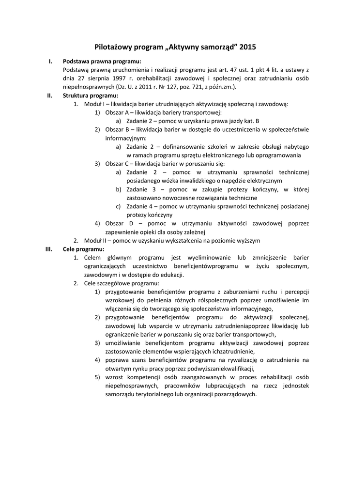 Pilotażowy program „Aktywny samorząd” 2015 I. II. III. Podstawa prawna programu: Podstawą prawną uruchomienia i realizacji programu jest art. 47 ust. 1 pkt 4 lit. a ustawy z dnia 27 sierpnia 1997 r. orehabilitacji zawodowej i społecznej oraz zatrudnianiu osób niepełnosprawnych (Dz. U. z 2011 r. Nr 127, poz. 721, z późn.zm.). Struktura programu: 1. Moduł I – likwidacja barier utrudniających aktywizację społeczną i zawodową: 1) Obszar A – likwidacja bariery transportowej: a) Zadanie 2 – pomoc w uzyskaniu prawa jazdy kat. B 2) Obszar B – likwidacja barier w dostępie do uczestniczenia w społeczeostwie informacyjnym: a) Zadanie 2 – dofinansowanie szkoleo w zakresie obsługi nabytego w ramach programu sprzętu elektronicznego lub oprogramowania 3) Obszar C – likwidacja barier w poruszaniu się: a) Zadanie 2 – pomoc w utrzymaniu sprawności technicznej posiadanego wózka inwalidzkiego o napędzie elektrycznym b) Zadanie 3 – pomoc w zakupie protezy kooczyny, w której zastosowano nowoczesne rozwiązania techniczne c) Zadanie 4 – pomoc w utrzymaniu sprawności technicznej posiadanej protezy kooczyny 4) Obszar D – pomoc w utrzymaniu aktywności zawodowej poprzez zapewnienie opieki dla osoby zależnej 2. Moduł II – pomoc w uzyskaniu wykształcenia na poziomie wyższym Cele programu: 1. Celem głównym programu jest wyeliminowanie lub zmniejszenie barier ograniczających uczestnictwo beneficjentówprogramu w życiu społecznym, zawodowym i w dostępie do edukacji. 2. Cele szczegółowe programu: 1) przygotowanie beneficjentów programu z zaburzeniami ruchu i percepcji wzrokowej do pełnienia różnych rólspołecznych poprzez umożliwienie im włączenia się do tworzącego się społeczeostwa informacyjnego, 2) przygotowanie beneficjentów programu do aktywizacji społecznej, zawodowej lub wsparcie w utrzymaniu zatrudnieniapoprzez likwidację lub ograniczenie barier w poruszaniu się oraz barier transportowych, 3) umożliwianie beneficjentom programu aktywizacji zawodowej poprzez zastosowanie elementów wspierających ichzatrudnienie, 4) poprawa szans beneficjentów programu na rywalizację o zatrudnienie na otwartym rynku pracy poprzez podwyższaniekwalifikacji, 5) wzrost kompetencji osób zaangażowanych w proces rehabilitacji osób niepełnosprawnych, pracowników lubpracujących na rzecz jednostek samorządu terytorialnego lub organizacji pozarządowych. Moduł I Formy i zakres pomocy: Obszar A Zadanie 2 dofinansowanie lub refundacja kosztów uzyskania prawa jazdy kat. B, w tym: kursu i egzaminów na prawo jazdy kat. B zakwaterowania, wyżywienia w okresie trwania kursu (w przypadku kursu poza miejscowością zamieszkania) Obszar B Zadanie 2 Zadanie 2 dofinansowanie zakupu protezy kooczyny, w której zastosowano nowoczesne rozwiązania techniczne dofinansowanie szkoleo w zakresie obsługi nabytego w ramach programu sprzętu elektronicznego lub oprogramowania dofinansowanie lub refundacja kosztów utrzymania sprawności technicznej posiadanego wózka inwalidzkiego o napędzie elektrycznym dojazdu (przyjazd i powrót z kursu) (w przypadku kursu poza miejscowością zamieszkania) znaczny lub umiarkowany stopieo niepełnosprawności Adresat programu: wiek aktywności zawodowej dysfunkcja narządu ruchu znaczny stopieo niepełnosprawności lub orzeczenie o niepełnosprawności wiek do 18 lat lub wiek aktywności zawodowej lub zatrudnienie znaczny stopieo niepełnosprawności lub orzeczenie o niepełnosprawności dysfunkcja obu kooczyn górnych lub narządu wzroku Warunki wykluczające uczestnictwo w programie: wymagalne zobowiązania wobec PFRON lub wobec realizatora programu Częstotliwość udzielania pomocy: co 3 lata, licząc od początku roku następującego po roku, w którym udzielono pomocy Maksymalna kwota dofinansowania: 2.100,00 zł, w tym: Obszar C Zadanie 3 dla osoby głuchoniewidomej – 4.000,00 zł refundacja kosztów dojazdu adresata programu na spotkanie z ekspertem PFRON lub kosztów dojazdu eksperta PFRON na spotkanie z adresatem programu Zadanie 4 Obszar D dofinansowanie lub refundacja kosztów uzyskania wykształcenia na poziomie wyższym, w tym: dofinansowanie lub refundacja kosztów utrzymania sprawności technicznej posiadanej protezy kooczyny refundacja kosztów dojazdu adresata programu na spotkanie z ekspertem PFRON lub kosztów dojazdu eksperta PFRON na spotkanie z adresatem programu Moduł II opłata za naukę (czesne) dofinansowanie lub refundacja kosztów opieki nad osobą zależną (opłata za pobyt dziecka w żłobku lub przedszkolu albo inny koszt zapewnienia opieki nad dzieckiem) dodatek na pokrycie kosztów kształcenia (nie podlega rozliczeniu) dodatek na uiszczenie opłaty za przeprowadzenie przewodu doktorskiego (w przypadku osób, które mają wszczęty przewód doktorski, a nie są uczestnikami studiów doktoranckich) stopieo niepełnosprawności znaczny lub umiarkowany stopieo niepełnosprawności znaczny lub umiarkowany stopieo niepełnosprawności wiek aktywności zawodowej lub zatrudnienie aktywnośd zawodowa potwierdzona opinią eksperta PFRON stabilnośd procesu chorobowego potwierdzone opinią eksperta PFRON rokowania uzyskania zdolności do pracy w wyniku wsparcia udzielonego w programie pełnienie roli opiekuna prawnego dziecka nauka w szkole wyższej lub szkole policealnej lub kolegium lub przewód doktorski otwarty poza studiami doktoranckimi po zakooczeniu okresu gwarancji co 3 lata, licząc od początku roku następującego po roku, w którym udzielono pomocy 2.000,00 zł dla protezy na III poziomie jakości, przy amputacji: - w zakresie ręki – 9.000,00 zł - przedramienia – 20.000,00 zł - ramienia i wyłuszczenia w stawie barkowym – 26.000,00 zł - na poziomie podudzia – po zakooczeniu okresu gwarancji nie dotyczy do 30% kwot, o których mowa w zadaniu 3 200,00 zł miesięcznie, nie więcej niż 2.400,00 zł w ciągu roku – tytułem opieki nad każdą (jedną) osobą zależną wymagalne zo