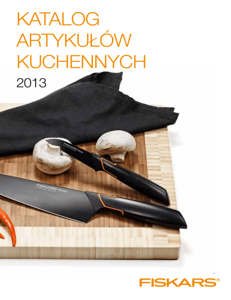 KATALOG ARTYKUŁÓW KUCHENNYCH 2013 360 LAT WZORNICTWA UŻYTKOWEGO Firma Fiskars jest wiodącym producentem funkcjonalnych, trwałych i wygodnych w użyciu narzędzi. Myślą przewodnią projektantów Fiskars jest dążenie do uzyskania maksymalnej satysfakcji z pracy wykonywanej z jak najmniejszym wysiłkiem. Założona w 1649 r. firma Fiskars jest najstarszym działającym nieprzerwanie do chwili obecnej przedsiębiorstwem w Finlandii. Już od 360 lat, czyli od początku swojej działalności, zajmuje się wytwarzaniem narzędzi i obróbką stali. Firma wywodzi się z malowniczo położonej wioski 02 Fiskars, będącej obecnie centrum sztuki i wzornictwa. Nowoczesną estetykę łączy się tu z tradycjami dawnego rzemiosła. W 1967 roku firma Fiskars rozpoczęła produkcję pierwszych na świecie nożyczek z uchwytami z tworzywa sztucznego. Do tej pory sprzedano ponad miliard sztuk charakterystycznych pomarańczowych nożyczek powszechnie kojarzonych z marką Fiskars. Firma jest światowym liderem w tej branży. 04 08 Spis treści Nowy Projekt Opakowania 04 Struktura asortymentu 06 Nożyczki ServoCut 10 Classic 12 FunctionalForm 15 Essential 16 Moomin 18 First 20 Cuts+More 21 EasyCut 22 SmartCut 23 24 KitchenSmart 25 38 52 58 Noże Fuzion 26 Solid 28 Edge 30 FunctionalForm 32 KitchenSmart 35 Aksesoria FunctionalForm 39 Akcesoria do noży i nożyczek 45 KitchenSmart 46 Sztućce Solid 53 FunctionalForm 54 KitchenSmart 57 Naczynia kuchenne ze stali nierdzewnej FunctionalForm 59 KitchenSmart 61 Użytkowanie i pielęgnacja 63 Informacje techniczne 66 03 NOWE OPAKOWANIA Z przyjemnością prezentujemy Państwu nowe opakowania produktów. Atrakcyjny wygląd spowoduje, że nasze produkty będą lepiej widoczne na półkach, dzięki czemu szybciej niż do tej pory zwrócą uwagę klientów. Łatwość zakupów będzie zatem zgodna z naszym hasłem Smart Everyday Functionality. Najważniejsze jest takie zaprojektowanie opakowania, aby uławić klientowi podjęcie decyzji o zakupie. Chcemy mieć pewność, że kupujący z łatwością znajdzie to, czego szuka, a jednocześnie - że zainteresuje się nowościami, dzięki czemu zrobi większe zakupy. Osiągamy ten cel poprzez prostą, widoczną prezentację produktów w opakowaniach. Jesteśmy przekonani, że nowe projekty opakowań wywołają doskonałe wrażenie na półkach i spowodują wzrost sprzedaży. Nasze przesłanie Logo Myśl przewodnia marki Fiskars widoczna jest w lewym górnym rogu każdego opakowania: Smart ” Everyday Functionality”, a dla nożyczek - World’s No. 1 scissors brand”. ” Logo Fiskars jest widoczne i czytelne. Kolorystyka Każda linia produktów Fiskars ma własną kolorystykę. Solid - linią Premium - eleganckie, czarne opakowania. Informacje Opakowania wszystkich produktów zawierają podstawowe informacje o firmie oraz znaki i symbole informujące o sposobie użytkowania produktu. Wysoka jakość od 1649 Najwyższa jakość naszych produktów wynika z kilkuset lat doświadczenia, co jest zaznaczone na wszystkich opakowaniach. 04 FunctionalForm - linia klasyczna biało-pomarańczowe opakowania. KitchenSmart - linia podstawowa - szare opakowania z rysunkami określającymi użyteczność produktów. Linia Premium Linia klasyczna Linia podstawowa 05 Knives Noże Nożyczki Kitchenkuchenne scissors Scissors Nożyczki ServoCut Fuzion Solid Classic Edge Moomin Functional Form Functional Form Kitchen Smart Kitchen Smart Inspiration Essential First Cuts+More EasyCut SmartCut Sztućce Cutlery Naczynia Cookware kuchenne ze stali nierdzewnej Akcesoria Utensils THE STRUKTURA NEW ASORTYMENTU ARCHI2013 TECTURE 2013 Solid Functional Form FF Stainless Steel Functional Form Kitchen Smart Kitchen Smart Inspiration Kitchen Smart Nożyczki Fiskars Firma Fiskars jest świadowym liderem w sprzedaży nożyczek będących symbolem wysokiej jakości i trwałości. Zaprojektowane ze szczególną dbałością o komfort i bezpieczeństwo użytkowania, nożyczki Fiskars spełnią każde zadanie. 08 2012 II Rewolucja: nożyczki z systemem ServoCut™” 1967 Rewolucja Fiskars: nożyczki z pomarańczową rączką 1880 pierwsze profesjonalne nożyczki Fiskars 1649 początki firmy Fiskars 100 n.e. klasyczne nożyczki 1500 p.n.e. pierwsze nożyczki 09 Nożyczki ServoCutTM ServoCut™ Najnowsza linia nożyczek Fiskars to rewolucja w domu i warsztacie. System ServoCut™ podwaja siłę cięcia znacznie zwiększając efektywność pracy. Linia zawiera pięć modeli nożyczek przeznaczonych do różnych zadań. Nożyczki z systemem ServoCut™ - nowa jakość cięcia. 6 Ergonomiczne rękojeści FiberComp™ z poliamidu wzmocnionego włóknem szklanym 1 System ServoCut™ podwójna siła cięcia 2 Wyjątkowy szlif ostrza 3 Wysokiej jakości stal nierdzewna (HRC 57) docisku 4 Regulacja ostrza 5 10 Rękojeść z powłoką Softgrip™ w dolnej części Nożyczki ServoCutTM Nożyczki uniwersalne 879161 24 cm, 159 g, opak. zb.: 5 +!4;;?08”KMEJEG! nowość +!4;;?08”KMEJLF! nowość +!4;;?08”KMEIEH! nowość +!4;;?08”KMEIFE! nowość +!4;;?08”KMEILG! nowość Doskonałe nożyczki umożliwiające swobodne cięcie opakowań, tektury, skóry i tkanin. Mechanizm ServoCut™ podwaja siłę cięcia. Regulacja docisku ostrza. Nożyczki ząbkowane 879168 24 cm, 167 g, opak. zb.: 5 Ząbkowane nożyczki służące do swobodnego cięcia twardych i śliskich materiałów. Doskonałe do garażu, warsztatu i ogrodu. Mechanizm ServoCut™ podwaja siłę cięcia. Regulacja docisku ostrza. Nożyczki uniwersalne 879151 21 cm, 108g, opak. zb.: 5 Doskonałe nożyczki o wszechstronnym zastosowaniu, przydatne w każdym domu. Mechanizm ServoCut™ podwaja siłę cięcia. Regulacja docisku ostrza. Nożyczki krawieckie 879152 21 cm, 108 g, opak. zb.: 5 Uniwersalne nożyczki ze szpiczastym ostrzem zwiększającym precyzję cięcia. Mechanizm ServoCut™ podwaja siłę cięcia. Regulacja docisku ostrza. Nożyczki ząbkowane 879158 21 cm, 108 g, opak. zb.: 5 Ząbkowane no