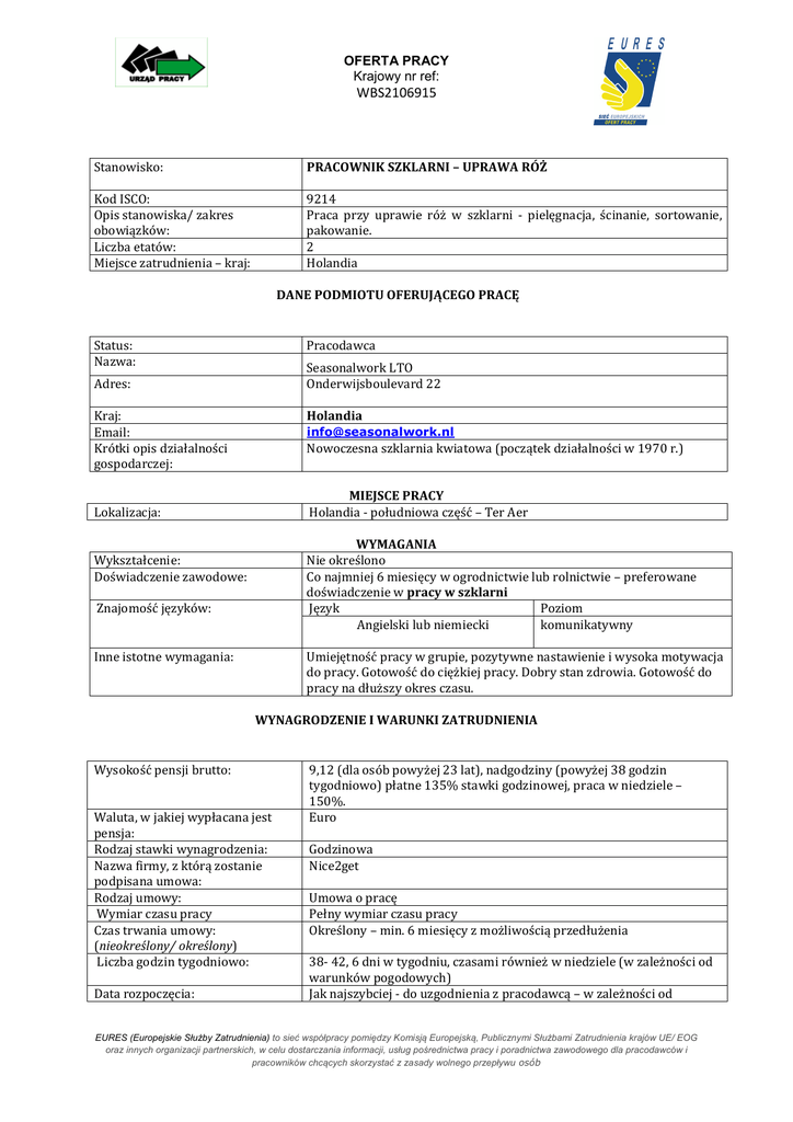 OFERTA PRACY Krajowy nr ref: WBS2106915 Stanowisko: PRACOWNIK SZKLARNI – UPRAWA RÓŻ Kod ISCO: Opis stanowiska/ zakres obowiązków: Liczba etatów: Miejsce zatrudnienia – kraj: 9214 Praca przy uprawie róż w szklarni - pielęgnacja, ścinanie, sortowanie, pakowanie. 2 Holandia DANE PODMIOTU OFERUJĄCEGO PRACĘ Status: Nazwa: Pracodawca Seasonalwork LTO Onderwijsboulevard 22 Adres: Kraj: Email: Krótki opis działalności gospodarczej: Holandia [email protected] Nowoczesna szklarnia kwiatowa (początek działalności w 1970 r.) MIEJSCE PRACY Holandia - południowa część – Ter Aer Lokalizacja: WYMAGANIA Nie określono Co najmniej 6 miesięcy w ogrodnictwie lub rolnictwie – preferowane doświadczenie w pracy w szklarni Język Poziom Angielski lub niemiecki komunikatywny Wykształcenie: Doświadczenie zawodowe: Znajomość języków: Inne istotne wymagania: Umiejętność pracy w grupie, pozytywne nastawienie i wysoka motywacja do pracy. Gotowość do ciężkiej pracy. Dobry stan zdrowia. Gotowość do pracy na dłuższy okres czasu. WYNAGRODZENIE I WARUNKI ZATRUDNIENIA Wysokość pensji brutto: Waluta, w jakiej wypłacana jest pensja: Rodzaj stawki wynagrodzenia: Nazwa firmy, z którą zostanie podpisana umowa: Rodzaj umowy: Wymiar czasu pracy Czas trwania umowy: (nieokreślony/ określony) Liczba godzin tygodniowo: Data rozpoczęcia: 9,12 (dla osób powyżej 23 lat), nadgodziny (powyżej 38 godzin tygodniowo) płatne 135% stawki godzinowej, praca w niedziele – 150%. Euro Godzinowa Nice2get Umowa o pracę Pełny wymiar czasu pracy Określony – min. 6 miesięcy z możliwością przedłużenia 38- 42, 6 dni w tygodniu, czasami również w niedziele (w zależności od warunków pogodowych) Jak najszybciej - do uzgodnienia z pracodawcą – w zależności od EURES (Europejskie Służby Zatrudnienia) to sieć współpracy pomiędzy Komisją Europejską, Publicznymi Służbami Zatrudnienia krajów UE/ EOG oraz innych organizacji partnerskich, w celu dostarczania informacji, usług pośrednictwa pracy i poradnictwa zawodowego dla pracodawców i pracowników chcących skorzystać z zasady wolnego przepływu osób Zakwaterowanie: Inne: warunków pogodowych Pracodawca oferuje zakwaterowanie w domkach campingowych (mak. 4 osoby – pokoje 1-, 2-osobowe)– koszt ponosi pracownik - 70,44 Euro tygodniowo (łącznie z kosztami gazu, wody i elektryczności). Odległość od miejsca pracy – 2 km. Możliwość wypożyczenia rowerów. Koszt ubezpieczenia – 20 Euro tygodniowo. Szacowana kwota netto (po odliczeniu kosztów zakwaterowania i ubezpieczenia) – ok. 300 Euro tygodniowo SPOSÓB SKŁADANIA WNIOSKU Wymagane dokumenty (list motywacyjny, CV itp.): Język, w którym muszą być sporządzone przedkładane dokumenty: Do kogo należy wysłać dokumenty: (do pracodawcy/ doradcy EURES) Gdzie należy wysłać dokumenty: (adres, adres e-mail, nr faksu z kodem kraju itp.) Dane teleadresowe doradcy EURES lub przedstawiciela pracodawcy: CV i list motywacyjny Język angielski lub polski Kandydaci proszeni są o przesłanie CV do doradcy EURES z Wojewódzkiego Urzędu Pracy w Białymstoku email: [email protected] – w tytule emaila proszę wpisać - Holandia – Rozen Tel. 85 74 97 235 WUP w Białymstoku, ul. Pogodna 22 15-354 Białystok Email: [email protected] WAŻNOŚĆ Data publikacji: Termin przedkładania podań o pracę / zakończenia ważności oferty: 23.04.2015 r./wznowienie 12.06.2015 r. Do odwołania Uprzejmie informujemy, że skontaktujemy się wyłącznie z wybranymi kandydatami. UWAGA: 1. Umowa z zagranicznym pracodawcą zostanie zawarta zgodnie z prawem kraju zatrudnienia. Oznacza to, że wszystkie roszczenia odnośnie do warunków, które obejmuje umowa, można kierować wyłącznie do odpowiedniego sądu w kraju zatrudnienia. Publiczne służby zatrudnienia (EURES) nie mogą pośredniczyć ani reprezentować pracownika w sądzie kraju zatrudnienia w przypadku sporu z pracodawcą. 2. Publiczne służby zatrudnienia (EURES) dokładają wszelkich starań, aby zapewnić rzetelność i wiarygodność ofert pracy zgłoszonych w lokalnym urzędzie pracy. Należy wyjaśnić, że oferta pracy została zgłoszona przez stronę trzecią i EURES nie odpowiada za ewentualne rozbieżności między warunkami pracy określonymi w ofercie pracy i warunkami oferowanymi przez potencjalnego pracodawcę. 3. Publiczne służby zatrudnienia (EURES) informują, że będą zbierać, przetwarzać i przekazywać potencjalnym pracodawcom zgodnie z przepisami dotyczącymi ochrony danych osobowych wszystkie dane osobowe dostarczone przez osoby poszukujące pracy. EURES (Europejskie Służby Zatrudnienia) to sieć współpracy pomiędzy Komisją Europejską, Publicznymi Służbami Zatrudnienia krajów UE/ EOG oraz innych organizacji partnerskich, w celu dostarczania informacji, usług pośrednictwa pracy i poradnictwa zawodowego dla pracodawców i pracowników chcących skorzystać z zasady wolnego przepływu osób