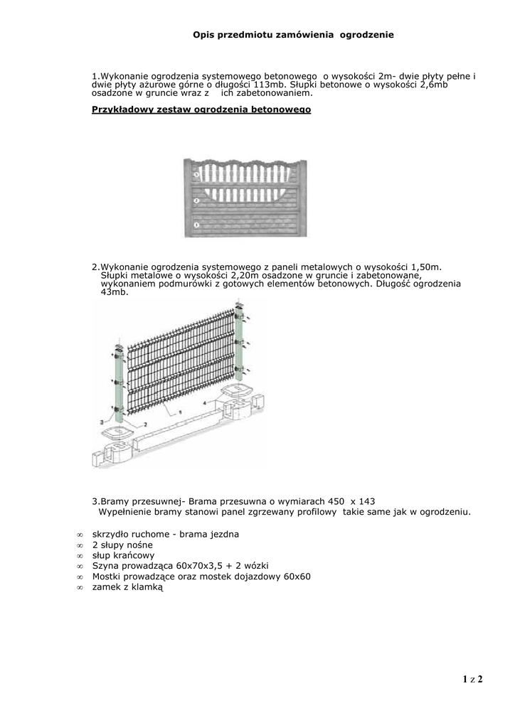 Opis przedmiotu zamówienia ogrodzenie 1.Wykonanie ogrodzenia systemowego betonowego o wysokości 2m- dwie płyty pełne i dwie płyty ażurowe górne o długości 113mb. Słupki betonowe o wysokości 2,6mb osadzone w gruncie wraz z ich zabetonowaniem. Przykładowy zestaw ogrodzenia betonowego 2.Wykonanie ogrodzenia systemowego z paneli metalowych o wysokości 1,50m. Słupki metalowe o wysokości 2,20m osadzone w gruncie i zabetonowane, wykonaniem podmurówki z gotowych elementów betonowych. Długość ogrodzenia 43mb. 3.Bramy przesuwnej- Brama przesuwna o wymiarach 450 x 143 Wypełnienie bramy stanowi panel zgrzewany profilowy takie same jak w ogrodzeniu. • • • • • • skrzydło ruchome - brama jezdna 2 słupy nośne słup krańcowy Szyna prowadząca 60x70x3,5 + 2 wózki Mostki prowadzące oraz mostek dojazdowy 60x60 zamek z klamką 1z2 4.Bramka - Słupki wykonać na bazie profila zamkniętego - przekrój kwadratowy 8x8cm. Ramę stanowi profil 4x4cm. Do wypełnienia użyć paneli zgrzewanych z przeprofilowaniami takie same jak w panelu ogrodzeniowym. 2z2