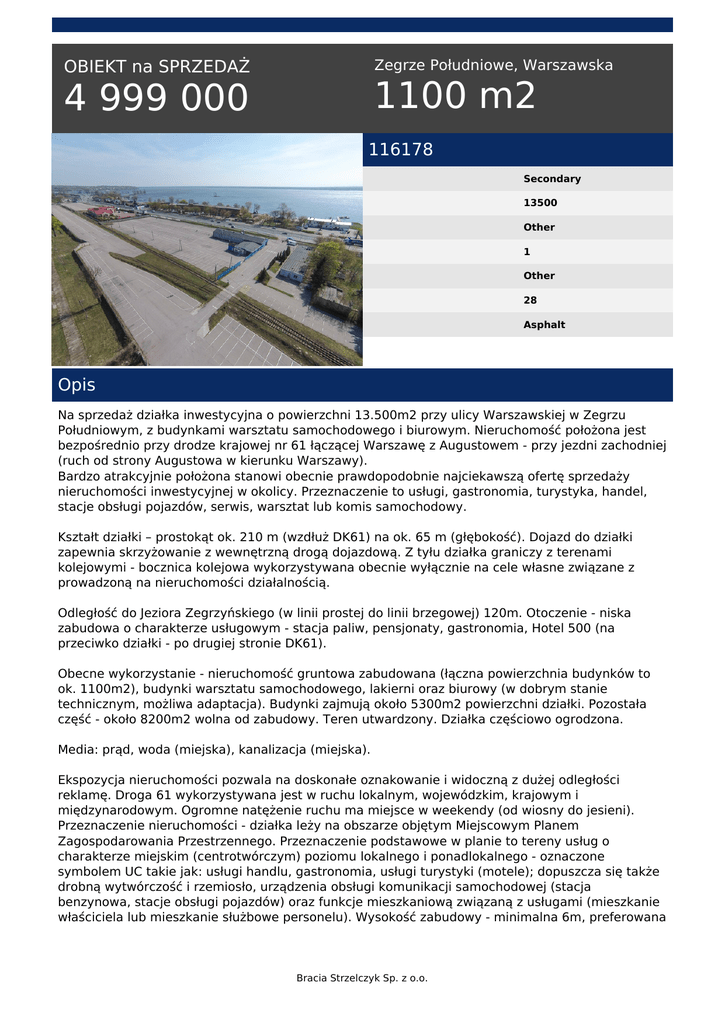 Zegrze Południowe, Warszawska OBIEKT na SPRZEDAŻ 1100 m2 4 999 000 116178 Secondary 13500 Other 1 Other 28 Asphalt Opis Na sprzedaż działka inwestycyjna o powierzchni 13.500m2 przy ulicy Warszawskiej w Zegrzu Południowym, z budynkami warsztatu samochodowego i biurowym. Nieruchomość położona jest bezpośrednio przy drodze krajowej nr 61 łączącej Warszawę z Augustowem - przy jezdni zachodniej (ruch od strony Augustowa w kierunku Warszawy). Bardzo atrakcyjnie położona stanowi obecnie prawdopodobnie najciekawszą ofertę sprzedaży nieruchomości inwestycyjnej w okolicy. Przeznaczenie to usługi, gastronomia, turystyka, handel, stacje obsługi pojazdów, serwis, warsztat lub komis samochodowy. Kształt działki – prostokąt ok. 210 m (wzdłuż DK61) na ok. 65 m (głębokość). Dojazd do działki zapewnia skrzyżowanie z wewnętrzną drogą dojazdową. Z tyłu działka graniczy z terenami kolejowymi - bocznica kolejowa wykorzystywana obecnie wyłącznie na cele własne związane z prowadzoną na nieruchomości działalnością. Odległość do Jeziora Zegrzyńskiego (w linii prostej do linii brzegowej) 120m. Otoczenie - niska zabudowa o charakterze usługowym - stacja paliw, pensjonaty, gastronomia, Hotel 500 (na przeciwko działki - po drugiej stronie DK61). Obecne wykorzystanie - nieruchomość gruntowa zabudowana (łączna powierzchnia budynków to ok. 1100m2), budynki warsztatu samochodowego, lakierni oraz biurowy (w dobrym stanie technicznym, możliwa adaptacja). Budynki zajmują około 5300m2 powierzchni działki. Pozostała część - około 8200m2 wolna od zabudowy. Teren utwardzony. Działka częściowo ogrodzona. Media: prąd, woda (miejska), kanalizacja (miejska). Ekspozycja nieruchomości pozwala na doskonałe oznakowanie i widoczną z dużej odległości reklamę. Droga 61 wykorzystywana jest w ruchu lokalnym, wojewódzkim, krajowym i międzynarodowym. Ogromne natężenie ruchu ma miejsce w weekendy (od wiosny do jesieni). Przeznaczenie nieruchomości - działka leży na obszarze objętym Miejscowym Planem Zagospodarowania Przestrzennego. Przeznaczenie podstawowe w planie to tereny usług o charakterze miejskim (centrotwórczym) poziomu lokalnego i ponadlokalnego - oznaczone symbolem UC takie jak: usługi handlu, gastronomia, usługi turystyki (motele); dopuszcza się także drobną wytwórczość i rzemiosło, urządzenia obsługi komunikacji samochodowej (stacja benzynowa, stacje obsługi pojazdów) oraz funkcje mieszkaniową związaną z usługami (mieszkanie właściciela lub mieszkanie służbowe personelu). Wysokość zabudowy - minimalna 6m, preferowana Bracia Strzelczyk Sp. z o.o. 12m, maksymalna 15m. Preferuje się zabudowę trzykondygnacyjną. Zachowanie powierzchni biologicznie czynnej - min. 25%. Położenie oraz przeznaczenie nieruchomości pretendują ją do wykorzystania na market, galerie handlową, gastronomię (w szczególności drive in). Odległości Zegrze Południowe - Warszawa 25 km, Legionowo 7 km, Serock 7 km Komunikacja - miejski autobus (z Warszawy) linia 735, komunikacja podmiejska (typu PKS, bus). Jezioro Zegrzyńskie to tradycyjne miejsce wypoczynku mieszkańców Mazowsza. Atrakcyjne dla żeglarzy (około 1500 żaglówek i jachtów w sezonie). Oprócz żeglarstwa uprawiany jest również kitesurfing, windsurfing, kajakarstwo, wioślarstwo i sporty motorowodne. Zimą na jeziorze pojawiają się bojery, iceflyery i iceboardy. Akwen jest także atrakcyjnym miejscem dla wędkarzy. Dla inwestorów zainteresowanych większą powierzchnią istnieje możliwość przeniesienia umów dzierżawy terenów sąsiadujących - łącznie nawet do ok. 35.000m2 dodatkowej powierzchni do wykorzystania na parkingi, składy itp. Istnieje możliwość podziału działki dla dwóch lub trzech inwestorów, po wcześniejszych uzgodnieniach. Podana cena dotyczy zakupu nieruchomości jako całości. W przypadku zainteresowania mniejszą powierzchnią oferta zostanie przygotowana indywidualnie. W zależności od opcji inwestycyjnej - sprzedaż nieruchomości może być obciążona podatkiem VAT. Cenę traktować należy więc jako netto. Prosimy o kontakt, celem uzyskania szerszej informacji. Bracia Strzelczyk Sp. z o.o. tel. 22 625 66 61 email: [email protected] Bracia Strzelczyk Sp. z o.o. Powered by TCPDF (www.tcpdf.org)