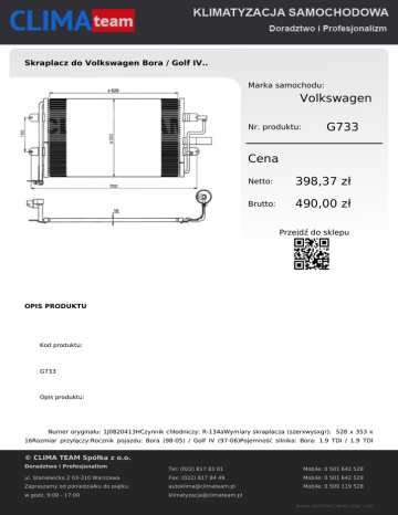 Skraplacz do Volkswagen Bora / Golf IV.. Marka samochodu: Volkswagen Nr. produktu: G733 Cena Netto: 398,37 zł Brutto: 490,00 zł Przejdź do sklepu OPIS PRODUKTU Kod produktu: G733 Opis produktu: Numer oryginału: 1J0820413HCzynnik chłodniczy: R-134aWymiary skraplacza (szerxwysxgr): 528 x 353 x 16Rozmiar przyłączy:Rocznik pojazdu: Bora (98-05) / Golf IV (97-06)Pojemność silnika: Bora: 1.9 TDI / 1.9 TDI © CLIMA TEAM Spółka z o.o. Doradztwo i Profesjonalizm Tel: (022) 817 83 01 Mobile: 0 501 642 528 ul. Staniewicka 2 03-310 Warszawa Fax: (022) 817 84 49 Mobile: 0 501 642 529 Zapraszamy od poniedziałku do piątku [email protected] Mobile: 0 500 119 528 w godz. 9:00 - 17:00 [email protected] projekt GRAFCOM | Netler Shop 1.020 4motionGolf IV: 1.9 TDI / 1.9 TDI 4motion / 1.9 TDI GTi Skraplacz występuje w dwóch opcjach: z gwarancją 1 rok lub 2 lata. Opcje do wyboru poniżej. © CLIMA TEAM Spółka z o.o. Doradztwo i Profesjonalizm Tel: (022) 817 83 01 Mobile: 0 501 642 528 ul. Staniewicka 2 03-310 Warszawa Fax: (022) 817 84 49 Mobile: 0 501 642 529 Zapraszamy od poniedziałku do piątku [email protected] Mobile: 0 500 119 528 w godz. 9:00 - 17:00 [email protected] projekt GRAFCOM | Netler Shop 1.020
