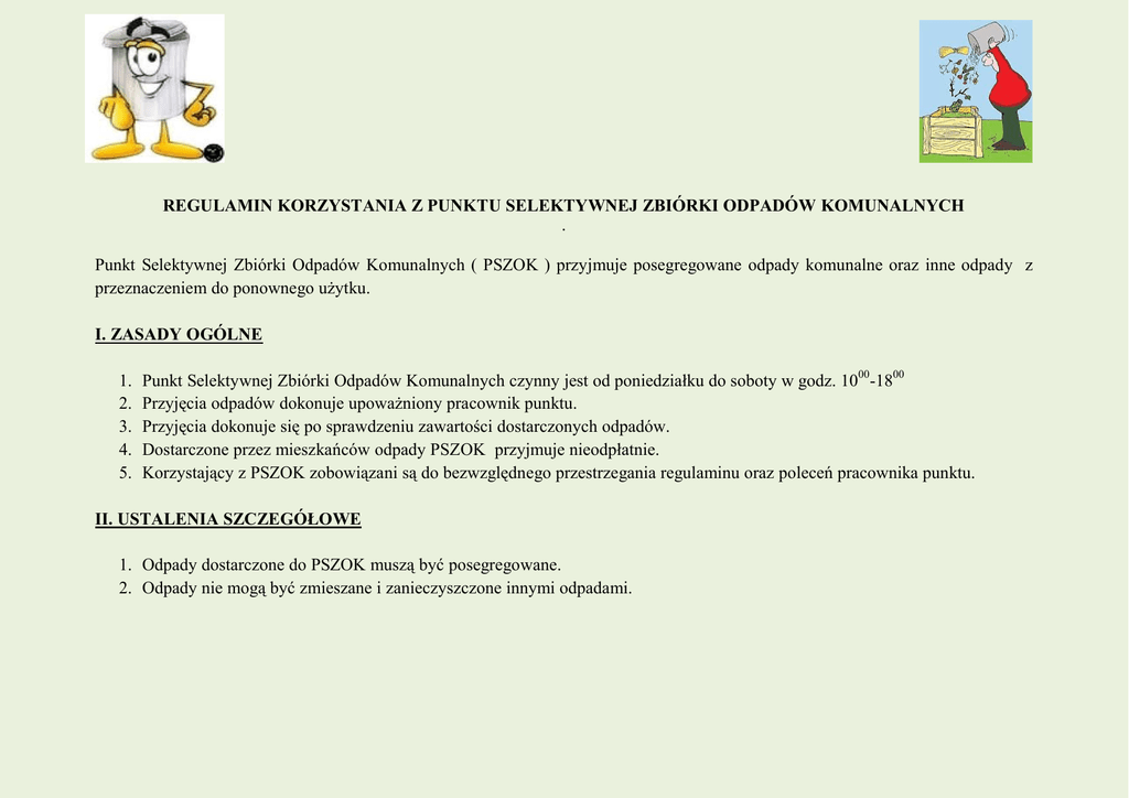 REGULAMIN KORZYSTANIA Z PUNKTU SELEKTYWNEJ ZBIÓRKI ODPADÓW KOMUNALNYCH . Punkt Selektywnej Zbiórki Odpadów Komunalnych ( PSZOK ) przyjmuje posegregowane odpady komunalne oraz inne odpady z przeznaczeniem do ponownego użytku. I. ZASADY OGÓLNE 1. 2. 3. 4. 5. Punkt Selektywnej Zbiórki Odpadów Komunalnych czynny jest od poniedziałku do soboty w godz. 1000-1800 Przyjęcia odpadów dokonuje upoważniony pracownik punktu. Przyjęcia dokonuje się po sprawdzeniu zawartości dostarczonych odpadów. Dostarczone przez mieszkańców odpady PSZOK przyjmuje nieodpłatnie. Korzystający z PSZOK zobowiązani są do bezwzględnego przestrzegania regulaminu oraz poleceń pracownika punktu. II. USTALENIA SZCZEGÓŁOWE 1. Odpady dostarczone do PSZOK muszą być posegregowane. 2. Odpady nie mogą być zmieszane i zanieczyszczone innymi odpadami. ZASADY PRZYJMOWANIA ODPADÓW PSZOK PRZYJMUJE: Papier: -papier piśmienny, gazety, -czasopisma, gazetki reklamowe, -ulotki, katalogi, zeszyty, książki, -opakowania tekturowe, -kartony, tekturę falistą, -torby i worki papierowe. Szkło: -butelki ze szkła po napojach, -słoiki ze szkła (bez nakrętek, zacisków a uszczelek). PSZOK NIE PRZYJMUJE: Papieru - samokopiującego, kalki, -zatłuszczonego papieru po tłuszczach lub margarynach, -papieru woskowanego, -tapet, worków po wapnie, cemencie, gipsie, -kartonów po mleku i napojach, -pieluch jednorazowych i podpasek, ubrań. Szkła: - okiennego, szkła zbrojonego ,szkła żaroodpornego, także gumowych -fajansu, porcelany, ceramiki, doniczek, kryształu, kieliszków, -luster, kineskopów, szyb samochodowych, -świetlówek, żarówek, termometrów. Plastik i metal: Plastiku i metalu: -zgniecione i puste butelki po napojach i chemii gospodarczej, -butelek i pojemników z zawartością, -plastikowe i metalowe nakrętki, -opakowań po lekach, wyrobach garmażeryjnych, olejach -aluminiowe puszki po napojach, drobny metal, spożywczych i silnikowych, -wypłukane kartony po mleku i napojach, -części samochodowych, mebli i ich części, -torebki, folie, worki, reklamówki, folie spożywcze, koszyczki po -jednorazowych naczyń, styropianu, owocach -sprzętu AGD i zabawek zasilanych elektrycznie. Zużyte baterie i akumulatory Przeterminowane leki Meble i inne odpady wielkogabarytowe Zużyte opony Zużyty sprzęt elektryczny i elektroniczny Odpady budowlane - posegregowane wg rodzaju z remontów nie wymagających zgłoszenia lub pozwolenia na budowę wykonanych osobiście w ilości do 1 m3 rocznie przez mieszkańców. 0dpady biodegradowalne i zielone: -resztki roślinne, chwasty, rośliny doniczkowe, zwiędnięte kwiaty; -odpady kuchenne (obierki, zepsute owoce i warzywa, resztki pożywienia), -popiół drzewny, torf, skorupki jaj, włosy, sierść, liście, skoszoną trawę, -papier niezadrukowany, zmiotki, fusy, darń, korę drzew, trociny, -drobne lub rozdrobnione gałęzie Odpadów budowlanych - zmieszanych pochodzących z remontów wymagających zgłoszenia oraz pozwolenia na budowę, a także od firm. odpadów biodegradowwalnych: -mięsa, kości, roślin prażonych chorobami grzybowymi, bakteryjnymi i wirusowymi, -materiału niedostatecznie rozdrobnionego, -materiałów skażonych metalami ciężkimi, pozyskiwanych np. z okolic dróg o dużym nasileniu ruchu, odchodów Dostarczający odpady zobowiązany jest do natychmiastowego zabrania odpadów w przypadku:  stwierdzenia przez pracownika PSZOK ,że odpady dostarczone nie znajdują się na wykazie odpadów aktualnie przyjmowanych,  stwierdzenia zanieczyszczeń i zabrudzeń w dostarczonych odpadach,  stwierdzenia braku możliwości identyfikacji odpadów niebezpiecznych. Przyjmujący odpady pracownik PSZOK wystawi dostarczającemu potwierdzenie przyjęcia odpadu. III. Postanowienia końcowe 1. Skargi i wnioski przyjmowane będą w referacie ds. leśnictwa i ochrony środowiska Urzędu Gminy i Miasta w Janikowie. 2. Zebrane odpady będą przekazywane podmiotom posiadającym zezwolenia właściwego organu, na prowadzenie działalności w zakresie odzysku lub unieszkodliwienia odpadów. 3. Nadzór nad Punktem Selektywnej Zbiórki Odpadów Komunalnych w Janikowie prowadzi Urząd Gminy i Miasta Janikowo.