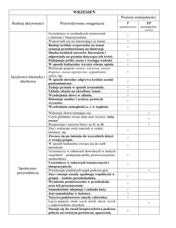 WRZESIEŃ Poziom umiejętności Rodzaj aktywności Przewidywane osiągnięcia Uczestniczy w swobodnych rozmowach z dziećmi i Nauczycielami. Wypowiada się na interesujący je temat. Buduje krótkie wypowiedzi na temat sytuacji przedstawionej na ilustracji. Słucha krótkich utworów literackich i odpowiada na pytania dotyczące ich treści. Podejmuje próby oceny i wyciąga wnioski. W sposób kulturalny wyraża własne opinie. Różnicuje pojęcia: owoce, warzywa, owoce krajowe, owoce egzotyczne, sygnalizator, Językowo-literacka i zebra, itp. W sposób dowolny odgrywa krótkie scenki słuchowa pantomimiczne. Zadaje pytania w sposób zrozumiały. Układa zdania na określony temat. Wyodrębnia słowa w zdaniu. Dokonuje analizy i syntezy prostych wyrazów. Wyodrębnia samogłoski u, o w nagłosie. Społecznoprzyrodnicza Wskazuje słowa rymujące się. Czyta globalnie swoje imię oraz wyrazy: usta, owoce. Rozpoznaje i nazywa litery: u, U, o, O. Zna i wskazuje swój znaczek w szatni, łazience, itp. Zwraca się po imieniu do wszystkich dzieci w swojej grupie. W sposób kulturalny zwraca się do osób dorosłych. Uczestniczy w zabawach dowolnych w małych zespołach – podejmuje próby przezwyciężenia nieśmiałości. Uczestniczy w zabawach tematycznych i integracyjnych. Przestrzega ustalonych reguł podczas gier. Zna i stosuje zasady zgodnego współżycia w grupie – kodeks przedszkolaka. Wymienia pomieszczenia w przedszkolu oraz ich przeznaczenie. Samodzielnie zdejmuje i zakłada buty. Jest samodzielne w łazience. Nazywa podstawowe zmysły człowieka. Łączy pojęcia: smak, węch, dotyk, słuch, wzrok z odpowiednim zmysłem. Stosuje się do zasad bezpieczeństwa podczas pobytu na świeżym powietrzu, spacerach, P PP (podstawowe) (ponadpodstawowe) + + + + + + + + + + + + + + + + + + + + + + + + + + + + + wycieczkach. Matematyczna Zna swój adres i wie komu należy go podawać, a komu nie. Rozpoznaje przedstawicieli służb publicznych: strażaka, policjanta, ratownika medycznego. Określa rolę przedstawicieli służb publicznych: strażaka, policjanta, ratownika medycznego. Obserwuje najbliższe otoczenie i wypowiada się na temat swoich obserwacji. Dokonuje porównania środowiska wiejskiego i miejskiego – wskazuje podobieństwa i różnice w zabudowie i czynnościach (zawodach) ludzi. Wskazuje i nazywa części swojego ciała i drugiej osoby. Dostrzega i nazywa zmiany zachodzące jesienią w przyrodzie. Wskazuje i nazywa części jadalne w warzywach. Przyrządza pod nadzorem dorosłych proste surówki i sałatki. Rozumie i wyjaśnia pojęcie: segregowanie śmieci. Wymienia powody, dla których nie należy zaśmiecać środowiska. Posługuje się wyrażeniami: na, nad, pod, obok, wysoko, nisko w sytuacjach zadaniowych. Wskazuje serce i w odniesieniu do niego stronę prawą i lewą; lewą rękę oznacza za pomocą frotki. Nazywa podstawowe figury geometryczne. Wymienia podobieństwa i różnice pomiędzy dwiema figurami. Klasyfikuje przedmioty ze względu na jedną cechę. Dokonuje uogólnienia sklasyfikowanych przedmiotów (samochody, klocki, zabawki, itp.). Posługuje się pojęciami dotyczącymi wielkości: największy, najmniejszy, większy mniejszy. Łączy pojęcia przeciwstawne. Wychwytuje powtarzające się sekwencje i kontynuuje rytm dwu, trzyelementowy. Przekłada dostrzeżoną regularność z jednej reprezentacji na drugą. Przelicza w dostępnym dla siebie zakresie. Obrazuje liczebność zbioru za pomocą zbiorów zastępczych; tworzy zbiory równoliczne. + + + + + + + + + + + + + + + + + + + + + + + Plastycznotechniczna i grafomotoryczna Muzyczna Ruchowozdrowotna Konstruuje różnorodne budowle z klocków według własnego pomysłu. Prawidłowo trzyma narzędzie malarskie i pisarskie. Rysuje i maluje na dowolny temat. Komponuje postać według wzoru. Układa płaskie i przestrzenne kompozycje z różnych materiałów naturalnych i przyrodniczych. Swobodnie posługuje się kredkami. Koloruje rysunki konturowe. Rysuje w tunelu i po śladzie zgodnie ze wskazanym kierunkiem. Tworzy pracę plastyczną w małym zespole – tworzy kompozycje z przygotowanych przez N. elementów. Nadaje nazwy i tytuły swoim dziełom. Kreśli według wzoru linie ornamenty na tabliczce sucho ścieralnej. Odwzorowuje według wzoru litery u, o na tabliczce suchościeralnej bez liniatury. Śpiewa piosenki Wesoło nam, O przechodzeniu przez ulicę, Ogórek wąsaty, Boogie-woogie w grupie i indywidualnie. Uczestniczy w zabawach tanecznych – reaguje ruchem na zmiany dynamiki, tempa i wysokości dźwięków utworu muzycznego. Odtwarza rytm podany przez N. Uczestniczy w zabawach ruchowych i ćwiczeniach gimnastycznych. Stara się w sposób dokładny naśladować N. w wykonywaniu ćwiczeń. Doskonali sprawność motoryczną (szybkość, siła, skoczność), umiejętność rzutu do celu i umiejętność współpracy w grupie podczas wykonywania ćwiczeń gimnastycznych. Właściwie reaguje na umówione wcześniej sygnały wzrokowe, dźwiękowe w zabawach ruchowych. Bawi się na przedszkolnym placu zabaw z wykorzystaniem sprzętu jordanowskiego w sposób bezpieczny. Odczytuje sens informacji na niektórych znakach drogowych. Właściwie zachowuje się na skrzyżowaniu i podczas przechodzenia przez ulicę. Potrafi wezwać pomoc z wykorzystaniem numeru 112. Wie, dlaczego należy spożywać surowe owoce i warzywa. Przygotowuje potrawy pod nadzorem N. i serwuje innym. + + + + + + + + + + + + + + + + + + + + + + + + +