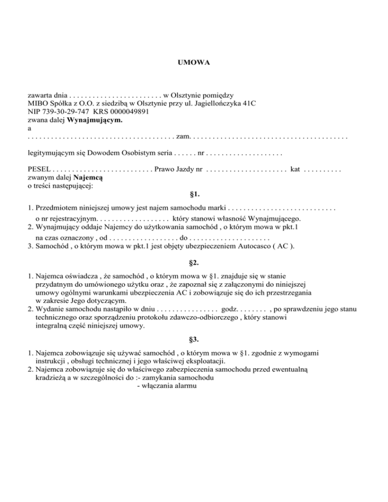 UMOWA zawarta dnia . . . . . . . . . . . . . . . . . . . . . . . . w Olsztynie pomiędzy MIBO Spółka z O.O. z siedzibą w Olsztynie przy ul. Jagiellończyka 41C NIP 739-30-29-747 KRS 0000049891 zwana dalej Wynajmującym. a . . . . . . . . . . . . . . . . . . . . . . . . . . . . . . . . . . . . . . zam. . . . . . . . . . . . . . . . . . . . . . . . . . . . . . . . . . . . . . . . . legitymującym się Dowodem Osobistym seria . . . . . . nr . . . . . . . . . . . . . . . . . . . . PESEL . . . . . . . . . . . . . . . . . . . . . . . . . . Prawo Jazdy nr . . . . . . . . . . . . . . . . . . . . . kat . . . . . . . . . . zwanym dalej Najemcą o treści następującej: §1. 1. Przedmiotem niniejszej umowy jest najem samochodu marki . . . . . . . . . . . . . . . . . . . . . . . . . . . . o nr rejestracyjnym. . . . . . . . . . . . . . . . . . . który stanowi własność Wynajmującego. 2. Wynajmujący oddaje Najemcy do użytkowania samochód , o którym mowa w pkt.1 na czas oznaczony , od . . . . . . . . . . . . . . . . . . do . . . . . . . . . . . . . . . . . . . . . 3. Samochód , o którym mowa w pkt.1 jest objęty ubezpieczeniem Autocasco ( AC ). §2. 1. Najemca oświadcza , że samochód , o którym mowa w §1. znajduje się w stanie przydatnym do umówionego użytku oraz , że zapoznał się z załączonymi do niniejszej umowy ogólnymi warunkami ubezpieczenia AC i zobowiązuje się do ich przestrzegania w zakresie Jego dotyczącym. 2. Wydanie samochodu nastąpiło w dniu . . . . . . . . . . . . . . . . godz. . . . . . . . , po sprawdzeniu jego stanu technicznego oraz sporządzeniu protokołu zdawczo-odbiorczego , który stanowi integralną część niniejszej umowy. §3. 1. Najemca zobowiązuje się używać samochód , o którym mowa w §1. zgodnie z wymogami instrukcji , obsługi technicznej i jego właściwej eksploatacji. 2. Najemca zobowiązuje się do właściwego zabezpieczenia samochodu przed ewentualną kradzieżą a w szczególności do :- zamykania samochodu - włączania alarmu §4. 1. Najemca zapłaci Wynajmującemu tytułem czynszu najmu kwotę: . . . . . . . . . . . . . . . . . zł brutto / dobę , przy limicie 100 kilometrów dziennie. W razie przekroczenia dziennego limitu kilometrów Najemca zapłaci Wynajmującemu kwotę 0,70 zł netto za każdy kilometr ponad limit. 2. Wynagrodzenie o którym mowa w pkt.1 płatne jest w chwili zwrotu samochodu. W przypadku nie zwrócenia samochodu z jakichkolwiek przyczyn w terminie oznaczonym w umowie kwota czynszu staje się wymagalna w dniu oznaczonym na umowie. 3. Koszty paliwa oraz innych materiałów eksploatacyjnych pokrywa Najemca. 4. Najemca otrzymuje samochód zatankowany do poziomu określonego w protokole zdawczo-odbiorczym samochodu i zobowiązuje się zwrócić samochód zatankowany do tego samego poziomu lub pokryć koszt uzupełnienia paliwa do tego poziomu. §5. 1. Przedłużenie okresu najmu , o którym mowa w §1 pkt.2 wymaga pisemnej zgody Wynajmującego po okazaniu w siedzibie Wynajmującego samochodu , o którym mowa w §1. 2. Za nieuzgodnione przedłużenie okresu najmu samochodu Najemca zapłaci Wynajmującemu za każdą dobę stawkę w wysokości 120% stawki podstawowej , o której mowa w §4. §6. W każdym przypadku ,niezwrócenie samochodu , o którym mowa w §1. w terminie oznaczonym w umowie będzie traktowane przez Wynajmującego jako przestępstwo z art.278 Kodeksu Karnego i o fakcie tym zostanie powiadomiona Policja. §7. Najemca zobowiązuje się do nieudostępniania samochodu osobom trzecim oraz do pokrycia powstałych z tego tytułu szkód w pełnej wysokości. Najemca odpowiada za wszelkie szkody wynikające z użytkowania przez niego pojazdu lub jego utraty. §8. 1. W przypadku odmowy wypłaty odszkodowania przez Zakład Ubezpieczeniowy z przyczyn leżących po stronie Najemcy , Najemca zobowiązuje się pokryć wszelkie powstałe straty do pełnej wartości samochodu. 2. W przypadku utraty dokumentów samochodu , kluczy od samochodu lub któregoś z elementów wyposażenia wymienionego w protokole zdawczo-odbiorczym pojazdu , Najemca pokryje koszty odtworzenia utraconych przedmiotów . §9. 1. W przypadku awarii samochodu Najemca niezwłocznie zgłosi się z nim do siedziby Wynajmującego , na własny koszt w celu dokonania naprawy. 2. Jeżeli awaria nastąpi z przyczyn leżących po stronie Najemcy jest on zobowiązany do pokrycia kosztów naprawy. 3. Awaria samochodu w miejscu wykluczającym możliwość dotarcia do siedziby Wynajmującego , a co za tym idzie konieczność naprawy poza jego siedzibą , zostanie uzgodniona z Wynajmującym przez Najemcę telefonicznie pod nr 0/89 535 25 75 w 30 , 31 , 32 §10. W sprawach nieuregulowanych w niniejszej umowie zastosowanie mają przepisy Kodeksu Cywilnego. §11. Wszelkie zmiany niniejszej umowy wymagają formy pisemnej pod rygorem nieważności. §12. Wszelkie spory mogące wyniknąć na tle niniejszej umowy będą rozstrzygane przez właściwy Sąd w Olsztynie. §13. Umowę sporządzono w dwóch jednobrzmiących egzemplarzach , po jednym dla każdej ze stron. za MIBO Sp z O.O. : NAJEMCA: ................... .................