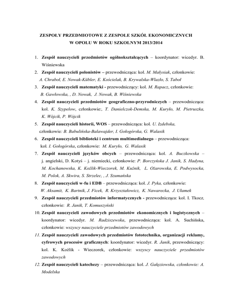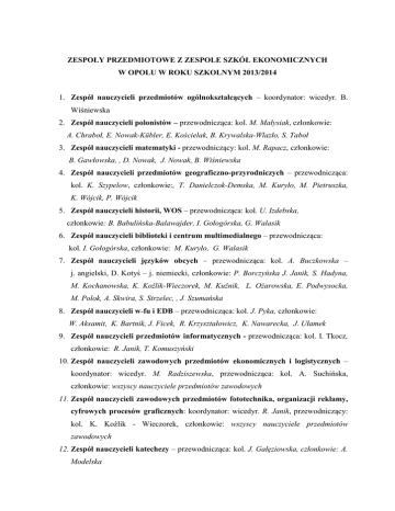 ZESPOŁY PRZEDMIOTOWE Z ZESPOLE SZKÓŁ EKONOMICZNYCH W OPOLU W ROKU SZKOLNYM 2013/2014 1. Zespół nauczycieli przedmiotów ogólnokształcących – koordynator: wicedyr. B. Wiśniewska 2. Zespół nauczycieli polonistów – przewodnicząca: kol. M. Małysiak, członkowie: A. Chraboł, E. Nowak-Kübler, E. Kościelak, B. Krywalska-Wlazło, S. Taboł 3. Zespół nauczycieli matematyki - przewodniczący: kol. M. Rapacz, członkowie: B. Gawłowska, , D. Nowak, J. Nowak, B. Wiśniewska 4. Zespół nauczycieli przedmiotów geograficzno-przyrodniczych – przewodnicząca: kol. K. Szypelow, członkowie:, T. Danielczok-Demska, M. Kuryło, M. Pietruszka, K. Wójcik, P. Wójcik 5. Zespół nauczycieli historii, WOS – przewodnicząca: kol. U. Izdebska, członkowie: B. Babulińska-Balawajder, I. Gołogórska, G. Walasik 6. Zespół nauczycieli biblioteki i centrum multimedialnego – przewodnicząca: kol. I. Gołogórska, członkowie: M. Kuryło, G. Walasik 7. Zespół nauczycieli języków obcych – przewodnicząca: kol. A. Buczkowska – j. angielski, D. Kotyś – j. niemiecki, członkowie: P. Borczyńska J. Janik, S. Hadyna, M. Kochanowska, K. Koźlik-Wieczorek, M. Kuźnik, L. Ożarowska, E. Podwysocka, M. Polok, A. Skwira, S. Strzelec, , J. Szumańska 8. Zespół nauczycieli w-fu i EDB – przewodnicząca: kol. J. Pyka, członkowie: W. Aksamit, K. Bartnik, J. Ficek, R. Krzyształowicz, K. Nawarecka, J. Ułamek 9. Zespół nauczycieli przedmiotów informatycznych - przewodnicząca: kol. I. Tkocz, członkowie: R. Janik, T. Komuszyński 10. Zespół nauczycieli zawodowych przedmiotów ekonomicznych i logistycznych – koordynator: wicedyr. M. Radziszewska, przewodnicząca: kol. A. Suchińska, członkowie: wszyscy nauczyciele przedmiotów zawodowych 11. Zespół nauczycieli zawodowych przedmiotów fototechnika, organizacji reklamy, cyfrowych procesów graficznych: koordynator: wicedyr. R. Janik, przewodniczący: kol. K. Koźlik - Wieczorek, członkowie: wszyscy nauczyciele przedmiotów zawodowych 12. Zespół nauczycieli katechezy – przewodnicząca: kol. J. Gałęziowska, członkowie: A. Modelska PRZYDZIAŁ OPIEKUŃSTW NAD ORGANIZACJAMI SPOŁECZNYMI DZIAŁAJĄCYMI W ZESPOLE SZKÓŁ EKONOMICZNYCH W OPOLU W ROKU SZKOLNYM 2013/2014 ORAZ INNYCH STAŁYCH PRAC I ZAJĘĆ DLA NAUCZYCIELI Samorząd Szkolny: kol. A. Suchińska, S. Strzelec, L. Ożarowska Kronika wydarzeń w fotografii: kol. K. Koźlik-Wieczorek, P. Wójcik, P. Stauffer, M. Bączyńska SKS i zawody sportowe: koordynator kol. J. Pyka PCK i wolontariat: kol. K. Romanowska, M. Rapacz, J. Gałęziowska Klub „Europa w szkole”: kol. U. Izdebska Sekcja muzyczna: kol. D. Kaźmierczak, kol. G. Walasik Techniczna obsługa uroczystości: kol. W. Aksamit, J. Ułamek, G. Walasik, J. Nowak Program Edukacji Obywatelskiej i Patriotycznej: kol. B. Babulińska-Balawajder Program Przyhamuj, życie przed tobą: kol. K. Bartnik, K. Nawarecka Pedagog szkolny: kol. E. Turczyńska Psycholog: kol. B. Kwiatkowska Doradca zawodowy: kol. J. Włoch Przewodnicząca Zespołu Wychowawczego: kol. B. Wiśniewska Ubezpieczenie młodzieży: wicedyr. B. Wiśniewska i specjalista ds. kadr- I. Baran Przygotowanie do olimpiad ekonomicznych: koordynator kol. D. Hausner Przygotowanie planu lekcji: R. Janik, K. Janik Współpraca z zagranicą: przewodnicząca: kol. P. Borczyńska, członkowie: A. Skwira, S. Strzelec, M. Polok, E. Podwysocka, M. Kuźnik, J. Janik, S. Taboł Współpraca z Uniwersytetem Opolskim, Politechniką Opolską, WSZiA, WSB we Wrocławiu, Uniwersytetem Wrocławskim: koordynują kol. M. Radziszewska, J. Nowak, K. Nawarecka, A. Sudoł Indywidualny tok nauki i nauczania: wicedyr. B. Wiśniewska Praktyki pedagogiczne dla studentów UO i PO: opieka dyr. E. Nowak-Kübler i wicedyrektorzy Praktyki zawodowe dla uczniów: organizacja kol. R. Janik Liderzy WDN: nauczyciele posiadający stopień nauczyciela dyplomowanego – przewodniczący kol. M. Pietruszka, A. Suchińska Komisja inwentaryzacyjna i ds. wybrakowania sprzętów, dokumentacji, pieczęci: przewodnicząca: kol. Z. Zawiślak, członkowie: kol. M. Woszek, ,D. Kordek, A. Rogowska, W. Aksamit Kronika sportowa: kol. J. Ficek, I. Pyka Społeczny inspektor pracy: kol. J. Ułamek Zespół ds. WSO: przewodnicząca: kol. B. Wiśniewska, członkowie: M. Rapacz, S. Hadyna, U. Izdebska, M. Małysiak, K. Romanowska Zespół ds. statutowych: przewodnicząca kol. M. Radziszewska, K. Szypelow, Ł. Denys, D. Nowak, W. Hernes Komisja socjalna: przewodnicząca: kol. M. Woszek, członkowie: M. Mika, S. Strzelec, P. Borczyńska Komisja ds. dofinansowania doskonalenia nauczycieli: kol. D. Łubińska, A. Buczkowska, J. Nowak Nadzór nad opracowaniem danych do Systemu Informacji Oświatowej: wicedyr. M. Radziszewska, B. Wiśniewska, R. Janik, opracowanie danych: kol. K. Janik, I. Tkocz Komisja ds. promocji szkoły: koordynator: dyr. E. Nowak-Kübler , członkowie: R. Janik, J. Włoch, K. Janik, K. Koźlik-Wieczorek, P. Wójcik, L. Ożarowska, J. Ficek, K. Nowakowska, B. Krywalska-Wlazło, D. Kordek, T. Stotko Zespół ds. realizacji programu „Szkoła bez przemocy”: przewodnicząca: kol. E. Turczyńska, K. Bartnik, B. Kwiatkowska, K. Nawarecka, wychowawcy klas Komisja stypendialna: przewodnicząca: B. Wiśniewska, E.Turczyńska, B. Kwiatkowska, wychowawcy klas, przedstawiciele Samorządu Uczniowskiego, przedstawiciel Rady Rodziców Opieka nad Mini Przedsiębiorstwem: kol. D. Hausner, T. Słodkowska - Tramś Zespół ds. ewaluacji wewnętrznej szkoły: koordynator: kol. R. Janik, przewodniczący: kol., S. Taboł członkowie: J. Nowak, E. Turczyńska, J. Włoch, U. Izdebska, D. Nowak, przewodniczący komisji przedmiotowych Program Leonardo da Vinci: koordynator: kol. S. Strzelec, L. Ożarowska, K. Romanowska, D. Kotyś Program Comenius: koordynator: kol. A. Skwira, M. Polok, E. Podwysocka, J. Janik Realizacja Programu Operacyjnego Kapitał Ludzki: koordynator: kol. J. Włoch Realizacja programów we współpracy z OCRG: k