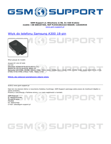GSM-Support ul. Bitschana 2/38, 31-420 Kraków mobile +48 608107455, NIP PL9451852164 REGON: 120203925 www.gsm-support.pl Wtyk do telefonu Samsung A300 18-pin Wtyk pasuje do modeli: Alcatel OT-152 OT-835 LG 510 Mitsubishi MT560 M330 M320 M322i 110 Sagem MY-C2 C4 Wonu-S1 Wonu-S3 Samsung SGH-D500, D500E, D500S, D508, D510, D600, D600e, E217, E340, E350, E350e, E360, E640, E650, E700, E730, E730e, E750, E760, E760e, T309, T309e, X700 Kliknij, aby zobaczyć powiększone zdjęcie wtyku ©2012 www.gsm-support.pl Opis ten nie stanowi oferty w rozumieniu Kodeksu Cywilnego. GSM-Support zastrzega sobie prawo do możliwych błędów w opisie produktu. Prosimy o weryfikację z Państwa strony, a w razie wątpliwości o kontakt. GSM-Support ul. Bitschana 2/38 31-420 Kraków POLSKA tel. 608107455 e-mail: [email protected] Powered by TCPDF (www.tcpdf.org)