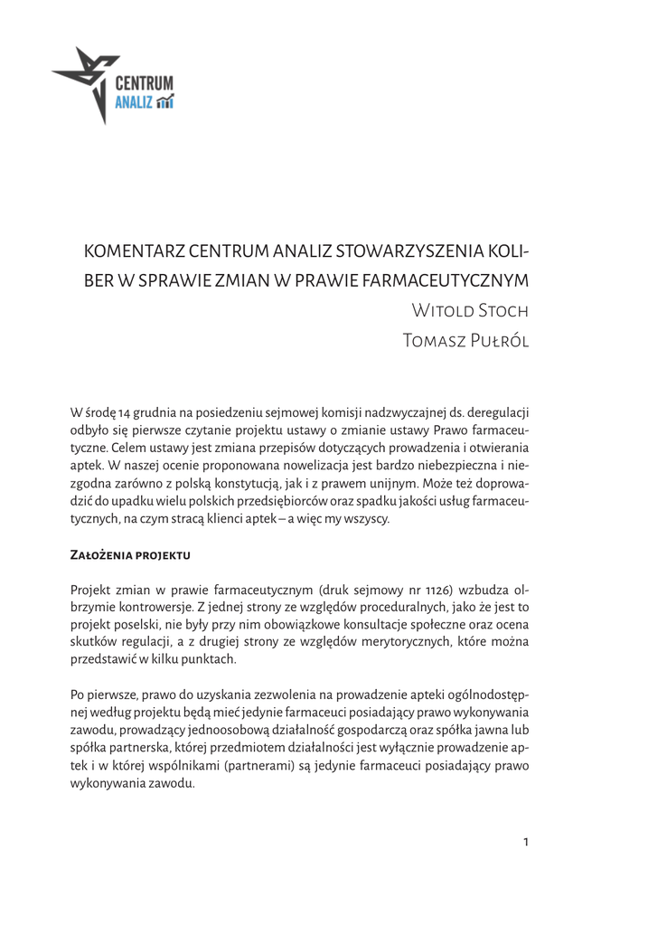 Mikołaj kukliński Podatek samochodowy W mediach niedawno pojawiła się informacja, że Ministerstwo Finansów pracuje nad nowym podatkiem,CENTRUM który miałby obowiązywać właścicieli samochodówKOLIniespełniająKOMENTARZ ANALIZ STOWARZYSZENIA cych normy emisji spalinZMIAN „Euro 4”,W czyli wyprodukowanych przed 2006 rokiem. SzczeBER W SPRAWIE PRAWIE FARMACEUTYCZNYM góły mają zostać opublikowane we wrześniu bieżącego roku. Aktualne informacje Witold Stoch udzielane przez Ministerstwo są dość skąpe. Zgodnie z nimi nowy podatek nie ma na Tomasz Pułról celu zwiększenia dochodów do budżetu, ma jedynie utrzymać je na tym samym poziomie1. Nie ma możliwości wprowadzenia dodatkowego podatku, który współistniałby z podatkiem akcyzowym. To sugeruje, że w grę wchodzi przede wszystkim modyfikacja W środę 14 grudnia na posiedzeniu sejmowej komisji nadzwyczajnej ds. deregulacji odbyło się pierwsze czytanie ustawy zmianie ustawy Prawo farmaceuobecnego stanu rzeczy, któryprojektu przedstawia sięonastępująco. tyczne. Celem ustawy jest zmiana przepisów dotyczących prowadzenia i otwierania wynosi 3,1%nowelizacja od wartościjest pojazdu aptek.Podatek W naszejakcyzowy ocenie proponowana bardzow przypadku niebezpiecznasamochodów i nie3 zgodna zarówno w silniki z polską konstytucją, jakskokowej i z prawemdounijnym. Może doprowawyposażonych o pojemności 2000 cm orazteż18,6% powyżej tej dzić do upadku wielu polskich przedsiębiorców oraz spadku jakości usług farmaceupojemności (Tab. 1). Mimo jego– kryterium może to sugerować, podatek ten nie tycznych, na czym stracą klienciże aptek a więc my wszyscy. ma na celu zmniejszenia emisji szkodliwych substancji. Ta zresztą nie zależy tylko od Założenia projektu pojemności silnika, lecz także od wieku konstrukcji, zastosowanych fabrycznie systeProjekt zmian w prawiespaliny farmaceutycznym (druk sejmowy nr 1126)W praktyce wzbudza olmów oczyszczających i stanu technicznego samochodu. dochody brzymie kontrowersje. Z jednej strony ze względów proceduralnych, jako że jest to z akcyzy zasilająniebezpośrednio państwa, nie mają społeczne więc żadnego projekt poselski, były przy nimbudżet obowiązkowe konsultacje oraz konkretnego ocena skutków regulacji, a z drugiej strony ze względów merytorycznych, które można przeznaczenia. przedstawić w kilku punktach. Tab. 1 Stawka akcyzy Po pierwsze, prawo do uzyskania zezwolenia na prowadzenie apteki ogólnodostępPojemność skokowa wartości pojazdu nej według projektu %będą mieć jedynie farmaceuci posiadający prawo wykonywania 3 < 2000 cm zawodu, prowadzący3,1jednoosobową działalność gospodarczą oraz spółka jawna lub > 2000partnerska, cm3 18,6 przedmiotem działalności jest wyłącznie prowadzenie apspółka której Źródło: tek i w http://www.finanse.mf.gov.pl/documents/766655/927897/stawki_akcyzy_2016.pdf której wspólnikami (partnerami) są jedynie farmaceuci posiadający prawo wykonywania zawodu. P. Kozłowski, 7 na 10 kierowców zapłaci nowy podatek?, [online] moto.pl, dostępny w Internecie: http://moto.pl/ MotoPL/1,88389,20415652,7-na-10-kierowcow-zaplaci-nowy-podatek.html (dostęp: 15.08.2016). 1 1 1 Po drugie, projekt przewiduje, że jeden farmaceuta lub spółka, w której farmaceuci decydują o sprawach spółki, może prowadzić lub kontrolować maksymalnie 4 apteki. Po trzecie, projekt zakłada, że zezwolenie może być wydane, gdy na dzień złożenia wniosku o wydanie zezwolenia liczba mieszkańców w danym województwie, w przeliczeniu na jedną aptekę ogólnodostępną, wynosi co najmniej 3000 osób, a odległość od miejsca planowanej lokalizacji apteki do najbliższej funkcjonującej apteki ogólnodostępnej, liczona od wejścia do apteki w linii prostej, wynosi co najmniej 500 metrów. Jednocześnie zakłada, że wspomniane kryteria nie będą miały zastosowania, jeżeli na dzień złożenia wniosku odległość między aptekami byłaby większa niż 1000 m. Po czwarte, projekt przewiduje, że do zezwoleń na prowadzenie aptek ogólnodostępnych nie będzie stosować się przepisów Kodeksu spółek handlowych dotyczących przekształceń. Wyjątek, a więc sytuacja, gdy zezwolenia będą przechodzić na podmiot przekształcony, dotyczyć będzie przekształceń w spółki jawne i partnerskie, w których wspólnikami i partnerami będą farmaceuci posiadający prawo wykonywania zawodu farmaceuty. Po piąte, projekt wprowadza zmiany w dziedziczeniu aptek: nowymi kryteriami będą posiadanie maksymalnie czterech aptek oraz wymóg bycia farmaceutą posiadającym prawo wykonywania zawodu. Przyczyny wprowadzenia projektu Zdaniem wnioskodawców zmiany w prawie farmaceutycznym są konieczne, gdyż obecnie obowiązujące przepisy nie przewidują ograniczeń w zakładaniu aptek ogólnodostępnych ze względu na ich liczbę na danym obszarze, odległość od innych aptek, czy też formę prowadzenia działalności. W ich mniemaniu, brak jakichkolwiek zasad odnoszących się do uwarunkowań demograficznych lub terytorialnych powoduje bardzo szybki wzrost liczby aptek, a jednocześnie możliwość posiadania aptek przez spółki kapitałowe, co ma rodzić znaczne problemy w kontekście możliwości sprawowania prawidłowego nadzoru nad ich działalnością. Wnioskodawcy twierdzą, że zjawisko to, występujące w największym natężeniu w dużych miastach, łączy się z powstawaniem wielu bardzo negatywnych następstw rzutujących na możliwość prawidłowego realizowania przez apteki ich zadań jako placówek ochrony zdrowia publicznego. W opinii twórców projektu obecna regulacja jest zbyt liberalna i niewłaściwa, bowiem co czwarta apteka sieci aptecznych działa z naruszeniem przepisów w zakresie wymogu antykoncentracji, na rynku występują trudności w dostępie do leków, apte- 2 ki prowadzone przez podmioty niebędące farmaceutami nie przestrzegają zakazu reklamy aptek i działalności oraz nie sł