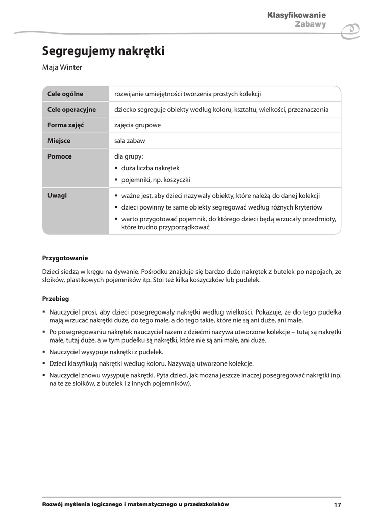 Klasyfikowanie Zabawy Segregujemy nakrętki Maja Winter Cele ogólne rozwijanie umiejętności tworzenia prostych kolekcji Cele operacyjne dziecko segreguje obiekty według koloru, kształtu, wielkości, przeznaczenia Forma zajęć zajęcia grupowe Miejsce sala zabaw Pomoce dla grupy: duża liczba nakrętek pojemniki, np. koszyczki Uwagi ważne jest, aby dzieci nazywały obiekty, które należą do danej kolekcji dzieci powinny te same obiekty segregować według różnych kryteriów warto przygotować pojemnik, do którego dzieci będą wrzucały przedmioty, które trudno przyporządkować Przygotowanie Dzieci siedzą w kręgu na dywanie. Pośrodku znajduje się bardzo dużo nakrętek z butelek po napojach, ze słoików, plastikowych pojemników itp. Stoi też kilka koszyczków lub pudełek. Przebieg Nauczyciel prosi, aby dzieci posegregowały nakrętki według wielkości. Pokazuje, że do tego pudełka mają wrzucać nakrętki duże, do tego małe, a do tego takie, które nie są ani duże, ani małe. Po posegregowaniu nakrętek nauczyciel razem z dziećmi nazywa utworzone kolekcje – tutaj są nakrętki małe, tutaj duże, a w tym pudełku są nakrętki, które nie są ani małe, ani duże. Nauczyciel wysypuje nakrętki z pudełek. Dzieci klasyfikują nakrętki według koloru. Nazywają utworzone kolekcje. Nauczyciel znowu wysypuje nakrętki. Pyta dzieci, jak można jeszcze inaczej posegregować nakrętki (np. na te ze słoików, z butelek i z innych pojemników). Rozwój myślenia logicznego i matematycznego u przedszkolaków 17