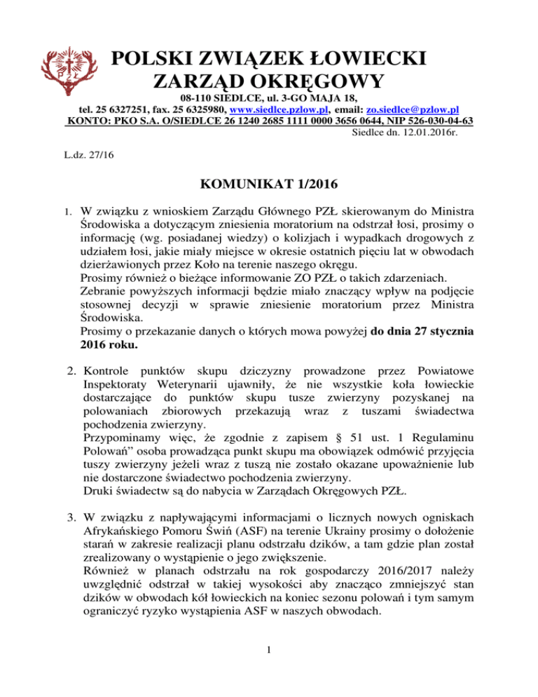 POLSKI ZWIĄZEK ŁOWIECKI ZARZĄD OKRĘGOWY 08-110 SIEDLCE, ul. 3-GO MAJA 18, tel. 25 6327251, fax. 25 6325980, www.siedlce.pzlow.pl, email: [email protected] KONTO: PKO S.A. O/SIEDLCE 26 1240 2685 1111 0000 3656 0644, NIP 526-030-04-63 Siedlce dn. 12.01.2016r. L.dz. 27/16 KOMUNIKAT 1/2016 1. W związku z wnioskiem Zarządu Głównego PZŁ skierowanym do Ministra Środowiska a dotyczącym zniesienia moratorium na odstrzał łosi, prosimy o informację (wg. posiadanej wiedzy) o kolizjach i wypadkach drogowych z udziałem łosi, jakie miały miejsce w okresie ostatnich pięciu lat w obwodach dzierżawionych przez Koło na terenie naszego okręgu. Prosimy również o bieżące informowanie ZO PZŁ o takich zdarzeniach. Zebranie powyższych informacji będzie miało znaczący wpływ na podjęcie stosownej decyzji w sprawie zniesienie moratorium przez Ministra Środowiska. Prosimy o przekazanie danych o których mowa powyżej do dnia 27 stycznia 2016 roku. 2. Kontrole punktów skupu dziczyzny prowadzone przez Powiatowe Inspektoraty Weterynarii ujawniły, że nie wszystkie koła łowieckie dostarczające do punktów skupu tusze zwierzyny pozyskanej na polowaniach zbiorowych przekazują wraz z tuszami świadectwa pochodzenia zwierzyny. Przypominamy więc, że zgodnie z zapisem § 51 ust. 1 Regulaminu Polowań” osoba prowadząca punkt skupu ma obowiązek odmówić przyjęcia tuszy zwierzyny jeżeli wraz z tuszą nie zostało okazane upoważnienie lub nie dostarczone świadectwo pochodzenia zwierzyny. Druki świadectw są do nabycia w Zarządach Okręgowych PZŁ. 3. W związku z napływającymi informacjami o licznych nowych ogniskach Afrykańskiego Pomoru Świń (ASF) na terenie Ukrainy prosimy o dołożenie starań w zakresie realizacji planu odstrzału dzików, a tam gdzie plan został zrealizowany o wystąpienie o jego zwiększenie. Również w planach odstrzału na rok gospodarczy 2016/2017 należy uwzględnić odstrzał w takiej wysokości aby znacząco zmniejszyć stan dzików w obwodach kół łowieckich na koniec sezonu polowań i tym samym ograniczyć ryzyko wystąpienia ASF w naszych obwodach. 1 4. Z informacji uzyskanych z Inspektoratów Weterynarii wynika, że nie wszystkie koła wywiązują się z umów dotyczących przekazania do badań odstrzelonych lisów. Prosimy zatem o dołożenie starań aby umowy podpisane z PIW na 2016 rok zostały zrealizowane w całości. 5. Przypominamy o dostarczaniu do ZO PZŁ przesłanych z naszym komunikatem nr 4/2015 z dn. 28.10.2015r. ankiet z danymi osobowymi myśliwych zamieszkałych na terenie siedleckiego okręgu PZŁ oraz aktualnych zdjęć o wymiarach 35x45 mm (typowe zdjęcie do dowodu osobistego lub paszportu). Aktualizacja danych osobowych w systemie informatycznym PZŁ oraz aktualne zdjęcia niezbędne są do wydania nowych legitymacji członkowskich PZŁ – nowa legitymacja będzie wyglądem przypominać dowód osobisty. Ankieta oraz informacje o wymianie legitymacji oraz wymogów jakie winny spełniać zdjęcia do nich załączone są na naszej stronie internetowej http://www.siedlce.pzlow.pl/komunikaty.html - OKÓLNIK 29/IT/2015 Zarządu Głównego PZŁ w sprawie legitymacji członkowskich. Ankieta w wersji edytowalnej w formacie Word znajduje się pod adresem http://www.siedlce.pzlow.pl/druki.html - dane osobowe myśliwego. Podstawa prawna dot. aktualizacji danych - § 7 ust 2 pkt 1, § 13 pkt 5 Statutu PZŁ, oraz Uchwała NRŁ nr 41/2007 z późniejszymi zmianami. 6. Uchwałą nr 14/2015 z dnia 15 grudnia 2015 roku Naczelna Rada Łowiecka przyjęła nowe zasady selekcji populacyjnej i osobniczej zwierząt łownych w Polsce oraz zasady postępowania przy ocenie zgodności odstrzału. Papierową wersję tego dokumentu prześlemy do kół przy następnym komunikacie, wersja elektroniczna dostępna jest na naszej stronie internetowej http://www.siedlce.pzlow.pl/komunikaty.html „Darz Bór” Zarząd Okręgowy PZŁ w Siedlcach 2