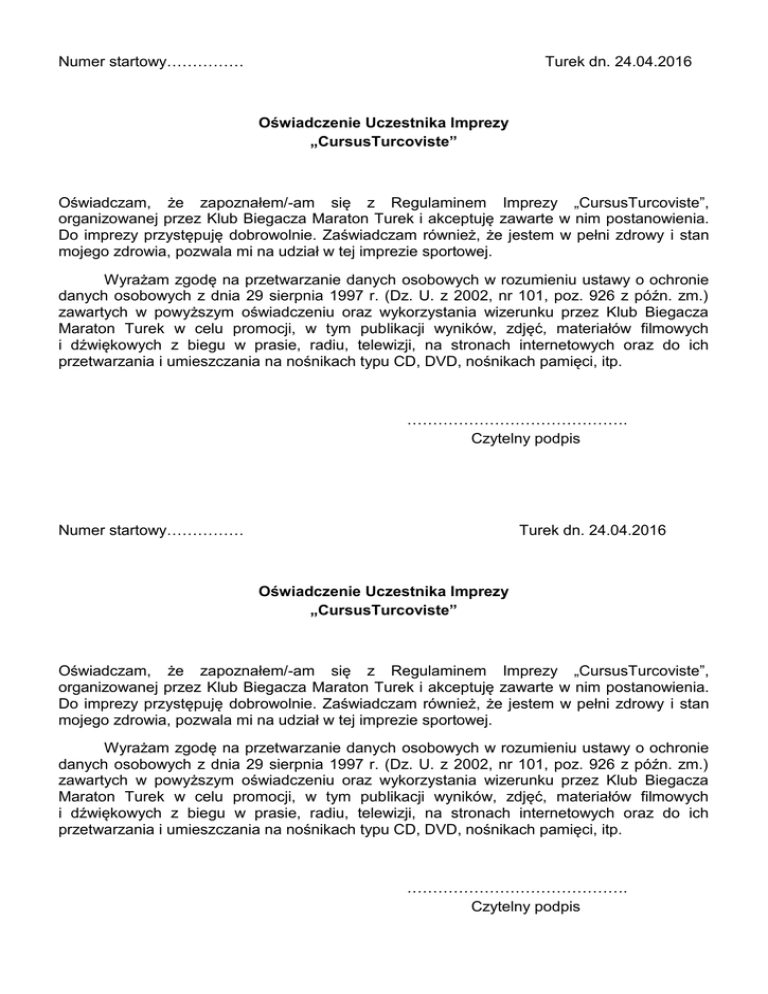 Numer startowy…………… Turek dn. 24.04.2016 Oświadczenie Uczestnika Imprezy „CursusTurcoviste” Oświadczam, że zapoznałem/-am się z Regulaminem Imprezy „CursusTurcoviste”, organizowanej przez Klub Biegacza Maraton Turek i akceptuję zawarte w nim postanowienia. Do imprezy przystępuję dobrowolnie. Zaświadczam również, że jestem w pełni zdrowy i stan mojego zdrowia, pozwala mi na udział w tej imprezie sportowej. Wyrażam zgodę na przetwarzanie danych osobowych w rozumieniu ustawy o ochronie danych osobowych z dnia 29 sierpnia 1997 r. (Dz. U. z 2002, nr 101, poz. 926 z późn. zm.) zawartych w powyższym oświadczeniu oraz wykorzystania wizerunku przez Klub Biegacza Maraton Turek w celu promocji, w tym publikacji wyników, zdjęć, materiałów filmowych i dźwiękowych z biegu w prasie, radiu, telewizji, na stronach internetowych oraz do ich przetwarzania i umieszczania na nośnikach typu CD, DVD, nośnikach pamięci, itp. ……………………………………. Czytelny podpis Numer startowy…………… Turek dn. 24.04.2016 Oświadczenie Uczestnika Imprezy „CursusTurcoviste” Oświadczam, że zapoznałem/-am się z Regulaminem Imprezy „CursusTurcoviste”, organizowanej przez Klub Biegacza Maraton Turek i akceptuję zawarte w nim postanowienia. Do imprezy przystępuję dobrowolnie. Zaświadczam również, że jestem w pełni zdrowy i stan mojego zdrowia, pozwala mi na udział w tej imprezie sportowej. Wyrażam zgodę na przetwarzanie danych osobowych w rozumieniu ustawy o ochronie danych osobowych z dnia 29 sierpnia 1997 r. (Dz. U. z 2002, nr 101, poz. 926 z późn. zm.) zawartych w powyższym oświadczeniu oraz wykorzystania wizerunku przez Klub Biegacza Maraton Turek w celu promocji, w tym publikacji wyników, zdjęć, materiałów filmowych i dźwiękowych z biegu w prasie, radiu, telewizji, na stronach internetowych oraz do ich przetwarzania i umieszczania na nośnikach typu CD, DVD, nośnikach pamięci, itp. ……………………………………. Czytelny podpis