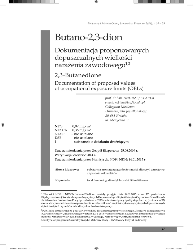 Podstawy i Metody Oceny Środowiska Pracy, nr 2(84), s. 37—59 Butano-2,3-dion Dokumentacja proponowanych dopuszczalnych wielkości narażenia zawodowego1,2 2,3-Butanedione Documentation of proposed values of occupational exposure limits (OELs) prof. dr hab. ANDRZEJ STAREK e-mail: [email protected] Collegium Medicum Uniwersytetu Jagiellońskiego 30-688 Kraków ul. Medyczna 9 NDS NDSCh NDSP DSB I 0,07 mg/m3 0,36 mg/m3 – nie ustalano – nie ustalano – substancja o działaniu drażniącym Data zatwierdzenia przez Zespół Ekspertów: 25.06.2009 r. Weryfikacja: czerwiec 2014 r. Data zatwierdzenia przez Komisją ds. NDS i NDN: 14.01.2015 r. Słowa kluczowe: substancja aromatyzująca do żywności, diacetyl, zarostowe zapalenie oskrzelików. Keywords: food flavouring, diacetyl, bronchiolitis obliterans. 1 Wartości NDS i NDSCh butano-2,3-dionu zostały przyjęte dnia 14.01.2015 r. na 77. posiedzeniu Międzyresortowej Komisji do spraw Najwyższych Dopuszczalnych Stężeń i Natężeń Czynników Szkodliwych dla Zdrowia w Środowisku Pracy i przedłożone w 2015 r. ministrowi pracy i polityki społecznej (wniosek nr 93) w celu ich wprowadzenia do rozporządzenia w załączniku nr 1 części A wykazu najwyższych dopuszczalnych stężeń i natężeń czynników szkodliwych w środowisku pracy. 2 Publikacja opracowana na podstawie wyników II etapu programu wieloletniego „Poprawa bezpieczeństwa i warunków pracy”, finansowanego w latach 2011-2013 w zakresie badań naukowych i prac rozwojowych ze środków Ministerstwa Nauki i Szkolnictwa Wyższego/Narodowego Centrum Badań i Rozwoju. Koordynator programu: Centralny Instytut Ochrony Pracy – Państwowy Instytut Badawczy. 37 Butano-2,3-dion.indd 37 2015-07-03 14:01:05 Andrzej Starek Streszczenie Butano-2,3-dion (diacetyl) jest cieczą o zapachu masła, stosowaną jako substancja aromatyzująca do żywności, zwłaszcza: wyrobów piekarniczych, słodyczy i lodów. Jest ona głównie stosowana jako dodatek do prażonej kukurydzy przeznaczonej do przygotowania w kuchence mikrofalowej. Narażenie na ten związek występuje w przemyśle chemicznym i spożywczym. Jest ono zróżnicowane i zależne od stanowiska pracy. Stężenia tego związku w powietrzu sięgają od kilku do kilkuset miligramów na metr sześcienny (mg/m3). W Polsce stężenie diacetylu w fabryce ciastek wynosiło 51 mg/m3. Butano-2,3-dion w warunkach narażenia jednorazowego i powtarzanego działa silnie drażniąco na: oczy, drogi oddechowe i skórę. U osób narażonych zawodowo na ten związek obserwowano dolegliwości ze strony układu oddechowego oraz zmiany spirometryczne wskazujące na obstrukcję i restrykcję dróg oddechowych. Butano-2,3-dion jest uważany ponadto za czynnik etiologiczny zarostowego zapalenia oskrzelików. Pod względem siły działania ostrego butano-2,3-dion znajduje się poza klasyfikacją substancji toksycznych. Dane z piśmiennictwa wskazują na genotoksyczne działanie butano-2,3-dionu. Związek ten indukował mutacje punktowe oraz działał klastogennie. Brak jest wystarczających danych odnośnie do rakotwórczego działania tego związku. W dostępnym piśmiennictwie brak jest również danych na temat: gonadotoksycznego, embriotoksycznego, fetotoksycznego i teratogennego działania butano-2,3-dionu. W Polsce i w wielu innych państwach nie ustalono wartości dopuszczalnych stężeń dla butano-2,3-dionu. Na posiedzeniu Komitetu Doradczego ds. Bezpieczeństwa i Zdrowia w Miejscu Pracy (ACSH, Advisory Committee on Safety and Health at Work) 27.11.2014 r. przyjęto wartość OEL dla butano-2,3-dionu na poziomie 0,07 mg/m3 oraz wartość STEL wynoszącą 0,36 mg/m3. W 2011 r. ACGIH zaleciła wartości TLV i STEL odpowiednio na poziomach 0,035 i 0,070 mg/m3. Podstawą do obliczenia wartości NDS dla butano-2,3-dionu były wyniki badań epidemiologicznych wskazujące, że zmiany obstrukcyjne i restrykcyjne w układzie oddechowym, wyrażone spadkiem wartości maksymalnej pojemności wydechowej pierwszosekundowej (FEV1), nie występują u pracowników przy narażeniu skumulowanym wynoszącym 2,33 mg/m3 . lata. Stężenie to przyjęto za wartość NOAEC. Współczynniki niepewności o łącznej wartości 4 posłużyły do obliczenia wartości NDS na poziomie 0,05 mg/m3. Na podstawie wartości NDS obliczono wartość NDSCh dla butano-2,3-dionu na poziomie 0,10 mg/m3. Ponadto zalecono oznakowanie substancji literą „I” – substancja o działaniu drażniącym. Summary 2,3-Butanedione (diacetyl) is a greenish-yellow liquid with a characteristic buttery odour. Diacetyl is used as an artificial flavouring substance in processed food, e.g., microwave popcorn, confectionery, dairy products and beverages. Exposure to this compound occurs in chemical and food manufacturing industries. The concentrations of diacetyl at the workplace air range from several to several hundred mg/m3. In Poland, the average air concentration of diacetyl at the confectionary manufacture was 51 mg/m3. A single and repeated exposures to diacetyl lead to irritation to the eyes, respiratory tract and skin. Persons professionally exposed to this compound had respiratory tract disorders with spirometric changes indicating obstruction and restriction of the small airways. Moreover, diacetyl is consider as etiologic factor of bronchiolitis obliterans. In respect of acute toxicity, diacetyl is not in the classification of toxic substances. The literature data indicate the genotoxicity of this compound. Diacetyl induced point mutations and exerted clastogenic effect. There are no adequate data on carcinogenicity of diacetyl in humans and animals, and on gonadotoxic, embriotoxic, fetotoxic and 38 Butano-2,3-dion.indd 38 2015-07-03 14:01:23 Butano-2,3-dion. Dokumentacja proponowanych dopuszczalnych wielkości narażenia zawodowego teratogenic effects of diacetyl. Poland and several other countries did not establish admissible concentrations of diacetyl in the air. On November 27, 2014, 
