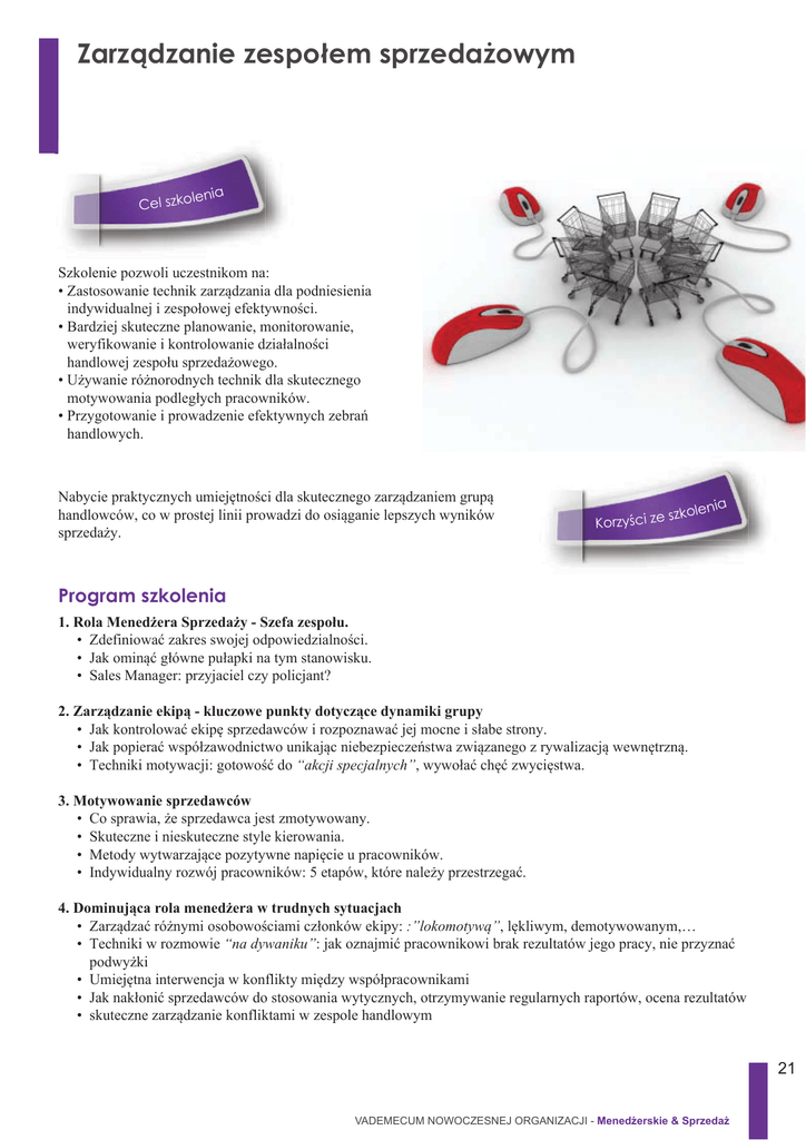 Zarządzanie zespołem sprzedażowym Cel szko lenia Szkolenie pozwoli uczestnikom na: • Zastosowanie technik zarządzania dla podniesienia • indywidualnej i zespołowej efektywności. • Bardziej skuteczne planowanie, monitorowanie, • weryfikowanie i kontrolowanie działalności • handlowej zespołu sprzedażowego. • Używanie różnorodnych technik dla skutecznego • motywowania podległych pracowników. • Przygotowanie i prowadzenie efektywnych zebrań • handlowych. Nabycie praktycznych umiejętności dla skutecznego zarządzaniem grupą handlowców, co w prostej linii prowadzi do osiąganie lepszych wyników sprzedaży. Korzyści ze szkole nia Program szkolenia 1. Rola Menedżera Sprzedaży - Szefa zespołu. • Zdefiniować zakres swojej odpowiedzialności. • Jak ominąć główne pułapki na tym stanowisku. • Sales Manager: przyjaciel czy policjant? 2. Zarządzanie ekipą - kluczowe punkty dotyczące dynamiki grupy • Jak kontrolować ekipę sprzedawców i rozpoznawać jej mocne i słabe strony. • Jak popierać współzawodnictwo unikając niebezpieczeństwa związanego z rywalizacją wewnętrzną. • Techniki motywacji: gotowość do “akcji specjalnych”, wywołać chęć zwycięstwa. 3. Motywowanie sprzedawców • Co sprawia, że sprzedawca jest zmotywowany. • Skuteczne i nieskuteczne style kierowania. • Metody wytwarzające pozytywne napięcie u pracowników. • Indywidualny rozwój pracowników: 5 etapów, które należy przestrzegać. 4. Dominująca rola menedżera w trudnych sytuacjach • Zarządzać różnymi osobowościami członków ekipy: :”lokomotywą”, lękliwym, demotywowanym,… • Techniki w rozmowie “na dywaniku”: jak oznajmić pracownikowi brak rezultatów jego pracy, nie przyznać • podwyżki • Umiejętna interwencja w konflikty między współpracownikami • Jak nakłonić sprzedawców do stosowania wytycznych, otrzymywanie regularnych raportów, ocena rezultatów • skuteczne zarządzanie konfliktami w zespole handlowym 21 VADEMECUM NOWOCZESNEJ ORGANIZACJI - Menedżerskie & Sprzedaż 5. Systemy motywacyjne (premiowe) w pracy Sales Manager’a: • zasada działania systemów motywacyjnych • wady i zalety systemów motywacyjnych • cele firmy a cele (ilościowe, zadaniowe,…) dla zespołu handlowego • rentowność biznesu a systemy motywacyjne • systemy motywacyjne a poziom motywacji handlowców • „targety”, czyli cele na konkretnego handlowca • cele jakościowe dla handlowców 6. Rekrutacja, integracja, podwyższanie kompetencji • Główne zalecenia jak prowadzić rozmowę rekrutacyjną. • Najważniejsze etapy w integracji nowego sprzedawcy, podstawowe przyczyny porażki. 7. Prowadzenie efektywnych zebrań handlowych 8. 10 reguł prowadzenia efektywnych zebrań handlowych 9. Asystowanie handlowcom w sprzedaży w terenie - double visits 10. Ścieżki kariery dla handlowców – obowiązkowe zasady 11. Wdrażanie do pracy nowego handlowca - obowiązkowe zasady 12. W jaki sposób zwalniać nieodpowiednich pracowników? Główne zasady 13. Empowerment w pracy Sales Manager’a 14. Blue Ocean Strategy w pracy Sales Manager’a 15. Przywództwo sytuacyjne menedżera sprzedaży • Informacja zwrotna, czyli feedback, jako skuteczne narzędzie zarządzania. • Konstruktywna krytyka - zasady tworzenia oraz lista korzyści. • Asertywność i Empatia - dwa żywiołu na usługach menedżera sprzedaży. • Asertywne zachowanie w relacjach szef Podwładny = silny zespół. ki echni Metody,t eniowe ,narzędzia szk ol logia Metodo i a s zkolen • • • • • • • • • • • • • Ćwiczenia, rozwiązywanie realnych sytuacji, konkretnych problemów uczestników szkolenia przez nich samych z pomocą trenera (ćwiczenia te są realizowane indywidualnie, w parach, w grupach) Dyskusje moderowane Feedback trenera (komentarze, oceny, naprowadzanie na optymalne rozwiązania = facylitacja, sugestie rozwiązań) Analiza studiów przypadków (case study’s) Odgrywanie ról - scenki + video feedback (na życzenie klienta) Interaktywne mini wykłady (do 20% czasu szkolenia) Indywidualne prace nad rozwojem kompetencji w określonych obszarach Testy i kwestionariusze (uczestnicy dowiedzą się więcej na swój temat) Gry i zabawy szkoleniowe („energizer’s”) Szkolenie to ma charakter interaktywny, gdyż w procesie uczenia się oraz zdobywania konkretnych umiejętności, w równym stopniu angażują wszystkich uczestników. W czasie szkolenia tworzymy narzędzia dla uczestników, poruszając się w obszarach: D pozyskiwania i utrwalania wiedzy D zdobywania nowych umiejętności D rzeczywistej refleksji nad naszymi postawami, które są „matrycami” D naszego sukcesu. Powyższy program szkolenia jest autorskim programem trenera/partnera Centrum Edukacji i Biznesu. Wszystkie materiały chronione są prawami autorskimi ich autorów i właścicieli. Kopiowanie, modyfikowanie oraz transmitowanie elektronicznie lub w inny sposób, powielanie, wykorzystywanie i dystrybucja zawartych tu materiałów dozwolona jest wyłącznie za zgodą właściciela. 22 VADEMECUM NOWOCZESNEJ ORGANIZACJI - Menedżerskie & Sprzedaż