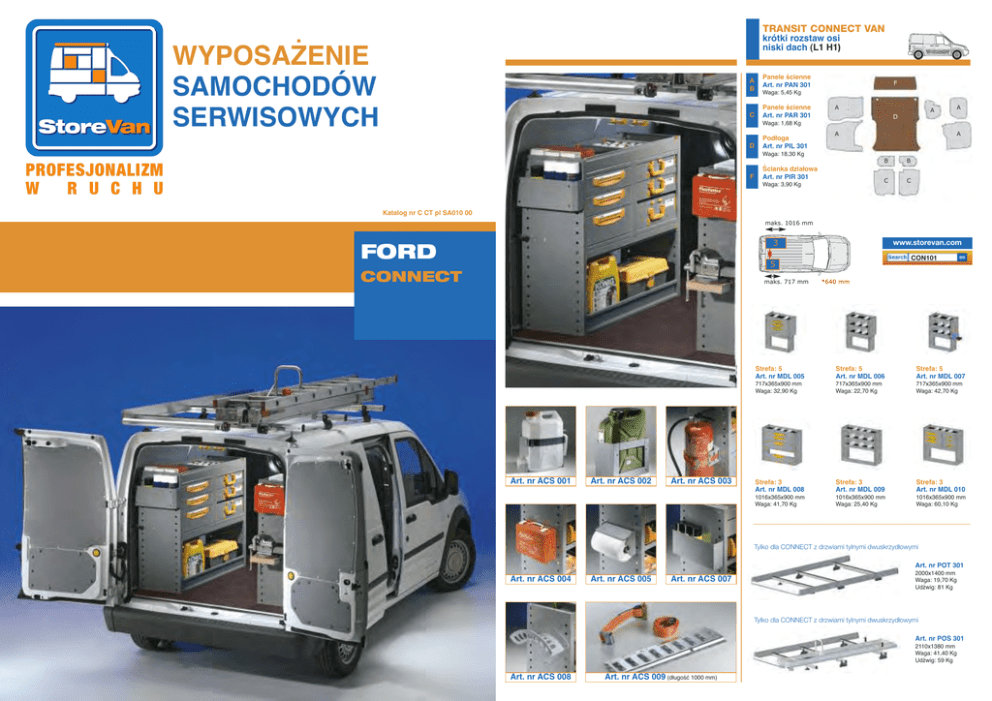WYPOSAŻENIE SAMOCHODÓW SERWISOWYCH krótki rozstaw osi niski dach (L1 H1) TRANSIT CONNECT VAN A B C D PROFESJONALIZM W R U C H U F Katalog nr C CT pl SA010 00 Panele ścienne Art. nr PAN 301 Waga: 5,45 Kg F Panele ścienne Art. nr PAR 301 A Podłoga Art. nr PIL 301 A Waga: 1,68 Kg Waga: 18,30 Kg Ścianka działowa Art. nr PIR 301 Waga: 3,90 Kg A D A A B B C C maks. 1016 mm 3 FORD www.storevan.com 5 CONNECT maks. 717 mm Art. nr ACS 002 Art. nr ACS 003 *640 mm Strefa: 5 Art. nr MDL 005 Strefa: 5 Art. nr MDL 006 Strefa: 5 Art. nr MDL 007 Strefa: 3 Art. nr MDL 008 Strefa: 3 Art. nr MDL 009 Strefa: 3 Art. nr MDL 010 717x365x900 mm Waga: 32,90 Kg Art. nr ACS 001 CON101 1016x365x900 mm Waga: 41,70 Kg 717x365x900 mm Waga: 22,70 Kg 1016x365x900 mm Waga: 25,40 Kg 717x365x900 mm Waga: 42,70 Kg 1016x365x900 mm Waga: 60,10 Kg Tylko dla CONNECT z drzwiami tylnymi dwuskrzydłowymi Art. nr ACS 004 Art. nr ACS 005 Art. nr ACS 007 Art. nr POT 301 2000x1400 mm Waga: 19,70 Kg Udźwig: 81 Kg Tylko dla CONNECT z drzwiami tylnymi dwuskrzydłowymi Art. nr POS 301 Art. nr ACS 008 Art. nr ACS 009 (długość 1000 mm) 2110x1380 mm Waga: 41,40 Kg Udźwig: 59 Kg krótki rozstaw osi niski dach (L1 H1) krótki rozstaw osi niski dach (L1 H1) TRANSIT CONNECT VAN TRANSIT CONNECT VAN PODWÓJNA PODŁOGA Z SZUFLADAMI I WYSUWANY REGAŁ PODWÓJNA PODŁOGA Z SZUFLADAMI I WYSUWANY REGAŁ Wysuwany regał Art. nr PEV 301 Regał z trzema półkami na wysuwanym stelażu, do montażu na podwyższanej podłodze Wymiary: 1234x455x860 mm (szer. x dł. x wys.) Waga: 49,00 Kg Zestaw składa się z: 1 wysuwany stelaż z udźwigiem 100 kg przy wysunięciu 50% lub 75 kg przy wysunięciu 70% 1 szafka: trzy półki z regulowanymi przegródkami i matą ochronną WYSUWANY STELAŻ Z REGAŁEM przeznaczony jest do montażu na podwyższanej podłodze Zestaw podwyższanej podłogi z szufladami Art. nr MPR 301 Wymiary: 1470x1613x267 mm (szer. x dł. x wys.) Waga: 98,00 Kg W skład zestawu wchodzą: 1 podłoga ze sklejki 12 mm, warstwa ochronna 2 stelaże na szuflady dostępne z tyłu auta, z czterema szufladami o wymiarach wewnętrznych: 447x600x86 mm 1 stelaż na szufladę dostępną z boku auta, z jedną głęboką szufladą o wymiarach wewnętrznych: 323x447x186 mm ZESTAW PODWYŻSZANEJ PODŁOGI Z SZUFLADAMI pasuje do Forda Connecta z przesuwanymi drzwiami bocznymi, z pełną ścianką działową. Wysuwany regał i szuflady otwierane na zewnątrz samochodu pozwalają na łatwiejszy dostęp, lepszą organizację i oszczędność czasu Szuflady o wysokości wewnętrznej 86 mm, wyposażone w: 12 pojemników z tworzywa 150x150x71 mm 24 pojemniki z tworzywa 75x150x71 mm Szuflada dostępna przez przesuwane drzwi boczne Szuflada o wysokości wewnętrznej 186 mm, wyposażona w: 1 przegródka wzdłuż szuflady Szuflady o wysokości wewnętrznej 86 mm, wyposażone w: 5 uniwersalnych przegródek na narzędzia krótki rozstaw osi niski dach (L1 H1) TRANSIT CONNECT VAN 990 mm WYSUWANE REGAŁY I PLATOFRMY Wysuwana platforma ładunkowa Art. nr PEO 301 Wymiary: 1080x1524x80 mm (szer. x dł. x wys.) Waga: 71,45 Kg Zestaw składa się z: 1 płyta ze sklejki pokrytej warstwą ochronną z otworami montażowymi 1 mechanizm wysuwanej platformy: rama oparta na prowadnicach, wysuwająca się do 60% z udźwigiem 300 Kg 8 uchwytów do do pasów do mocowania ładunku 2 pasy do mocowania ładunki Wysuwana platforma ułatwia załadunek i rozładunek wielkogabarytowych przedmiotów, pozwalając jednocześnie na bezpieczny ich transport dzięki solidnemu systemowi mocowania Wysuwany regał Art. nr PEV 302 Regał zamocowany na stelażu wysuwanym na zewnątrz samochodu Wymiary: 1234x355x1110 mm (szer. x dł. x wys.) Waga: 55,90 Kg W skład zestawu wchodzą: 1 wysuwany stelaż z udźwigiem 100 kg przy wysunięciu 50% lub 75 kg przy wysunięciu 70% 1 szafka: cztery półki z regulowanymi przegródkami i matą ochronną WYSUWANY REGAŁ NA STELAŻU Może być zamontowany jedynie w obecności dodatkowej podłogi ze sklejki takiej jak np. art. nr PIL 301. Wysuwany regał pozwala na łatwiejszy dostęp do materiałów zgromadzonych na półkach www.storevan.com dłuższy rozstaw osi podwyższany dach (L2 H2) Dzięki nam Twój FORD TRANSIT CONNECT VAN C D F Panele ścienne Art. nr PAN 302 F Waga: 8,10 Kg Panele ścienne Art. nr PAR 302 A Waga: 2,05 Kg Podłoga Art. nr PIL 302 A Waga: 21,00 Kg A A Ścianka działowa Art. nr PIR 301 Waga: 3,90 Kg A D A A D B B C C A Opis kodów produktów: Art. nr PAN: Komplet paneli ściennych z tworzywa na: - lewą ścianę furgonu - prawą ścianę furgonu i drzwi boczne - dolna część drzwi tylnych maks. 1524 mm 3 Art. nr PAR: Komplet paneli ściennych z tworzywa na: 2 5 maks. 717 mm Art. nr PIL: www.storevan.com CON202 Art. nr PIR: *640 mm - górna część drzwi tylnych Podłoga ze sklejki 12 mm pokryta warstwą ochronną z otworami na oryginalne mocowania ładunku. Panel ochronny na ściankę działową (sklejka 12 mm). 2 3 5 1524 Art. nr POT: Bagażnik dachowy składa się z: 2 MDL 04 Belka montażowa wymagana do montażu nadstawki MDL 042 - aluminiowe listwy poprzeczne z uchwytami i gumowymi osłonami - aluminiowe listwy boczne - aluminiowa rolka ułatwiająca załadunek - w zestawie komplet śrub ze stali nierdzewnej 717 MDL 041 8 L 00 MD Art. nr SFM 200 Art. nr POS: Bagażnik dachowy do przewożenia drabiny: 8 50 Belka w strefie 3+2 Wymiary: 2000x30x35 mm Waga: 1,88 Kg 16 10 SFM 200 - aluminiowe listwy poprzeczne z uchwytami i gumowymi osłonami - aluminiowa listwa boczna - aluminiowa rolka ułatwiająca załadunek - mechanizm do transport drabiny - w zestawie komplet śrub ze stali nierdzewnej MDL 007 Przykład zabudowy lewa strona Przykład zabudowy prawa strona Art. nr MDL005 Szafka składa się z: - półka z przegródkami i matą ochronną - szuflady 2x100 mm - półka z drzwiczkami uchylanymi Strefa: 2 Art. nr MDL 040 508x365x900 mm Waga: 16,93 Kg Strefa: 2 Art. nr MDL 041 508x365x900 mm Waga: 18,85 Kg Strefa: 5 Art. nr MDL 005 717x365x