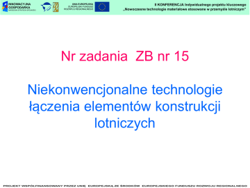 INNOWACYJNA GOSPODARKA NARODOWA STRATEGIA SPÓJNOŚCI UNIA EUROPEJSKA EUROPEJSKI FUNDUSZ ROZWPJU REGIONALNEGO II KONFERENCJA Indywidualnego projektu kluczowego „Nowoczesne technologie materiałowe stosowane w przemyśle lotniczym” Nr zadania ZB nr 15 Niekonwencjonalne technologie łączenia elementów konstrukcji lotniczych PROJEKT WSPÓŁFINANSOWANY PRZEZ UNIĘ EUROPEJSKĄ ZE ŚRODKÓW EUROPEJSKIEGO FUNDUSZU ROZWOJU REGIONAL NEGO INNOWACYJNA GOSPODARKA NARODOWA STRATEGIA SPÓJNOŚCI UNIA EUROPEJSKA EUROPEJSKI FUNDUSZ ROZWPJU REGIONALNEGO Partnerzy - ZB 15 1) Politechnika Lubelska - prof. dr hab. inż. Tomasz Sadowski 2) Politechnika Rzeszowska - dr hab. inż. Jarosław Sęp, prof. PRz 3) Politechnika Częstochowska - dr inż. Piotr Lacki 4) Instytut Maszyn Przepływowych PAN (Gdańsk) - prof. dr hab. inż. Piotr Doerffer INNOWACYJNA GOSPODARKA NARODOWA STRATEGIA SPÓJNOŚCI UNIA EUROPEJSKA EUROPEJSKI FUNDUSZ ROZWPJU REGIONALNEGO II KONFERENCJA Indywidualnego projektu kluczowego „Nowoczesne technologie materiałowe stosowane w przemyśle lotniczym” 1. Przedstawienie głównych wniosków z wykonanych zadań badawczych, 2. Propozycje rozwiązań technologicznych Przeprowadzona analiza literatury wskazuje, że współcześnie prowadzone są badania mające na celu doskonalenie wszystkich technologii stosowanych w konstrukcjach lotniczych. W przypadku połączeń spawanych doskonalenie jest ukierunkowane na: - poszukiwanie optymalnych rozwiązań konstrukcyjnych spoin, - dobór najodpowiedniejszych sposobów obróbki cieplnej - modyfikacje technologii wykonywania spoin - poszukiwanie możliwości łączenia przy wykorzystaniu tej technologii różnych materiałów (przykładowo metali i kompozytów. Doskonalenie połączeń lutowanych jest ukierunkowane na: - poszukiwanie nowych stopów lutowniczych, które będą pozwalały na efektywne łączenie różnorodnych materiałów (w tym metali i kompozytów). - badania nad obróbką cieplną i rozwiązaniami konstrukcyjnymi złączy poprawiającymi ich wytrzymałość. PROJEKT WSPÓŁFINANSOWANY PRZEZ UNIĘ EUROPEJSKĄ ZE ŚRODKÓW EUROPEJSKIEGO FUNDUSZU ROZWOJU REGIONAL NEGO INNOWACYJNA GOSPODARKA NARODOWA STRATEGIA SPÓJNOŚCI UNIA EUROPEJSKA EUROPEJSKI FUNDUSZ ROZWPJU REGIONALNEGO Badania zmierzające do doskonalenia połączeń klejowych są ukierunkowane na: - modyfikowanie klejów, - poszukiwanie nowych sposobów przygotowania powierzchni klejonych elementów, - określenia wpływu różnorodnych czynników środowiskowych na trwałość połączenia, - ocenę właściwości połączeń klejowych materiałów kompozytowych. Doskonalenie połączeń zgrzewanych jest ukierunkowane na poszukiwanie możliwości łączenia różnych materiałów (w tym metalicznych z kompozytowymi); połączenia takie są możliwe dzięki wprowadzaniu pomiędzy łączone elementy dodatkowych materiałów. Analiza literatury wskazuje, że nowoczesne technologie to połączenia HYBRYDOWE np. łączenie różnych materiałów, nitowo-klejowe, śrubowoklejowe, spawane z klejeniem, zgrzewane z klejeniem, zaciśnięcie z klejeniem (clinch-adhesive joint). W konstrukcjach lotniczych obserwuje się również współcześnie tendencje do minimalizowania liczby połączeń części poprzez wykonywanie różnorodnymi technologiami części o bardzo złożonych kształtach. INNOWACYJNA GOSPODARKA UNIA EUROPEJSKA EUROPEJSKI FUNDUSZ ROZWPJU REGIONALNEGO NARODOWA STRATEGIA SPÓJNOŚCI miedź Połączenia nitowe w konstrukcjach lotniczych aluminium lub duraluminium Nowa koncepcja nitu dwuczęściowego Zgłoszenie patentowe pt. „Nit dwustronny”, nr P - 387468, z dnia 11.03.2009r trzpieo: tuleja: duraluminium duraluminium miedź miedź aluminium miedź Eksperymentalne wyniki swobodnego zakuwania nitów dwuczęściowych wykonanych z różnych materiałów Wnioski z badao eksperymentalnych Zamykanie nitów dwuczęściowych polega na spęczaniu trzonów, bez odkształceo plastycznych łbów. Proces zakuwania można w znacznym stopniu kontrolowad dobierając optymalne długości trzonów nitów składowych i zakrzywienie zewnętrznej powierzchni trzonu tulejowego. Nie na ograniczeo w doborze materiału na elementy składowe nitu dwuczęściowego. Nity te mogą byd wykonywane ze wszystkich plastycznych materiałów metalicznych. Nit dwuczęściowy może byd stosowany do łączenia różnych metali (np. stali ze stopami aluminium) oraz metali z niemetalami (np. stop aluminium z kompozytem o osnowie polimerowej lub metalicznej). Zastosowania nitu w konstrukcjach lotniczych mogą napotkad ograniczenia w doborze materiałów wynikające ze specyficznych uwarunkowao technicznych stosowanych w lotnictwie (stosunek wagi do wytrzymałości, wytrzymałośd zmęczeniowa, odpornośd na korozję i inne). Ten sposób nitowania może byd szczególnie przydatny do łączenia kruchego laminatu na osnowie polimerowej z ciągliwym metalem. Kształt łba i rodzaj materiału nitu po stronie laminatu może byd inny niż nitu po stronie metalu. Określenie przydatności i zakresu zastosowao tego typu łączników będzie efektem dalszych badao. INNOWACYJNA GOSPODARKA NARODOWA STRATEGIA SPÓJNOŚCI UNIA EUROPEJSKA EUROPEJSKI FUNDUSZ ROZWPJU REGIONALNEGO Połączenia śrubowe w konstrukcjach lotniczych Materiały współcześnie stosowane: • stale stopowe żarowytrzymałe, • stale stopowe odporne na korozję • stopy na bazie niklu • stopy na bazie kobaltu i niklu • stopy na bazie tytanu • stopy metali kolorowych (miedzi i cynku) • stopy aluminium Zastosowania: • połączenie centropłata ze skrzydłem doczepnym samolotu PZL M28 SKYTRUCK, • mocowanie silnika do ramy samolotu • mocowanie wirnika śmigłowca Wnioski: • są to połączenia ‘wysokowytrzymałe’ lub ‘wysokoobciążone’ • konieczność zastosowania materiałów na bazie niklu i tytanu • optymalizacja połączeń – zaproponowanie rozwiązań alternatywnych INNOWACYJNA GOSPODARKA NARODOWA STRATEGIA SPÓ