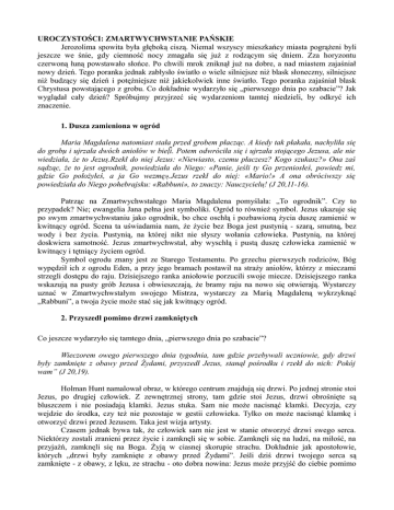 UROCZYSTOŚCI: ZMARTWYCHWSTANIE PAŃSKIE Jerozolima spowita była głęboką ciszą. Niemal wszyscy mieszkańcy miasta pogrążeni byli jeszcze we śnie, gdy ciemność nocy zmagała się już z rodzącym się dniem. Zza horyzontu czerwoną łuną powstawało słońce. Po chwili mrok zniknął już na dobre, a nad miastem zajaśniał nowy dzień. Tego poranka jednak zabłysło światło o wiele silniejsze niż blask słoneczny, silniejsze niż budzący się dzień i potężniejsze niż jakiekolwiek inne światło. Tego poranka zajaśniał blask Chrystusa powstającego z grobu. Co dokładnie wydarzyło się „pierwszego dnia po szabacie”? Jak wyglądał cały dzień? Spróbujmy przyjrzeć się wydarzeniom tamtej niedzieli, by odkryć ich znaczenie. 1. Dusza zamieniona w ogród Maria Magdalena natomiast stała przed grobem płacząc. A kiedy tak płakała, nachyliła się do grobu i ujrzała dwóch aniołów w bieli. Potem odwróciła się i ujrzała stojącego Jezusa, ale nie wiedziała, że to Jezus.Rzekł do niej Jezus: «Niewiasto, czemu płaczesz? Kogo szukasz?» Ona zaś sądząc, że to jest ogrodnik, powiedziała do Niego: «Panie, jeśli ty Go przeniosłeś, powiedz mi, gdzie Go położyłeś, a ja Go wezmę».Jezus rzekł do niej: «Mario!» A ona obróciwszy się powiedziała do Niego pohebrajsku: «Rabbuni», to znaczy: Nauczycielu! (J 20,11-16). Patrząc na Zmartwychwstałego Maria Magdalena pomyślała: „To ogrodnik”. Czy to przypadek? Nie; ewangelia Jana pełna jest symboliki. Ogród to również symbol. Jezus ukazuje się po swym zmartwychwstaniu jako ogrodnik, bo chce oschłą i pozbawioną życia duszę zamienić w kwitnący ogród. Scena ta uświadamia nam, że życie bez Boga jest pustynią - szarą, smutną, bez wody i bez życia. Pustynią, na której nikt nie słyszy wołania człowieka. Pustynią, na której doskwiera samotność. Jezus zmartwychwstał, aby wyschłą i pustą duszę człowieka zamienić w kwitnący i tętniący życiem ogród. Symbol ogrodu znany jest ze Starego Testamentu. Po grzechu pierwszych rodziców, Bóg wypędził ich z ogrodu Eden, a przy jego bramach postawił na straży aniołów, którzy z mieczami strzegli dostępu do raju. Dzisiejszego ranka aniołowie porzucili swoje miecze. Dzisiejszego ranka wskazują na pusty grób Jezusa i obwieszczają, że bramy raju na nowo się otwierają. Wystarczy uznać w Zmartwychwstałym swojego Mistrza, wystarczy za Marią Magdaleną wykrzyknąć „Rabbuni”, a twoja życie może stać się jak kwitnący ogród. 2. Przyszedł pomimo drzwi zamkniętych Co jeszcze wydarzyło się tamtego dnia, „pierwszego dnia po szabacie”? Wieczorem owego pierwszego dnia tygodnia, tam gdzie przebywali uczniowie, gdy drzwi były zamknięte z obawy przed Żydami, przyszedł Jezus, stanął pośrodku i rzekł do nich: Pokój wam” (J 20,19). Holman Hunt namalował obraz, w którego centrum znajdują się drzwi. Po jednej stronie stoi Jezus, po drugiej człowiek. Z zewnętrznej strony, tam gdzie stoi Jezus, drzwi obrośnięte są bluszczem i nie posiadają klamki. Jezus stuka. Sam nie może nacisnąć klamki. Decyzja, czy wejdzie do środka, czy też nie pozostaje w gestii człowieka. Tylko on może nacisnąć klamkę i otworzyć drzwi przed Jezusem. Taka jest wizja artysty. Czasem jednak bywa tak, że człowiek sam nie jest w stanie otworzyć drzwi swego serca. Niektórzy zostali zranieni przez życie i zamknęli się w sobie. Zamknęli się na ludzi, na miłość, na przyjaźń, zamknęli się na Boga. Żyją w ciasnej skorupie strachu. Dokładnie jak apostołowie, których „drzwi były zamknięte z obawy przed Żydami”. Jeśli dziś drzwi twojego serca są zamknięte - z obawy, z lęku, ze strachu - oto dobra nowina: Jezus może przyjść do ciebie pomimo drzwi zamkniętych. Może wejść w twoje serce z darem pokoju: „Pokój wam”. I może otworzyć te drzwi od wewnątrz, abyś znowu zaufał ludziom i Bogu, abyś uwierzył we własne siły i abyś cieszył się życiem. 3. Dar otwartych oczu I może uczynić coś jeszcze. Tego samego dnia dwaj z nich byli w drodze do wsi, zwanej Emaus, oddalonej sześćdziesiąt stadiów od Jerozolimy. Rozmawiali oni z sobą o tym wszystkim, co się wydarzyło. Gdy tak rozmawiali i rozprawiali z sobą, sam Jezus przybliżył się i szedł z nimi. Lecz oczy ich były niejako na uwięzi, tak że Go nie poznali... Tak przybliżyli się do wsi, do której zdążali, a On okazywał, jakoby miał iść dalej. Lecz przymusili Go, mówiąc: «Zostań z nami, gdyż ma się ku wieczorowi i dzień się już nachylił». Wszedł więc, aby zostać z nimi. Gdy zajął z nimi miejsce u stołu, wziął chleb, odmówił błogosławieństwo, połamał go i dawał im. Wtedy oczy im się otworzyły i poznali Go (Łk 24,13-31). Jezus przychodzi dziś do nas z niezwykłym darem - darem otwartych oczu. Niekiedy życie schodzi nam na marzeniach o tym, czego jeszcze nie mamy lub na opłakiwaniu tego, czego już nie mamy. Tymczasem dziś trzeba mieć oczy otwarte, dziś trzeba dostrzegać dobro i żyć pełnią życia. Przeszłości już nie ma. Nigdy do nas nie wróci. Możemy wyciągnąć z niej mądre wnioski i złożyć z ufnością w ręce Ojca niebieskiego. Przyszłości jeszcze nie ma i nie wiemy, co nam przyniesie. Przyjdzie do nas dopiero wtedy, gdy stanie się teraźniejszością. Liczy się chwila obecna. Liczy się teraz. Teraz trzeba mieć oczy szeroko otwarte, by dostrzegać w życiu to, co dobre, by dostrzegać Zmartwychwstałego w prostych rzeczach. Tak jak uczniowie rozpoznali Go po zwykłym łamaniu chleba. Dzisiejszego poranka zabłysło światło o wiele silniejsze niż tarcza słońca - zajaśniał blask Chrystusa powstałego z grobu. Powstał, aby pustynię duszy przemienić w żyjący ogród. Powstał, aby pomimo zamkniętych drzwi ludzkiego serca powiedzieć „pokój wam”. Powstał, aby udzielić nam daru otwartych oczu. Zamiast tradycyjnych życzeń, chciałbym pos