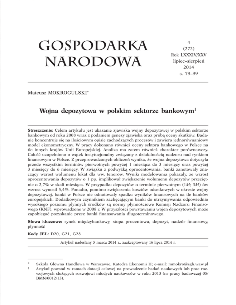 79 Mateusz Mokrogulski, Wojna depozytowa w polskim sektorze bankowym Gospodarka narodowa 4 (272) Rok LXXXIV/XXV lipiec–sierpień 2014 s. 79–99 Mateusz MOKROGULSKI* Wojna depozytowa w polskim sektorze bankowym1 Streszczenie: Celem artykułu jest ukazanie zjawiska wojny depozytowej w polskim sektorze bankowym od roku 2008 wraz z podaniem genezy zjawiska oraz próbą oceny skutków. Bada‑ nie koncentruje się na ilościowym opisie zachodzących procesów i zawiera jednorównaniowy model ekonometryczny. W pracy dokonano również oceny sektora bankowego w Polsce na tle innych krajów Unii Europejskiej. Analiza ma zatem również charakter porównawczy. Całość uzupełniono o wątek instytucjonalny związany z działalnością nadzoru nad rynkiem finansowym w Polsce. Z przeprowadzonych obliczeń wynika, że wojna depozytowa dotyczyła przede wszystkim terminów pierwotnych powyżej 1 miesiąca do 3 miesięcy oraz powyżej 3 miesięcy do 6 miesięcy. W związku z podwyżką oprocentowania, banki zanotowały zna‑ czący wzrost wolumenu lokat dla ww. tenorów. Wyniki modelowania pokazały, że wzrost oprocentowania depozytów o 1 pp. implikował zwiększenie wolumenu depozytów przecięt‑ nie o 2,7 % w skali miesiąca. W przypadku depozytów o terminie pierwotnym (1M; 3M 〉 ów wzrost wynosił 5,4 %. Ponadto, pomimo zwiększenia kosztów odsetkowych w okresie wojny depozytowej, banki w Polsce nie odnotowały spadku wyników finansowych na tle banków europejskich. Dodatkowym czynnikiem zachęcającym banki do utrzymywania odpowiednio wysokiego poziomu płynnych środków są normy płynnościowe Komisji Nadzoru Finanso‑ wego (KNF), wprowadzone w 2008 r. W przyszłości powstawaniu wojen depozytowych może zapobiegać pozyskanie przez banki finansowania długoterminowego. Słowa kluczowe: rynek międzybankowy, stopa procentowa, depozyt, nadzór finansowy, płynność Kody JEL: D20, G21, G28 Artykuł nadesłany 5 marca 2014 r., zaakceptowany 16 lipca 2014 r. * 1 Szkoła Główna Handlowa w Warszawie, Katedra Ekonomii II; e‑mail: [email protected] Artykuł powstał w ramach dotacji celowej na prowadzenie badań naukowych lub prac roz‑ wojowych służących rozwojowi młodych naukowców w roku 2013 (nr pracy badawczej 05/ BMN/0012/13). 80 GOSPODARKA NARODOWA nr 4/2014 Wstęp Celem artykułu jest przedstawienie zjawiska tzw. wojny depozytowej w sek‑ torze bankowym w Polsce od 2008 r. wraz z podaniem genezy zjawiska oraz próbą oceny skutków. Na początku pracy zawarto krótki przegląd badań na‑ ukowych dotyczących szeroko rozumianego zagadnienia płynności w bankach. Następnie znajduje się właściwy opis zjawiska wojny depozytowej. Analizowane są tu przyczyny, które mogły doprowadzić do znacznego wzrostu ceny pie‑ niądza w polskim sektorze bankowym, jak również wpływ zwiększenia opro‑ centowania depozytów na wybrane wskaźniki finansowe banków. Dodatkowo, w podsumowaniu tej części artykułu znajduje się analiza porównawcza wyni‑ ków polskiego sektora bankowego na tle pozostałych krajów Unii Europejskiej. W dalszej kolejności podjęto tematykę norm płynnościowych Komisji Nadzoru Finansowego (KNF), które miały znaczący wpływ na działania banków w za‑ kresie pozyskiwania środków pieniężnych. Artykuł kończą rozważania dotyczące finansowania długoterminowego, które obecnie stanowi wyzwanie dla banków w Polsce. Całość pracy ma charakter przede wszystkim empiryczny. Zagadnienia poruszane w artykule są ważne w procesie opisu czynników kształtujących poziom stóp procentowych w bankach. Te ostatnie przekładają się na popyt na kredyt, a także na podaż oszczędności w gospodarce, co poprzez mechanizmy mnożnikowe oddziałuje na sferę realną gospodarki. Jednocześnie badania nad płynnością w sektorze bankowym będą obecnie zyskiwać na zna‑ czeniu z uwagi na wprowadzane na poziomie unijnym normy płynnościowe. Konieczność ich stosowania będzie stanowiła istotny problem dla banków nie tylko w Polsce, które będą musiały przykładać większą wagę do zagadnienia zarządzania płynnością. Przegląd badań naukowych Literatura naukowa nie odnosi się wprost do badania samego zjawiska wojny depozytowej w sektorze bankowym. Zarówno badania ilościowe, jak i jakościowe w tym zakresie koncentrują się raczej na pokazaniu, jak waż‑ nym elementem działalności bankowej jest kwestia zapewnienia odpowied‑ niej ilości środków w celu regulowania zobowiązań. Zagadnienie szeroko ro‑ zumianej płynności jest trudne do skwantyfikowania, jako że na świecie nie istnieją wystandaryzowane miary płynności. Z tego powodu trudno również odpowiedzieć na pytanie o płynność całego sektora bankowego oraz ustalić, które z banków kreują najwięcej płynnych środków. Niemożliwym jest rów‑ nież określenie, w jaki sposób płynność przekłada się na inne zmienne ban‑ kowe, np. poziom kapitałów [Berger, Bouwman, 2009, s. 3780]. Jednocześnie banki, które umieją kreować płynność, cechują się również większą wartością firmy. Ponadto instytucje bankowe powinny utrzymywać odpowiednio wysoki poziom płynnych środków, jako że zazwyczaj występuje niedopasowanie akty‑ wów i pasywów pod względem terminów, a dodatkowo depozyty mogą zostać Mateusz Mokrogulski, Wojna depozytowa w polskim sektorze bankowym 81 nieoczekiwanie zerwane przez klientów. Ci ostatni wręcz uważają, że jedną z usług bankowych jest oferowanie płynnych środków (zarówno kredytów, jak i możliwości wcześniejszego zerwania depozytów) w sytuacji wystąpienia nie‑ przewidzianego zapotrzebowania na pieniądz. Dostosowując się do potrzeb klientów, banki muszą utrzymywać pewną wielkość środków płynnych, co po‑ woduje powstanie konkretnych kosztów [Kashyap i in., 2002, s. 35]. Co więcej, fakt finansowania niepłynnych aktywów za pomocą depozytów krótkookreso‑ wych naraża 