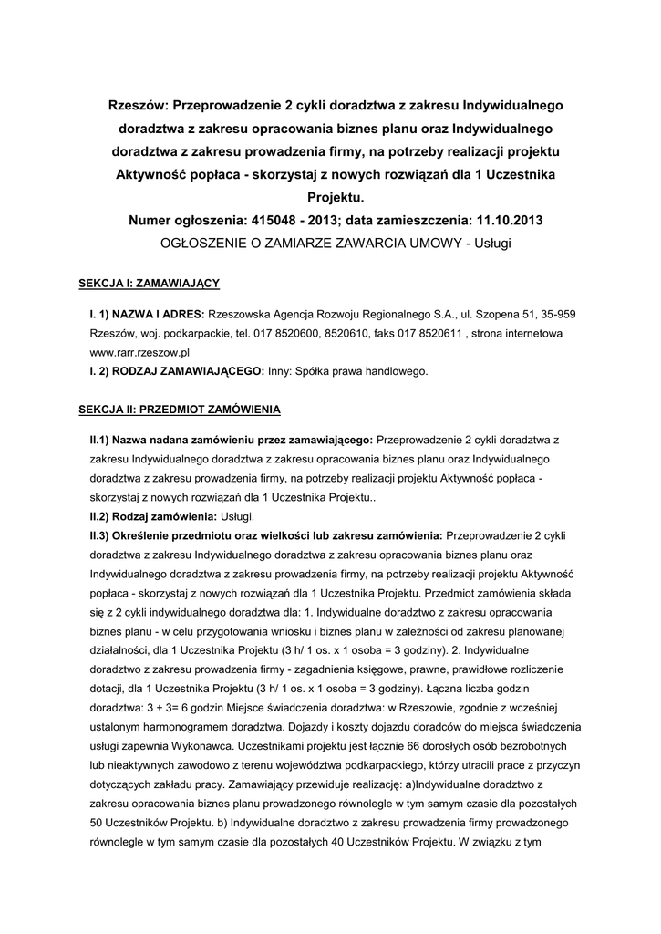 Rzeszów: Przeprowadzenie 2 cykli doradztwa z zakresu Indywidualnego doradztwa z zakresu opracowania biznes planu oraz Indywidualnego doradztwa z zakresu prowadzenia firmy, na potrzeby realizacji projektu Aktywność popłaca - skorzystaj z nowych rozwiązań dla 1 Uczestnika Projektu. Numer ogłoszenia: 415048 - 2013; data zamieszczenia: 11.10.2013 OGŁOSZENIE O ZAMIARZE ZAWARCIA UMOWY - Usługi SEKCJA I: ZAMAWIAJĄCY I. 1) NAZWA I ADRES: Rzeszowska Agencja Rozwoju Regionalnego S.A., ul. Szopena 51, 35-959 Rzeszów, woj. podkarpackie, tel. 017 8520600, 8520610, faks 017 8520611 , strona internetowa www.rarr.rzeszow.pl I. 2) RODZAJ ZAMAWIAJĄCEGO: Inny: Spółka prawa handlowego. SEKCJA II: PRZEDMIOT ZAMÓWIENIA II.1) Nazwa nadana zamówieniu przez zamawiającego: Przeprowadzenie 2 cykli doradztwa z zakresu Indywidualnego doradztwa z zakresu opracowania biznes planu oraz Indywidualnego doradztwa z zakresu prowadzenia firmy, na potrzeby realizacji projektu Aktywność popłaca skorzystaj z nowych rozwiązań dla 1 Uczestnika Projektu.. II.2) Rodzaj zamówienia: Usługi. II.3) Określenie przedmiotu oraz wielkości lub zakresu zamówienia: Przeprowadzenie 2 cykli doradztwa z zakresu Indywidualnego doradztwa z zakresu opracowania biznes planu oraz Indywidualnego doradztwa z zakresu prowadzenia firmy, na potrzeby realizacji projektu Aktywność popłaca - skorzystaj z nowych rozwiązań dla 1 Uczestnika Projektu. Przedmiot zamówienia składa się z 2 cykli indywidualnego doradztwa dla: 1. Indywidualne doradztwo z zakresu opracowania biznes planu - w celu przygotowania wniosku i biznes planu w zależności od zakresu planowanej działalności, dla 1 Uczestnika Projektu (3 h/ 1 os. x 1 osoba = 3 godziny). 2. Indywidualne doradztwo z zakresu prowadzenia firmy - zagadnienia księgowe, prawne, prawidłowe rozliczenie dotacji, dla 1 Uczestnika Projektu (3 h/ 1 os. x 1 osoba = 3 godziny). Łączna liczba godzin doradztwa: 3 + 3= 6 godzin Miejsce świadczenia doradztwa: w Rzeszowie, zgodnie z wcześniej ustalonym harmonogramem doradztwa. Dojazdy i koszty dojazdu doradców do miejsca świadczenia usługi zapewnia Wykonawca. Uczestnikami projektu jest łącznie 66 dorosłych osób bezrobotnych lub nieaktywnych zawodowo z terenu województwa podkarpackiego, którzy utracili prace z przyczyn dotyczących zakładu pracy. Zamawiający przewiduje realizację: a)Indywidualne doradztwo z zakresu opracowania biznes planu prowadzonego równolegle w tym samym czasie dla pozostałych 50 Uczestników Projektu. b) Indywidualne doradztwo z zakresu prowadzenia firmy prowadzonego równolegle w tym samym czasie dla pozostałych 40 Uczestników Projektu. W związku z tym Wykonawca będzie zobowiązany zapewnić kilku doradców do realizacji usługi doradczej, w zależności od rodzaju doradztwa, ilości Uczestników Projektu oraz terminu w którym usługa doradcza musi zostać zrealizowana. Szczegóły odnośnie ww. zależności opisane zostały w pkt. 4 Termin realizacji przedmiotu zamówienia. Uwagi ogólne: Godzina doradztwa: 60 min. Przedmiot zamówienia obejmuje w szczególności: organizację, obsługę techniczną, zapewnienie doradców, nadzór nad osobami prowadzącymi doradztwo, doradztwo merytoryczne z ww. zagadnień, zapewnienie miejsca w którym świadczone będzie doradztwo, przygotowanie i wydanie Karty Doradztwa oraz Indywidualnego Planu Działania dla każdego Uczestnika Projektu.. II.4) Wspólny Słownik Zamówień (CPV): 79.10.00.00-5, 79.14.00.00-7, 79.11.10.00-5, 72.22.10.00-0, 79.40.00.00-8, 79.41.00.00-1, 79.41.11.00-9, 79.41.20.00-5, 85.31.23.20-8. II.5) Szacunkowa wartość zamówienia (bez VAT): jest mniejsza niż kwoty określone w przepisach wydanych na podstawie art. 11 ust. 8 ustawy. SEKCJA III: PROCEDURA Tryb udzielenia zamówienia: Zamówienie z wolnej ręki 1. Podstawa prawna Postępowanie wszczęte zostało na podstawie art. 67 ust. 1 pkt 6 ustawy z dnia 29 stycznia 2004 r. – Prawo zamówień publicznych. 2. Uzasadnienie wyboru trybu Jest to zamówienie uzupełniające nr 1 do umowy nr RARR/BTP/917/2013 zawartej dnia 24.09.2013r. z Izabelą Łajs prowadzącą działalność gospodarczą pod firmą: AKADEMIA ZDROWIA Izabela Łajs, ul. Główna 81, 95-020 Justynów, w trybie przetargu nieograniczonego nr ZP 58/2013/BTP. Działając na podstawie art. 68 ust. 1 ustawy dnia 29 stycznia 2004 r. Prawo zamówień publicznych (tj. Dz. U. z 2013 r. poz. 907), Rzeszowska Agencja Rozwoju Regionalnego S.A. zaprosiła Izabelę Łajs prowadzącą działalność gospodarczą pod firmą: AKADEMIA ZDROWIA Izabela Łajs do przeprowadzenia negocjacji w sprawie udzielenia zamówienia publicznego w trybie z wolnej ręki na wykonanie zamówienia uzupełniającego nr 1 do umowy nr RARR/BTP/917/2013 zawartej w dniu 24.09.2013r. w wyniku postępowania prowadzonego w trybie przetargu nieograniczonego nr ZP 58/2013/BTP. Przedmiotowe zamówienie RARR S.A. zamierza zlecić w trybie z wolnej ręki jako zamówienie uzupełniające na podstawie art. 67 ust. 1 pkt 6) ustawy dnia 29 stycznia 2004 r. Prawo zamówień publicznych (tj. Dz. U. z 2013 r. poz. 907). Możliwość zlecenia zamówień uzupełniających była przewidziana w specyfikacji istotnych warunków zamówienia i w ogłoszeniu o zamówieniu w postępowaniu prowadzonym w trybie przetargu nieograniczonego nr ZP 58/2013/BTP. Niniejsze postępowanie jako zamówienie uzupełniające spełnia przesłanki udzielenia zamówień uzupełniających przewidzianych w ustawie Prawo zamówień publicznych i w specyfikacji istotnych warunków zamówienia. Wnioskiem z dnia 10.10.2013r. komórka organizacyjna RARR S.A. Biuro Terenowe w Przeworsku zwróciła się z wnioskiem o przeprowadzenie postępowania o udzielenie zamówienia publicznego w trybie z wolnej ręki jako zamówienie uzupełniające do przeprowadzonego wcześniej przetargu nieograniczonego nr ZP 58/2013/BTP . Potrzeba udzielenia zamówienia uzupełniającego powstała w wyniku zakwalifikowania do projektu 